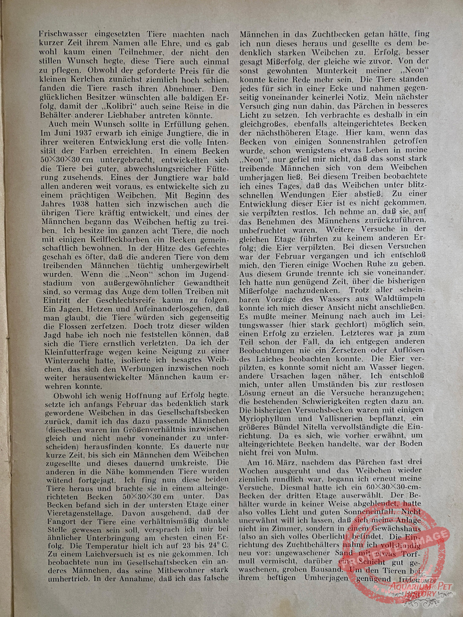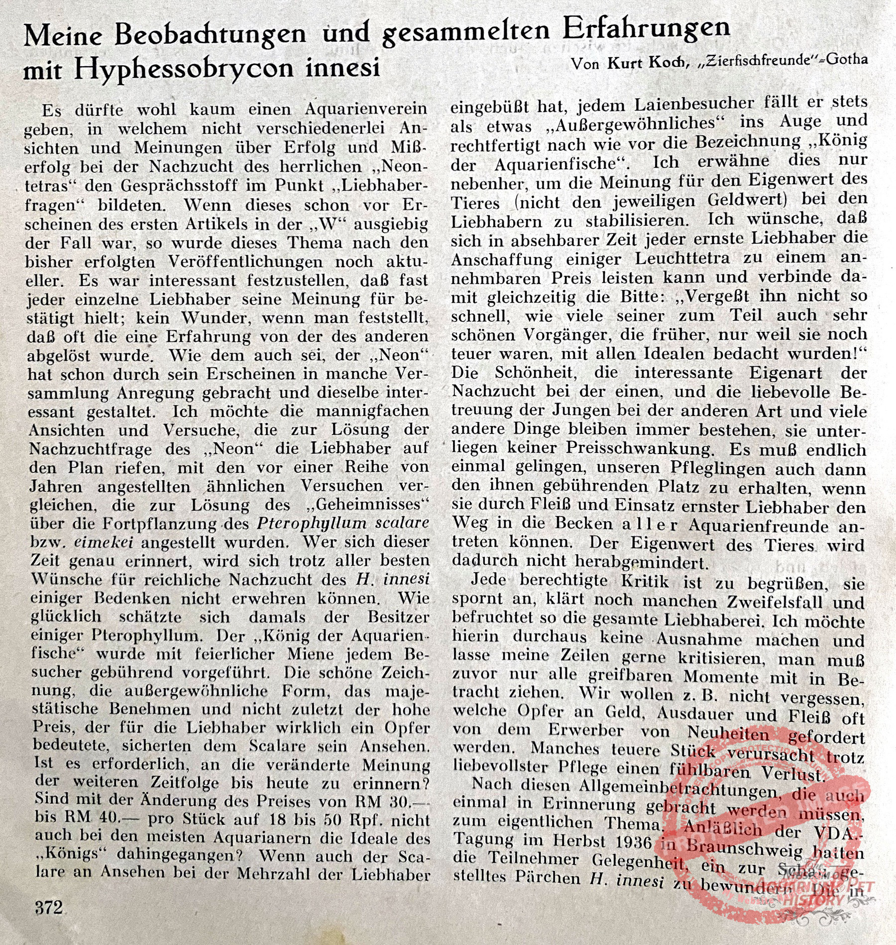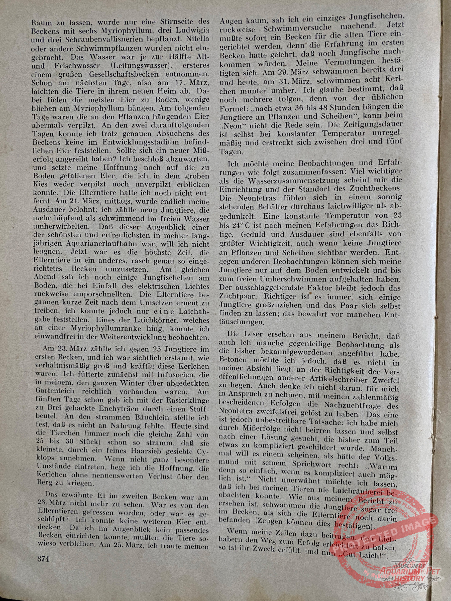 Kurt Koch’s 1934 article on the successful breeding of the Neon Tetra (Paracheirodon innesi) in Gotha’s soft water.