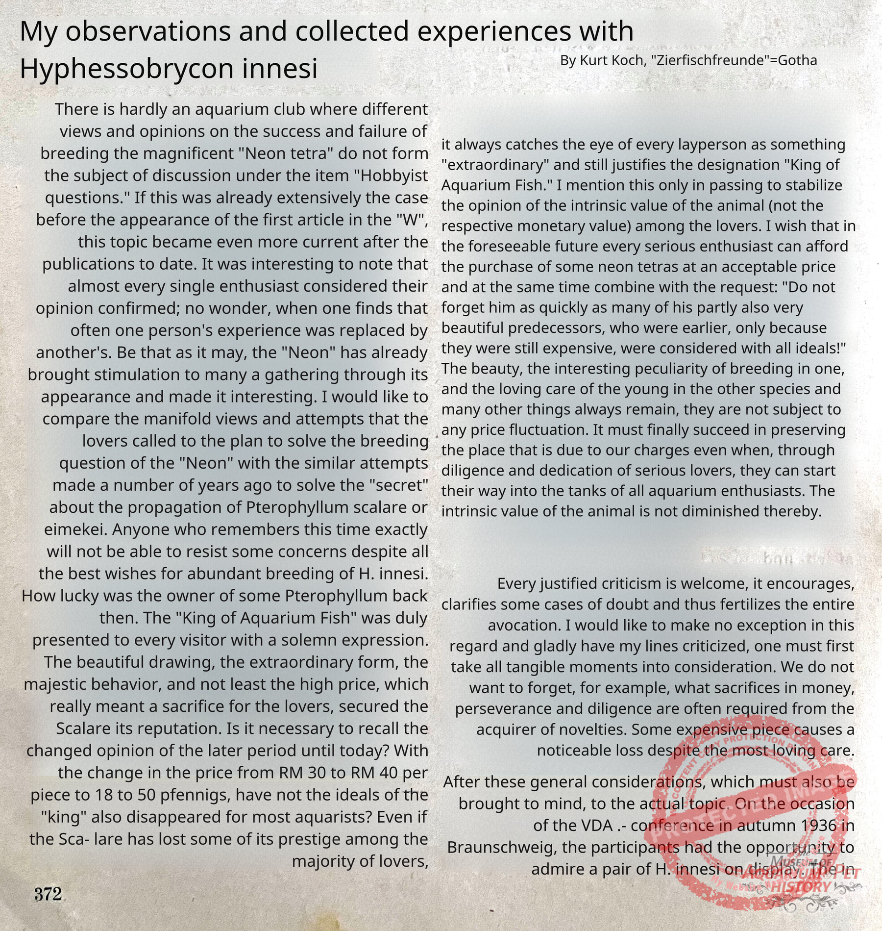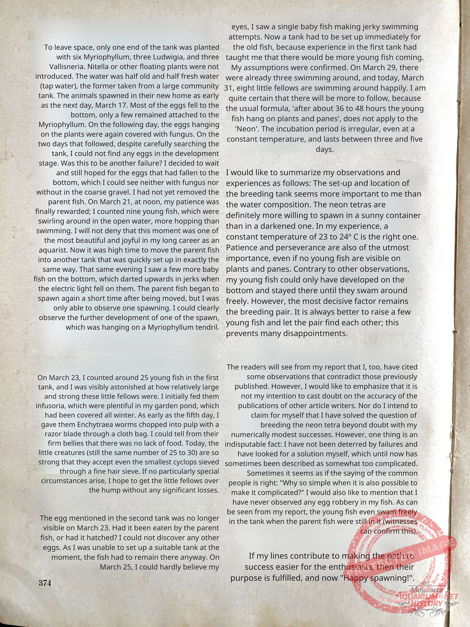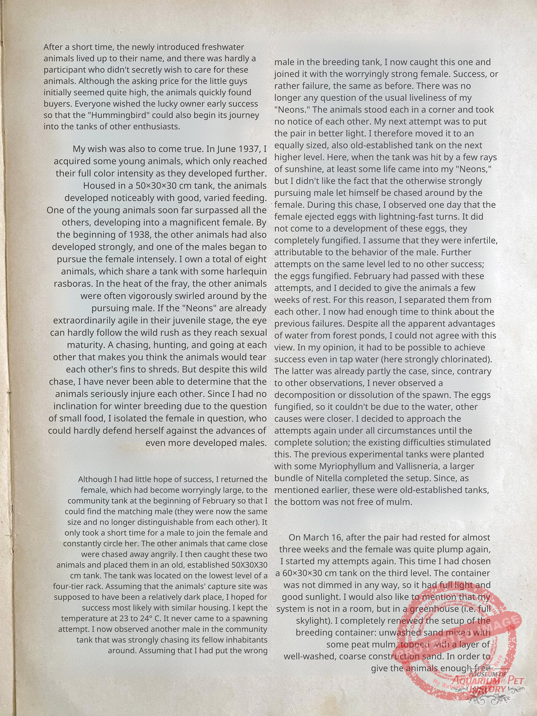 Kurt Koch’s 1934 article on the successful breeding of the Neon Tetra (Paracheirodon innesi) in Gotha’s soft water.