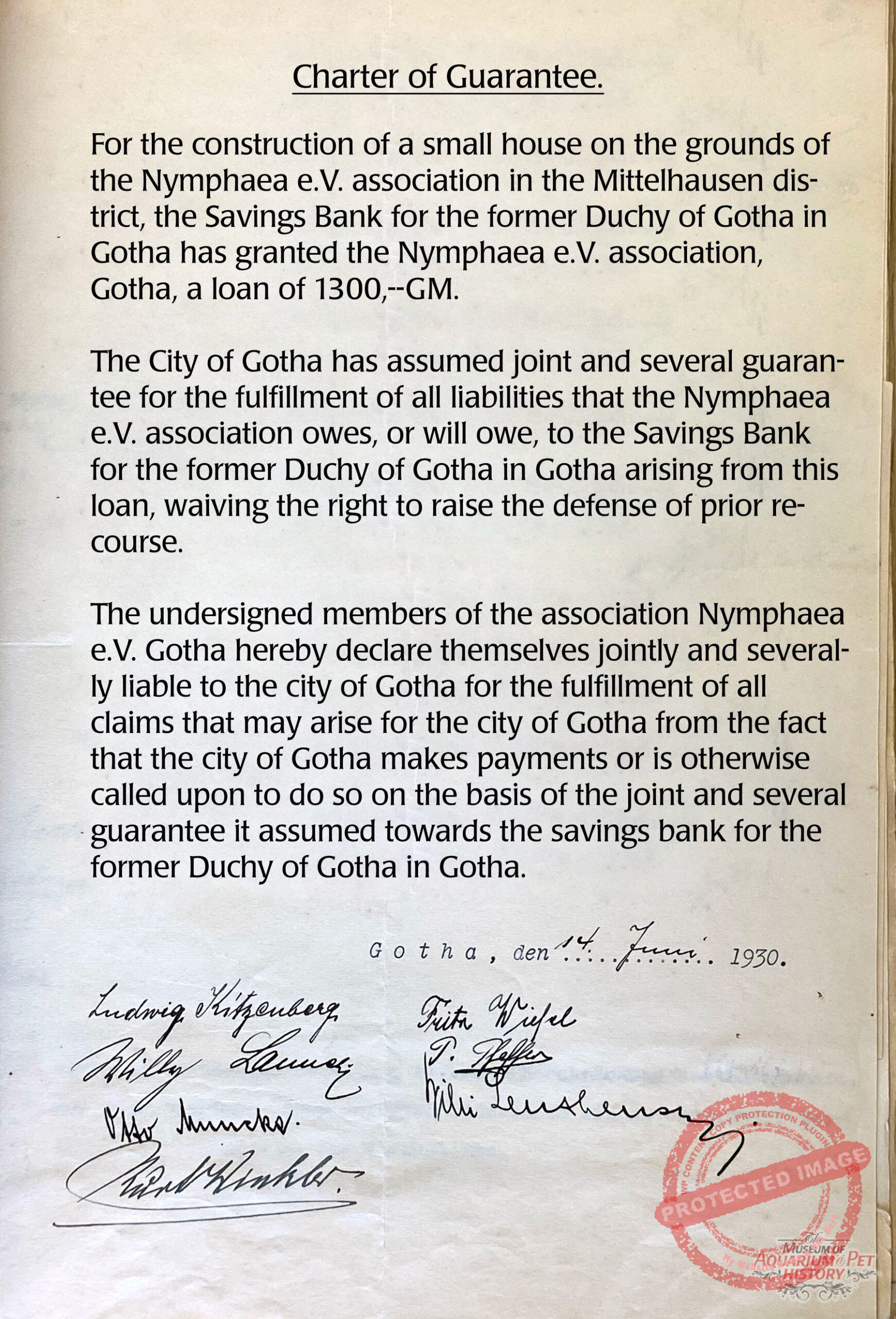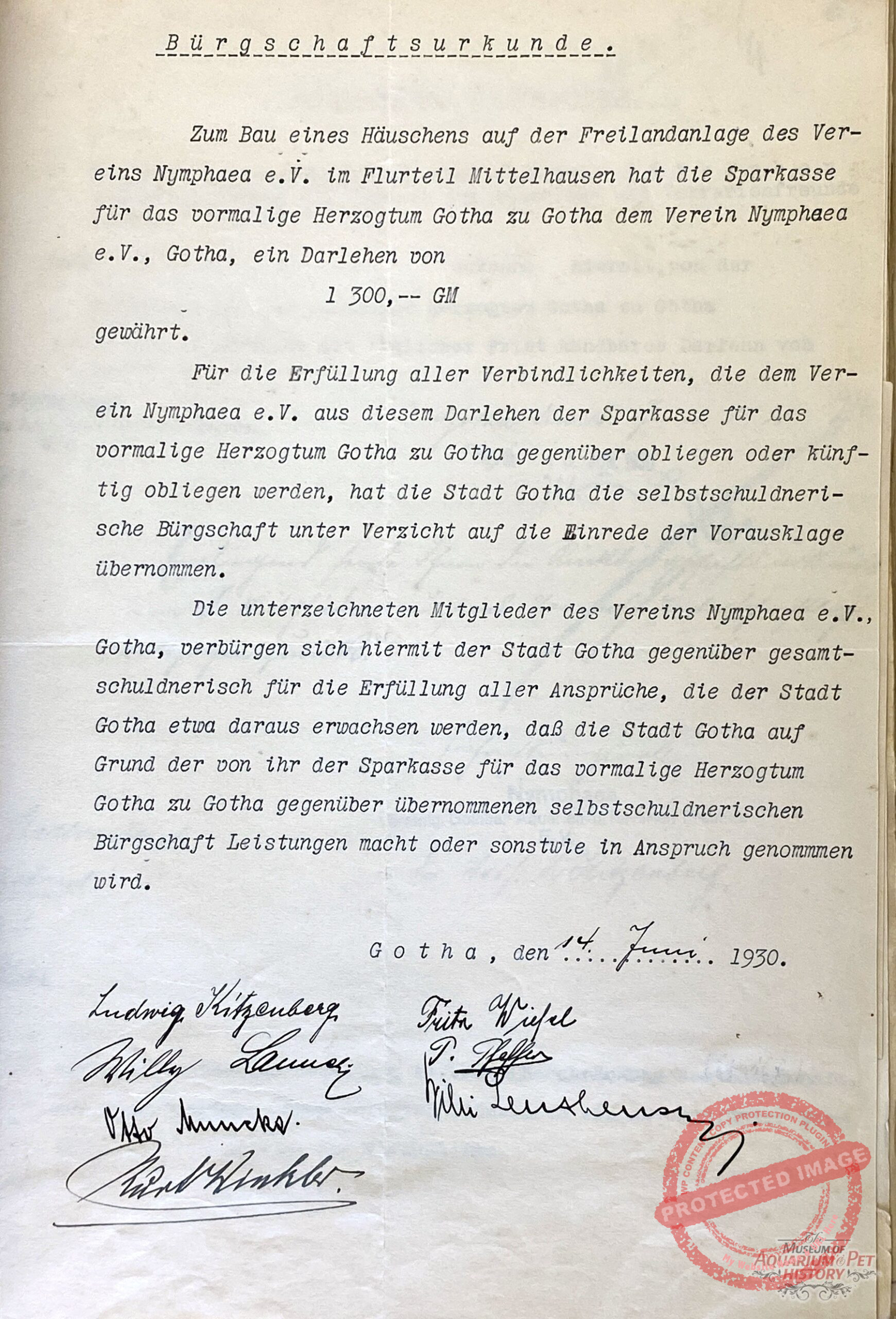 Surety provided by several Nymphaea club members for a 1930 loan from the Gotha savings bank to finance construction of the clubhouse.