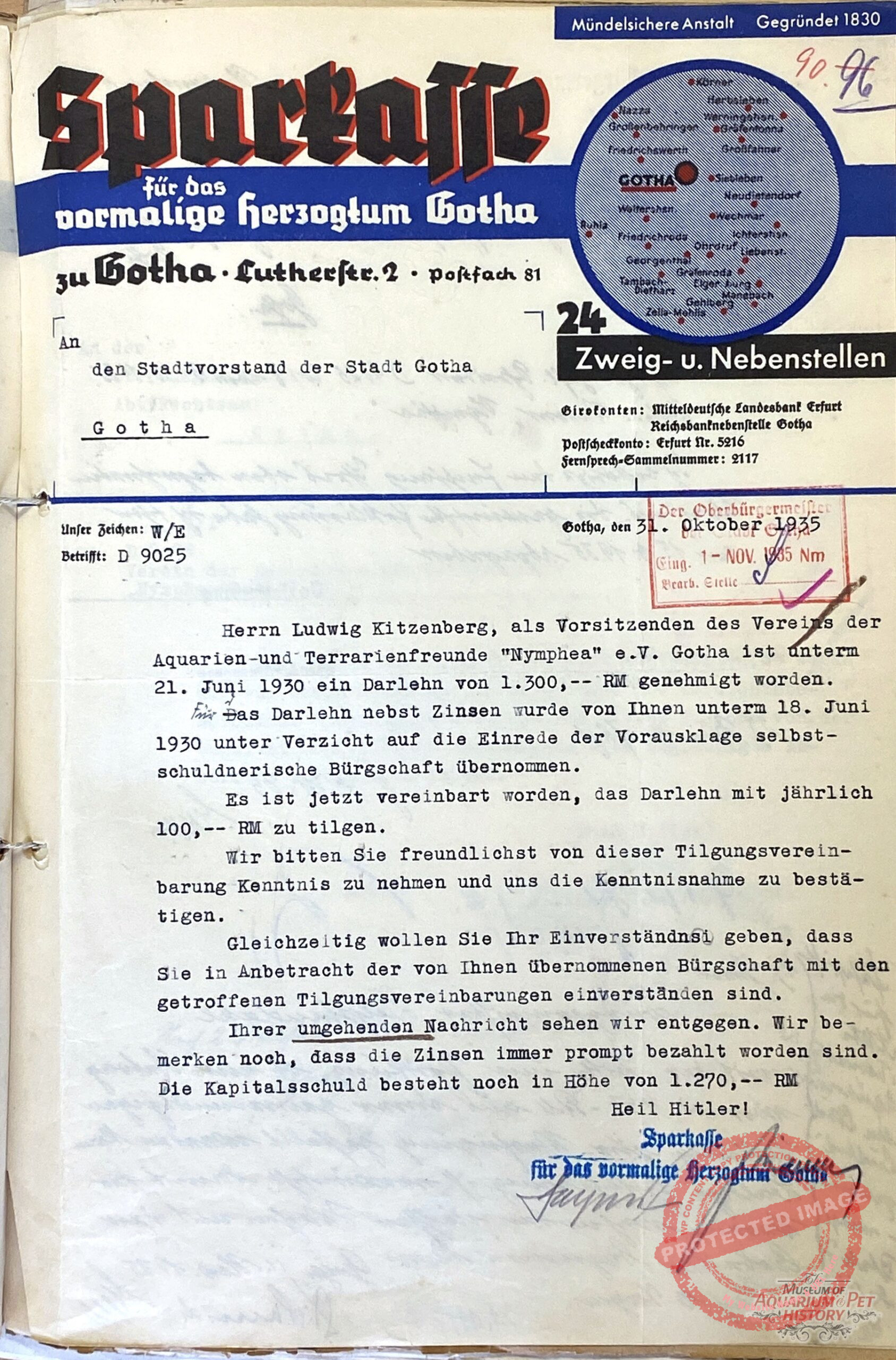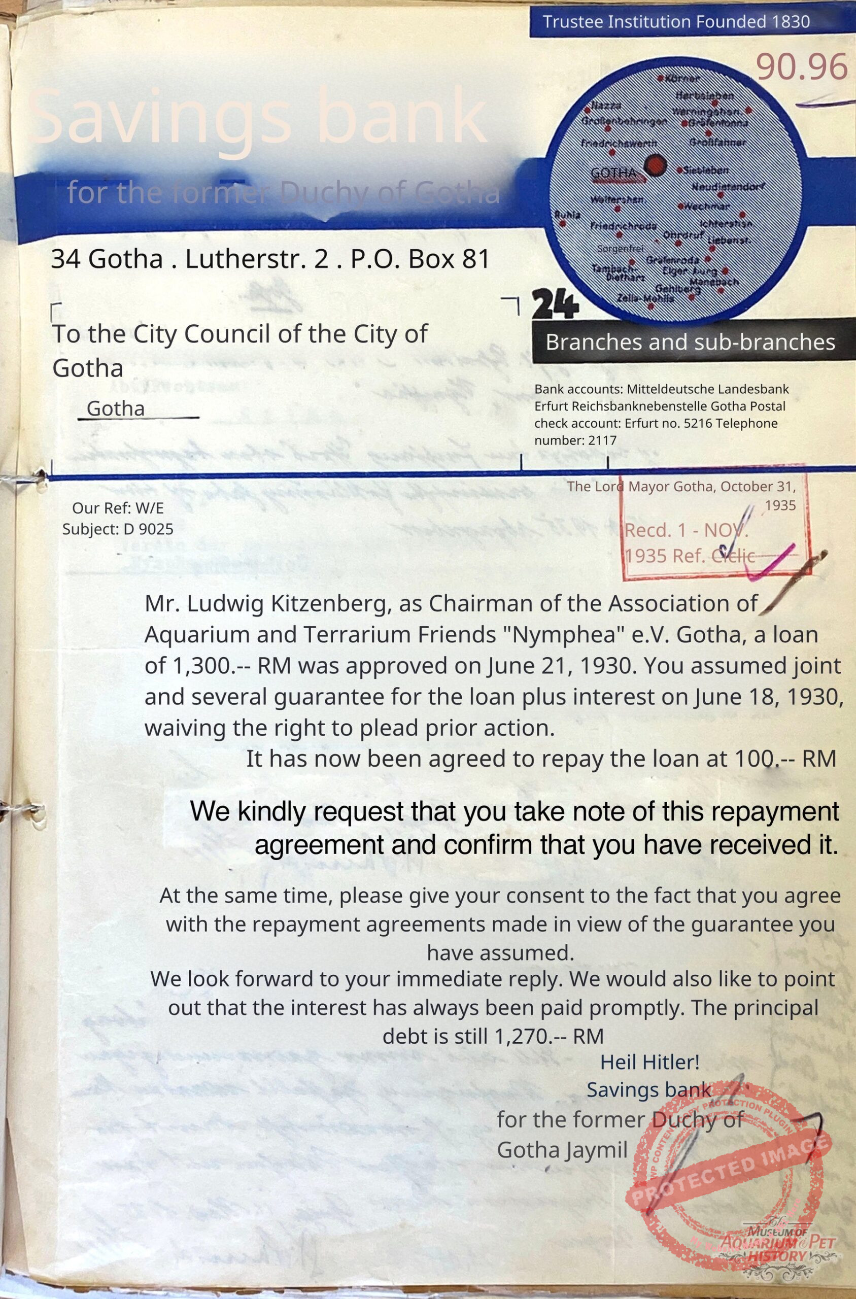 Some recovery of the Nymphaea club occurred from 1936. The war had not yet begun, and the remaining members tried to adapt to supervision and Gleichschaltung. My great-uncle Charly Fuchs took the lead in keeping the aquaristic hobby alive through club activities. Some problems had led to internal discussions. In 1930, the Gotha savings bank had granted a 1,300 Reichsmark loan for building the clubhouse, backed primarily by Chairman Ludwig Kitzenberg. A 1935 reminder demanded 1,270 Reichsmark. Through an installment proposal of 100 Reichsmark per year, the loan was to be repaid. Members increasingly tried to maintain the open-air facility at the Seven Ponds through their own work, while also repaying the bank loan through donations and contributions. Although Kitzenberg was still officially listed as chairman in documents, Charly Fuchs handled most practical matters and correspondence. His address (Riedweg 33—opposite the first open-air facility) always appeared in Wochenschrift club notices after Kitzenberg’s (Schäferstraße 24, near my Gotha residence at Schäferstraße 53).