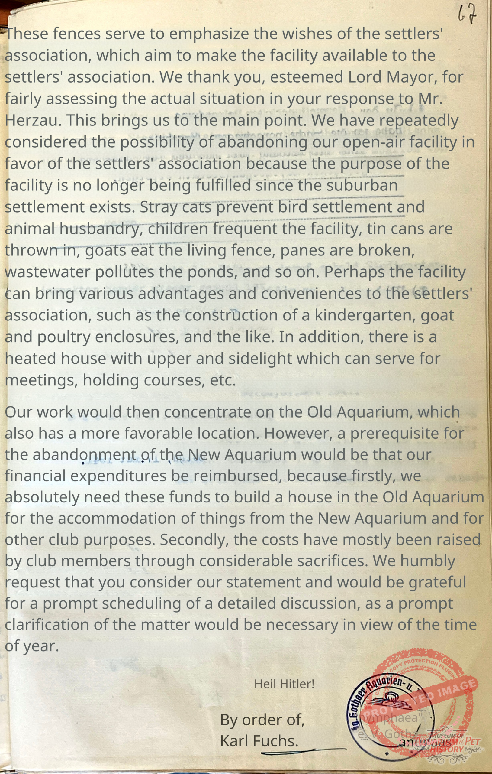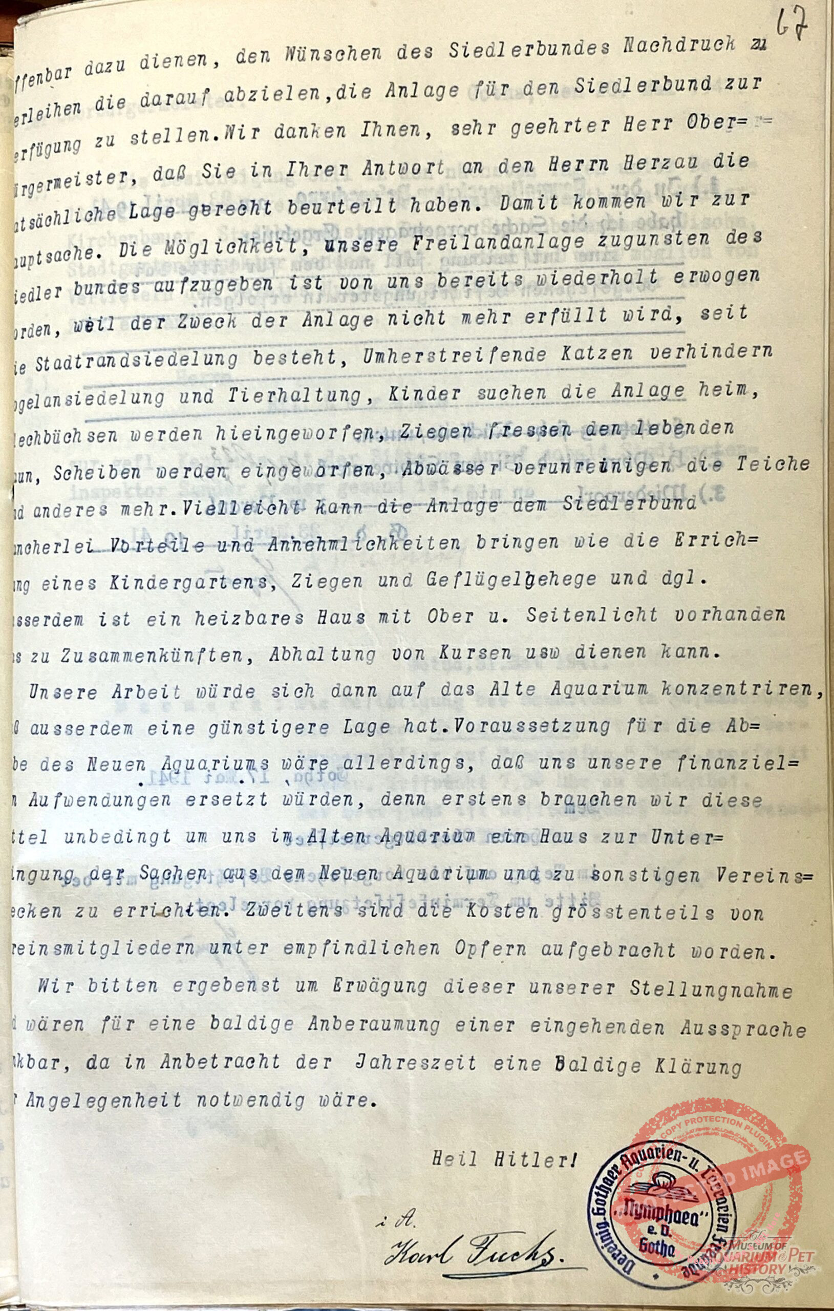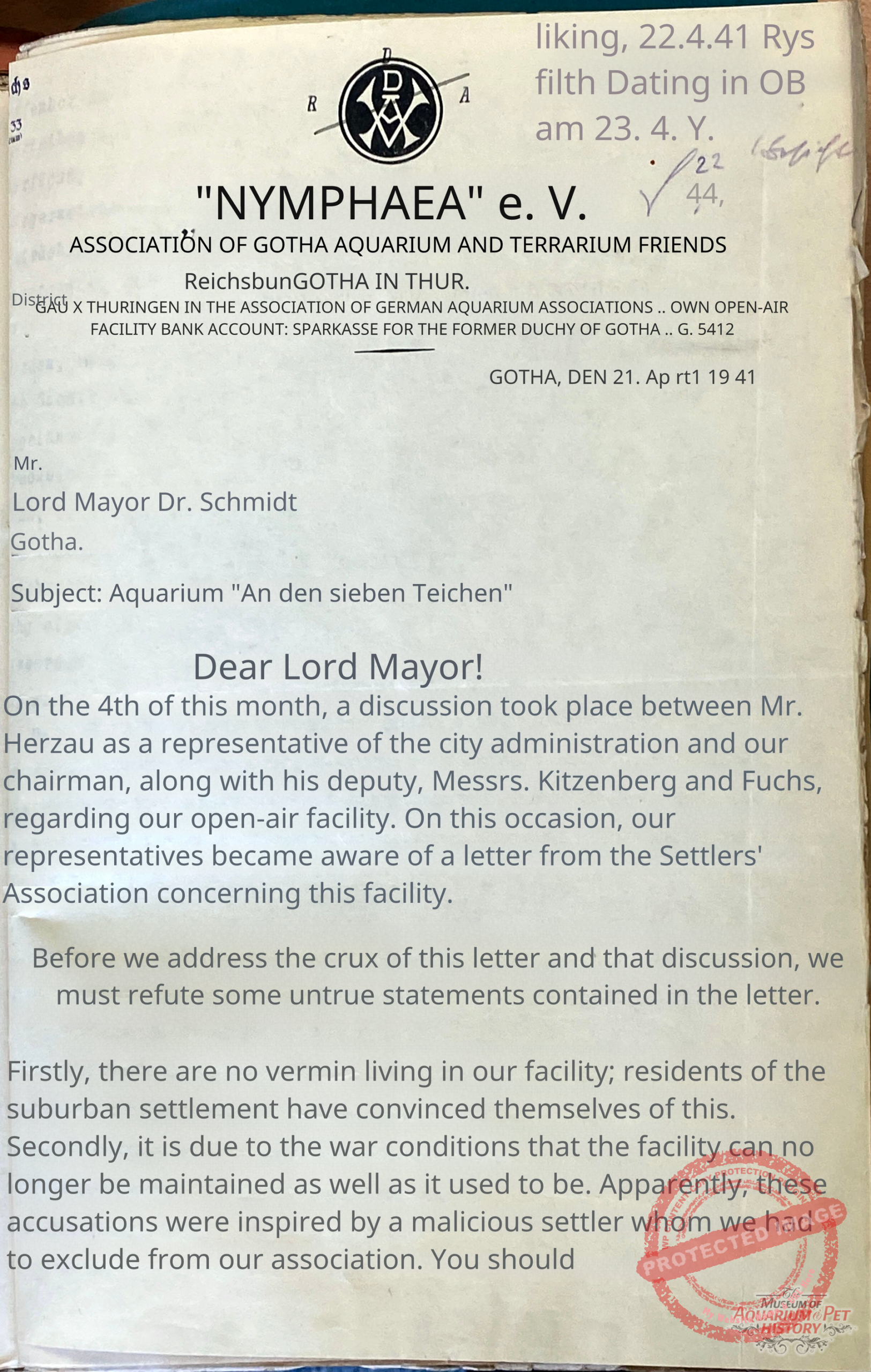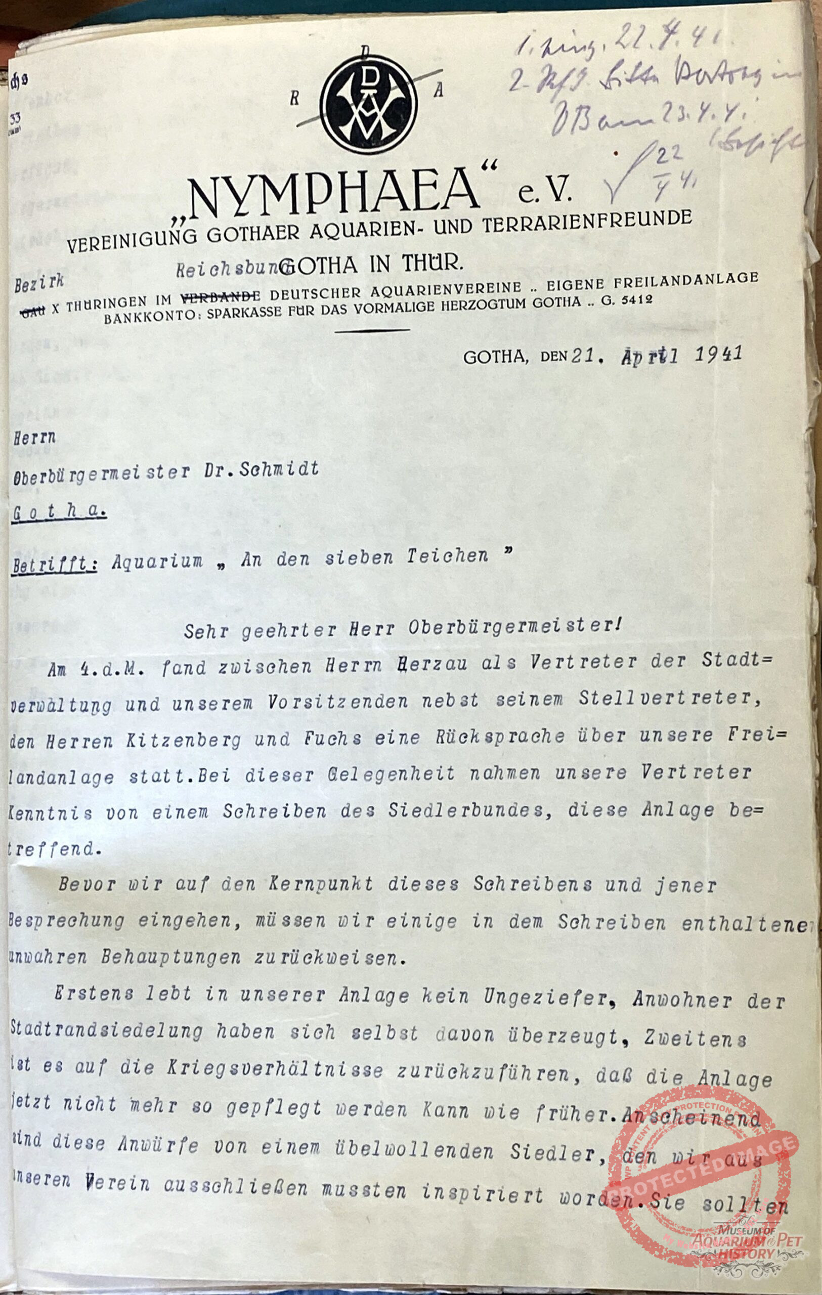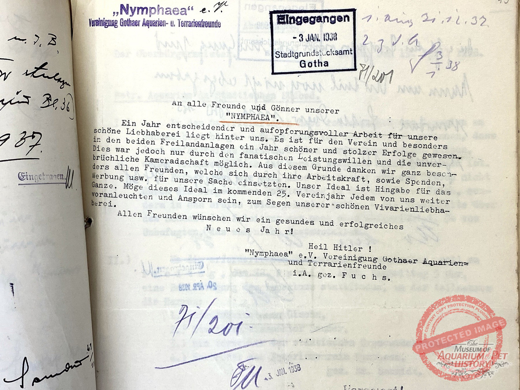 1939 marked the silver anniversary of the Nymphaea club. For the 25th anniversary, various Thüringen newspapers published articles, and Wochenschrift printed congratulations. A detailed, well-written article by Charly Fuchs appeared in Das Aquarium. Die Fachzeitschrift des Naturfreundes recounts the history under the title “Germany’s Oldest Open-Air Facility” since 1882. At the turn of 1938, he addressed supporters of the club with a greeting letter, warm and friendly in tone, which contrasted sharply with his “Heil Hitler!” signature. Fuchs acted opportunistically to solicit donations for the club, indifferent to the political statements and actions of the fascists, but recognizing the need to survive, especially when corresponding on behalf of a club. Once WWII began and the Nymphaea outdoor facility suffered due to insufficient manpower, Fuchs attempted to settle outstanding debts with the savings bank by proposing that the land and clubhouse be transferred to the nearby Settlers’ Association, which was interested in acquiring it and would take over the bank debts. Neither Fuchs nor other sources provided further information, presumably due to the war, and ultimately the conflict produced a different outcome. The goal of Nymphaea members, especially Fuchs, was to regain the original, debt-free oldest open-air facility from school administration control.