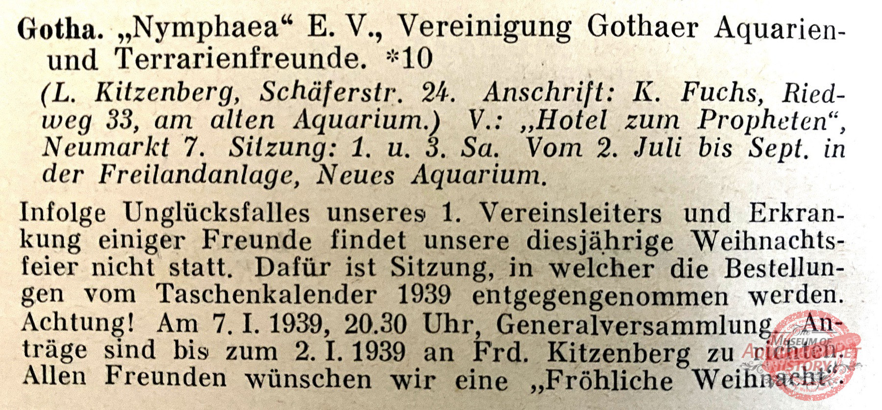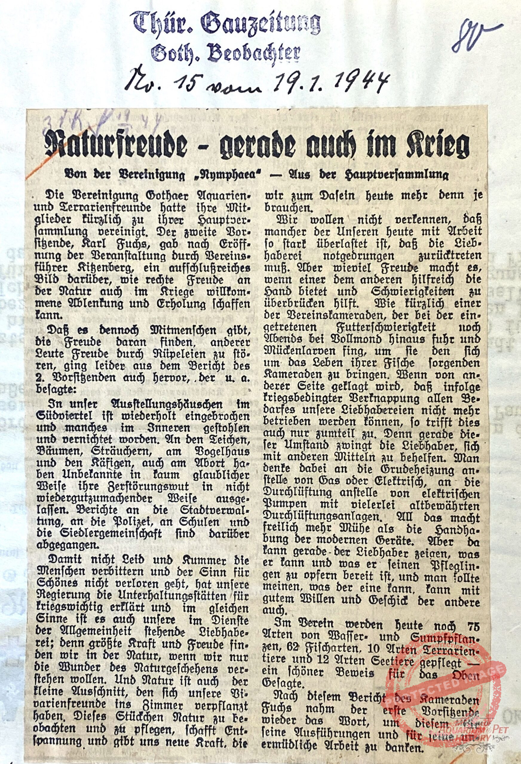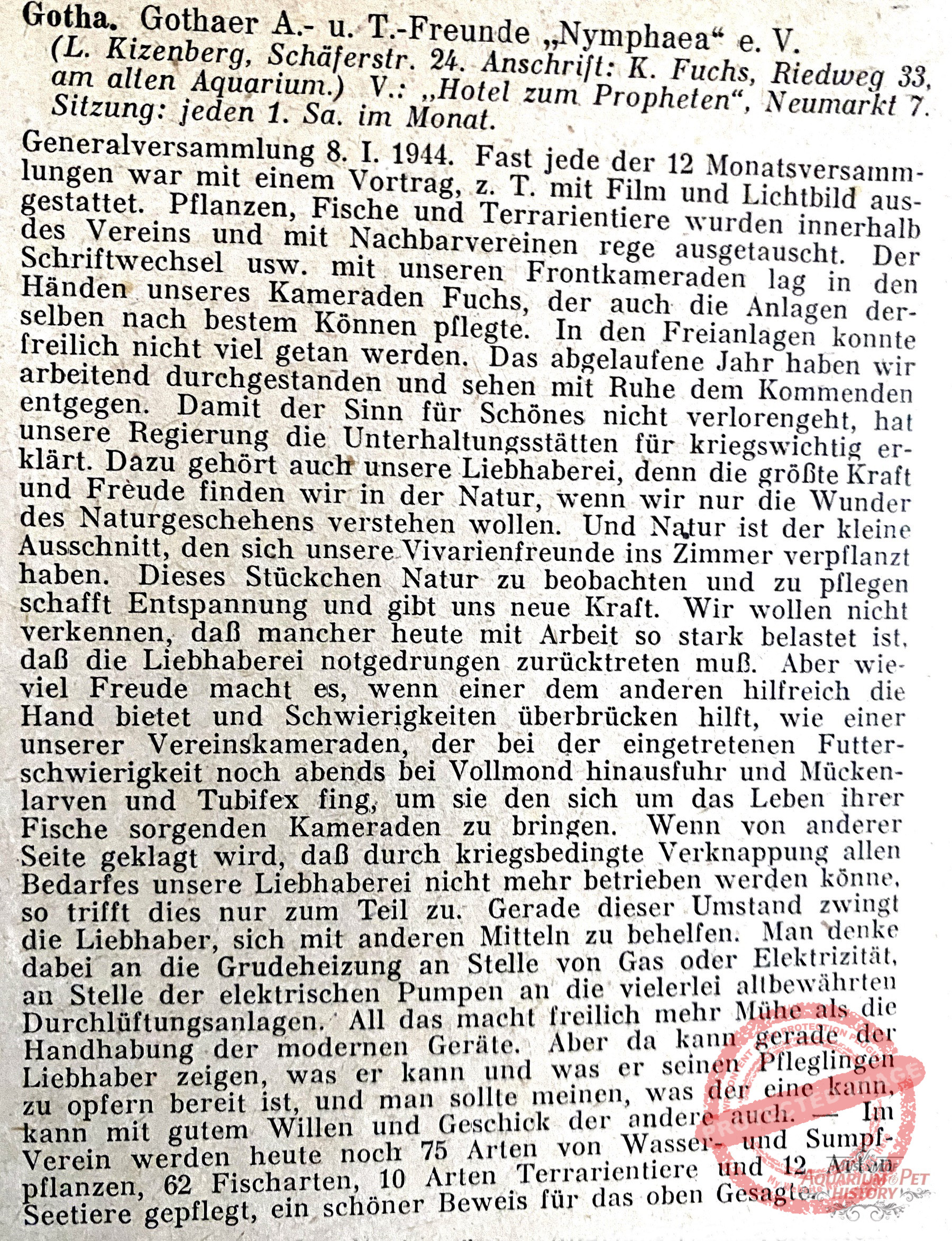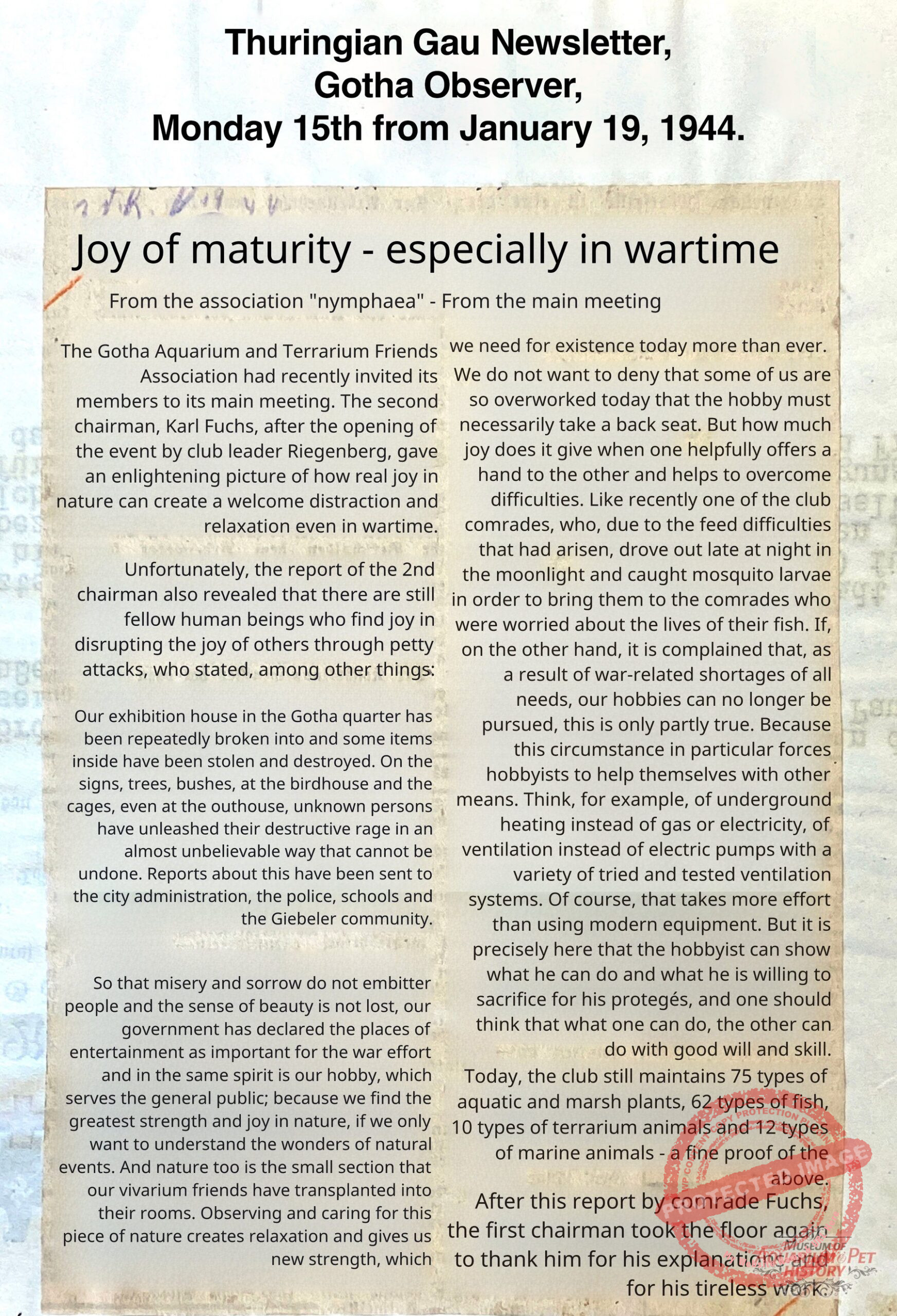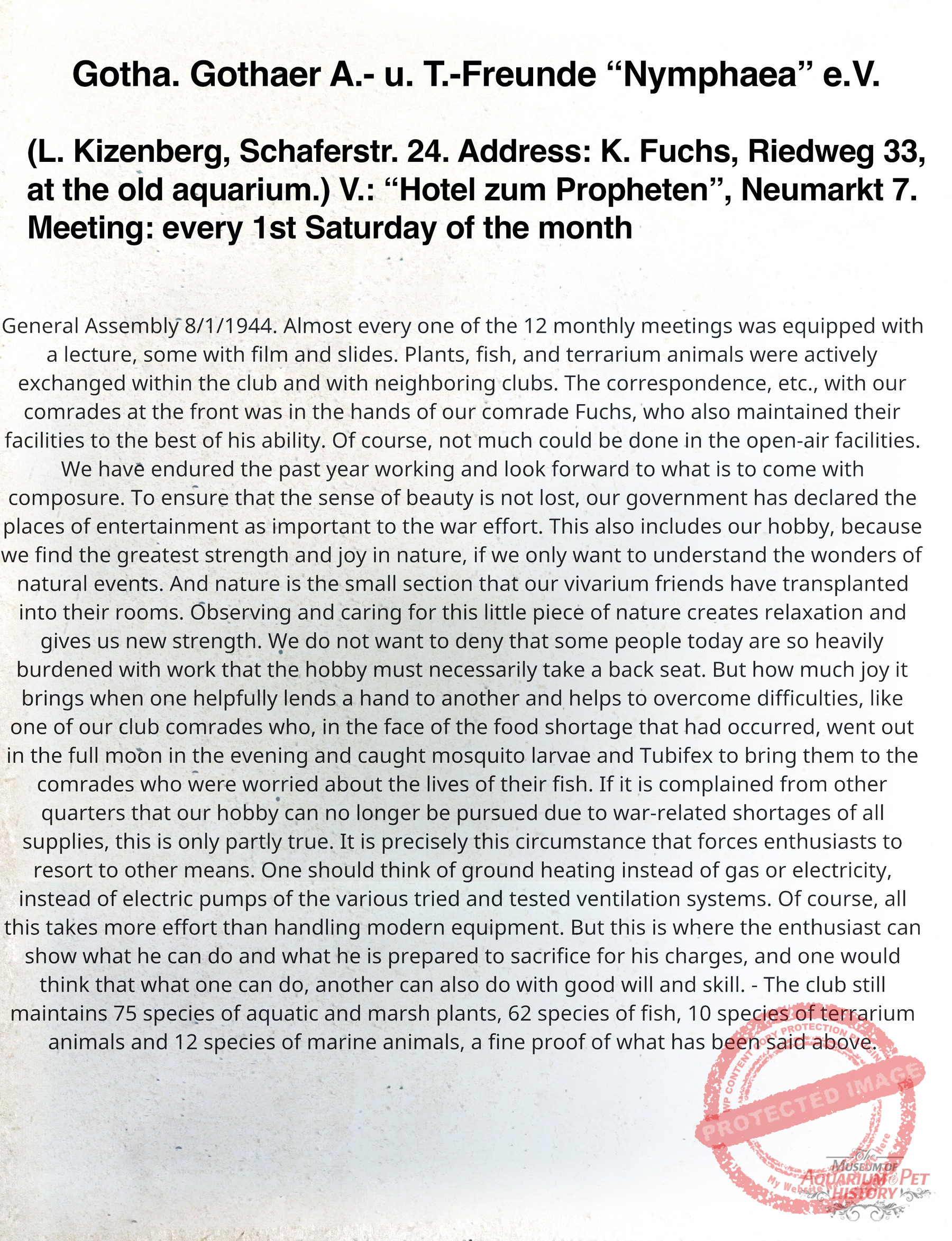 In early 1944, the Wochenschrift once again printed a report from the Gotha Nymphaea club describing, in moving language, the mutual assistance in maintaining aquariums and their inhabitants — highlighting Charly Fuchs as a figure of self-sacrificing dedication.