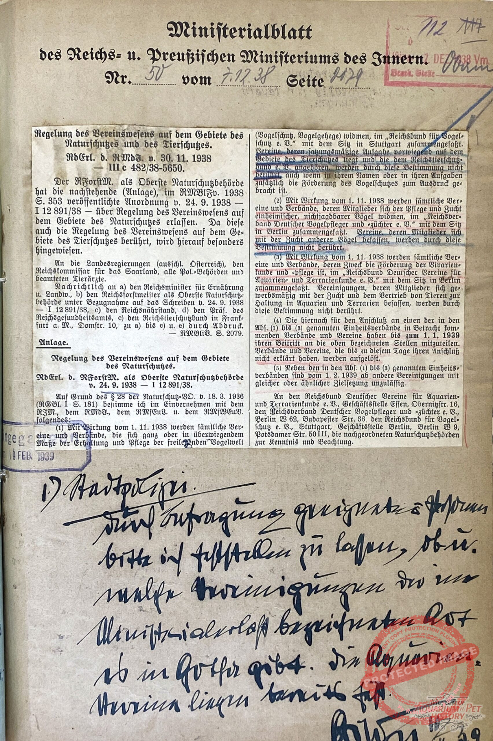 Ministerial Gazette of the Reich and Prussian Ministry of the Interior, dated December 7, 1938, regulating associations in the fields of nature and animal protection. It states: “Associations and clubs eligible for affiliation with one of the unified federations must declare their accession by January 1, 1939. Those that fail to do so by that date will be dissolved.”