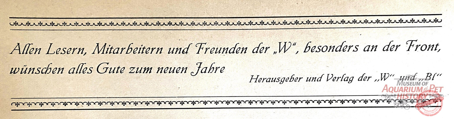 The process of Gleichschaltung was completed before the outbreak of war on September 1, 1939. The distinguished long-time editor of Wochenschrift and Blätter, Dr. Willy Wolterstorff, had celebrated his 75th birthday on June 16, still before the war began. For him, as a scientist who refused to conform (none of his articles or short editorial notes ever include “Heil Hitler!”), all the aforementioned changes were dreadful. He largely withdrew from club life and restricted himself to professional correspondence. From the fourth quarter of 1939 onward, the impact of the war on the hobby was increasingly documented. What had already been prepared through the housewives’ magazine at the time now came to pass: many men were drafted to the front. In the final 1939 issue of Wochenschrift, the holiday greetings read: “To all readers, contributors, and friends of the ‘W,’ especially those at the front, the publisher and editorial staff of the ‘W’ and the ‘Bl’ extend their best wishes for the New Year.” Among the advertisements, for example, Heinrich Stolz, importer and exporter of tropical fish in Potsdam, announced that due to his conscription, no railway shipments abroad would be possible for the time being.