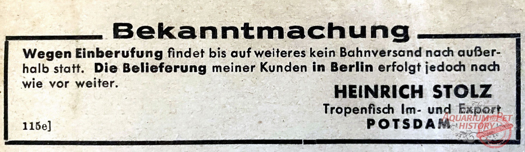 An advertisement from the final 1933 issue of the Wochenschrift in which Heinrich Stolz, then a prominent importer and exporter of aquarium fish in Potsdam, announces his conscription into the Wehrmacht and the resulting suspension of animal shipments. The text says “Announcement: Due to conscription, there will be no further shipping by rail to destinations outside the area until further notice. However, deliveries will continue to be made to my customers in Berlin as before. – Heinrich Stolz (Tropical Fish Import and Export POTSDAM”
