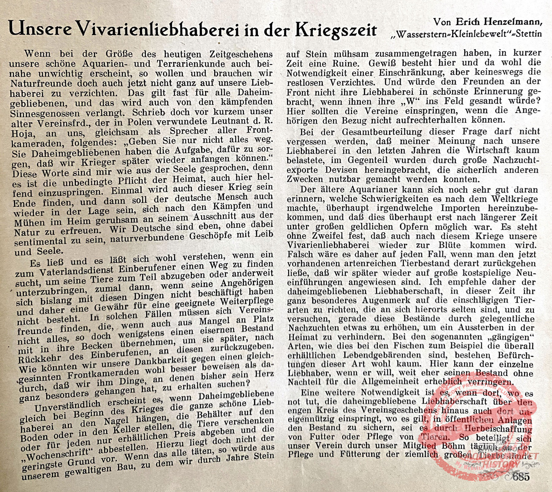 The Wochenschrift article “Unsere Vivarienliebhaberei in der Kriegszeit” — Our Vivaristic Hobby in Wartime — by Erich Henzelmann, published in late 1939.