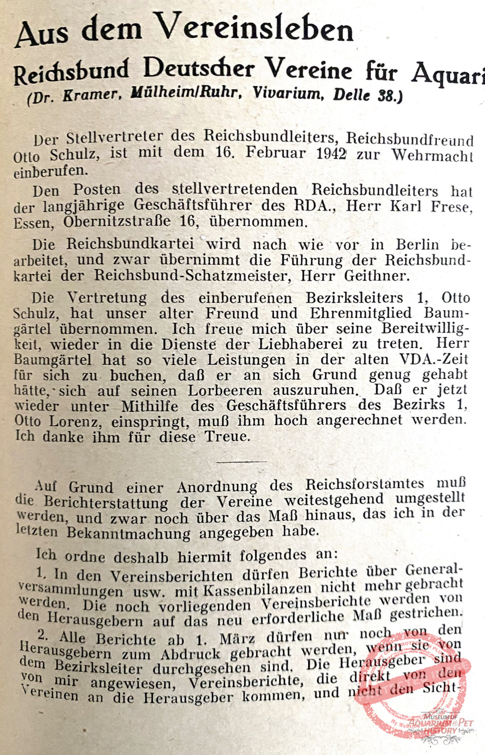 By the third and fourth years of the war, the tide had turned against the German Wehrmacht: German troops increasingly became losers and had to retreat gradually, especially during the Russian campaign. Many soldiers lost their lives at the front, and bombing raids on Germany began. The population experienced firsthand what war truly meant. Göring got “cold feet”; he did not want the public to become aware of depleted club funds, massive losses of members to death at the front, and complaints about the lack of equipment and materials for the hobby. Therefore, he decreed that all publications be reviewed and ideologically trimmed before release. His vassal, Reichsbund leader Dr. Kramer, not only asked members to comply but instructed them in a military style. Correspondence between aquarium associations and vivaristic journals was no longer allowed directly, only through the Reichsbund leader, who ideologically sanitized everything. Göring’s decree was supplemented and tightened several times in 1942. Nevertheless, some manuscripts reached the Wochenschrift editorial office and were published—for example, instructions on how to build an aquarium aeration system in the absence of industrially manufactured pumps. This mutual aid among aquarists—animal exchanges, taking care of others’ stocks, and helping maintain friends’ aquariums—could not be prevented. At the end of 1942, Reichsbund leader Kramer claimed these unavoidable activities as his own initiative, demanding them from all members in the name of homeland loyalty to Germany.