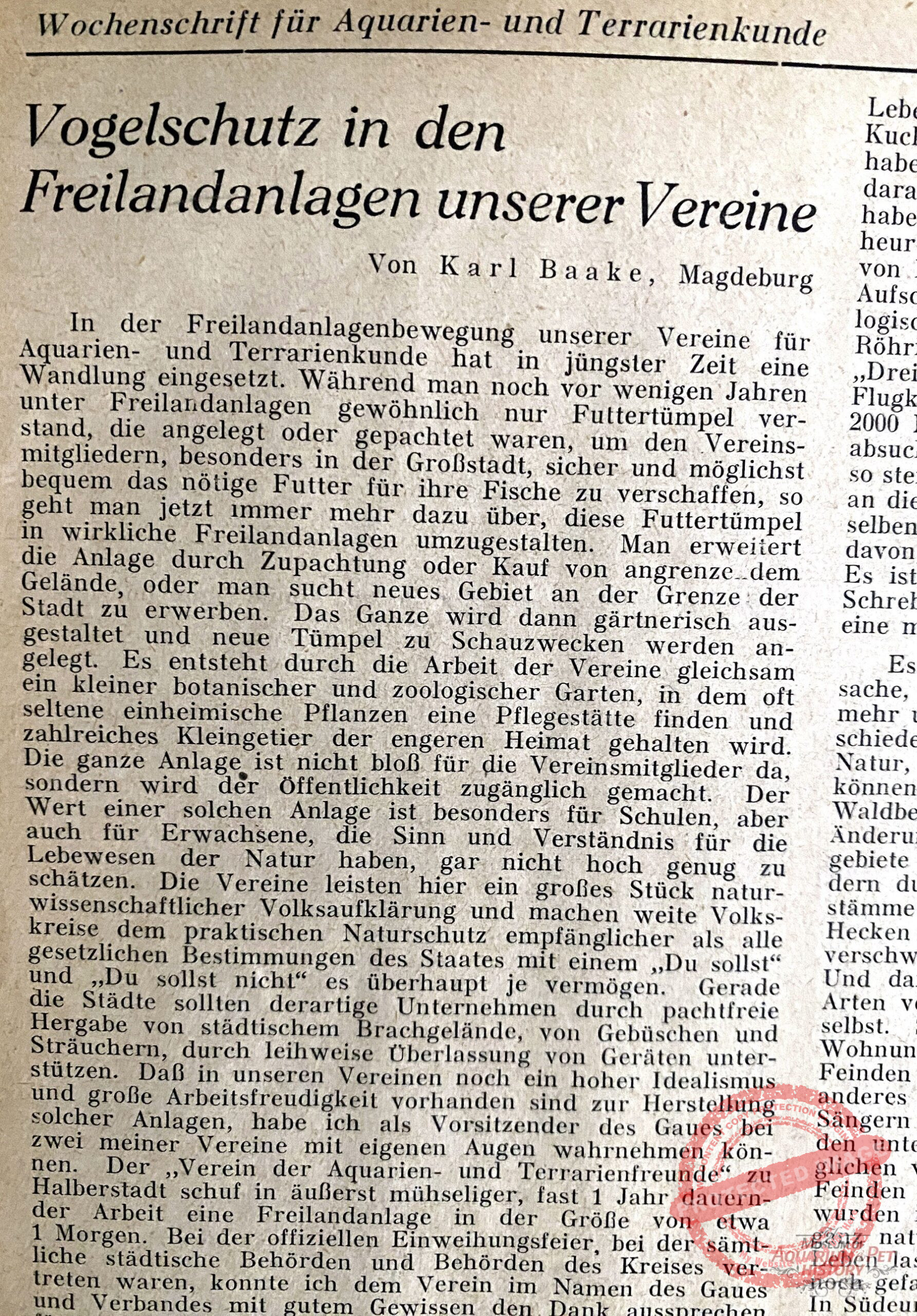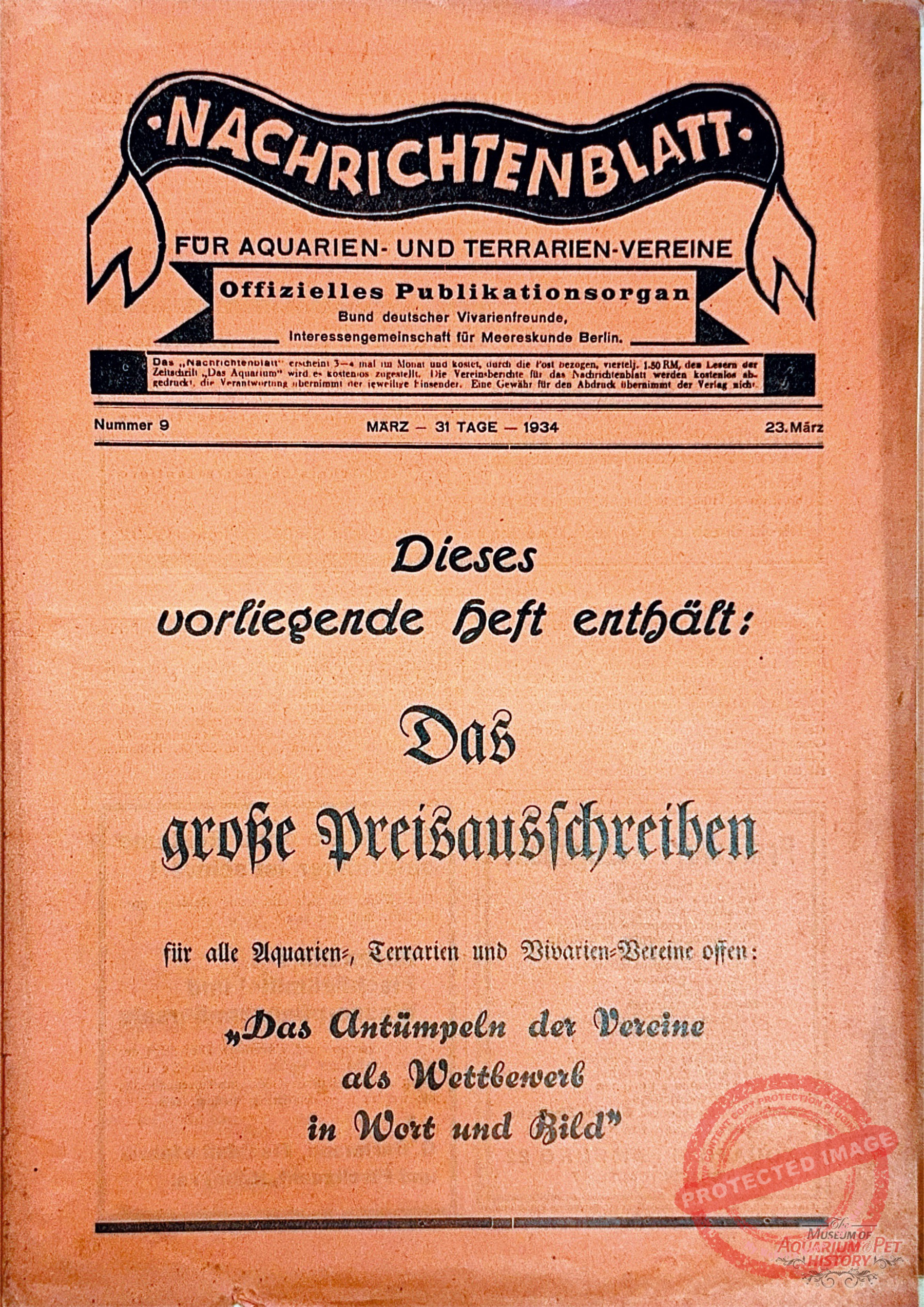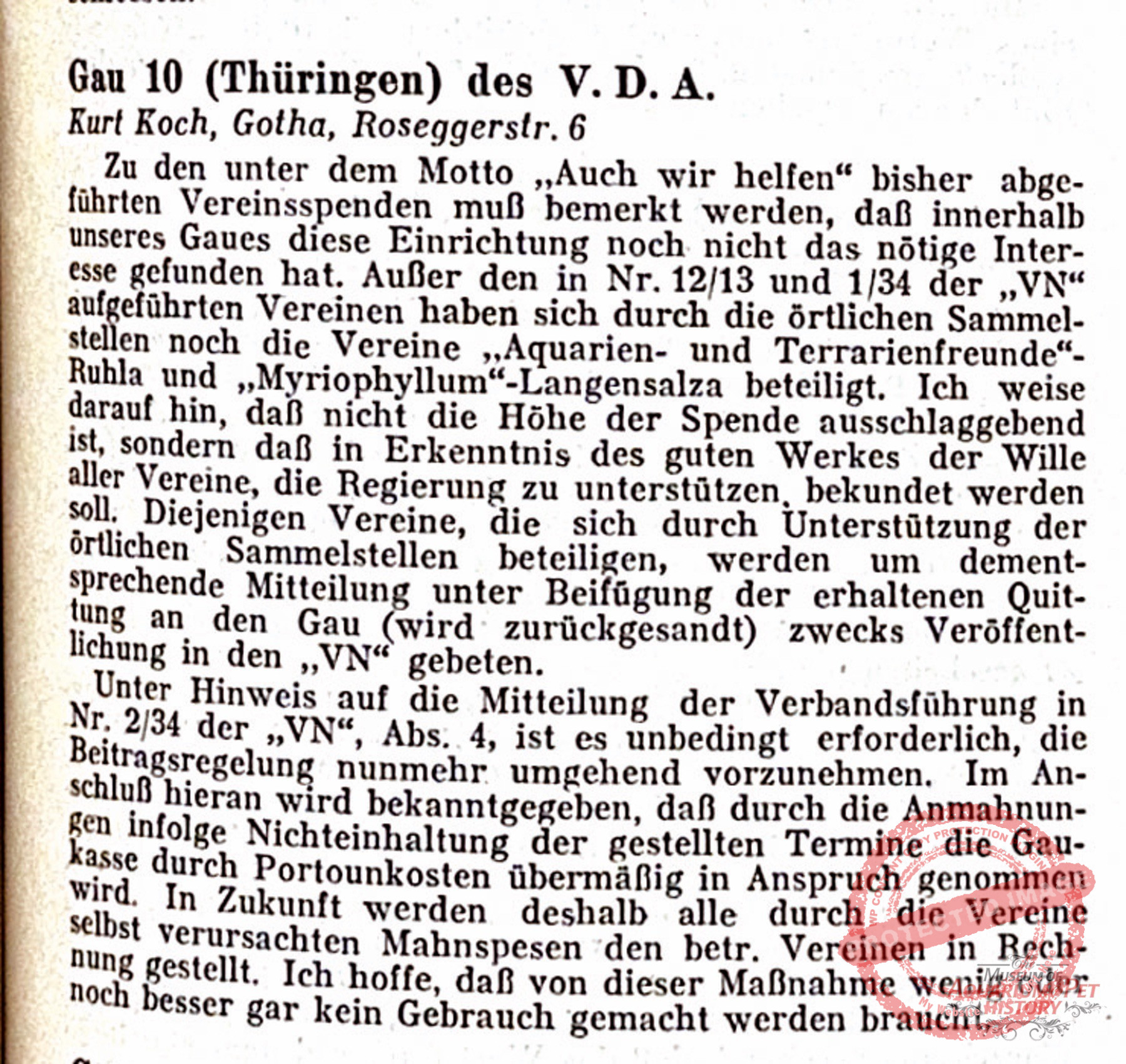 In the Nachrichtenblatt für Aquarien- und Terrarien-Vereine (Newsletter for Aquarium and Terrarium Clubs), Kurt Koch published both club news in his role as Gau leader for Thuringia and technical articles.