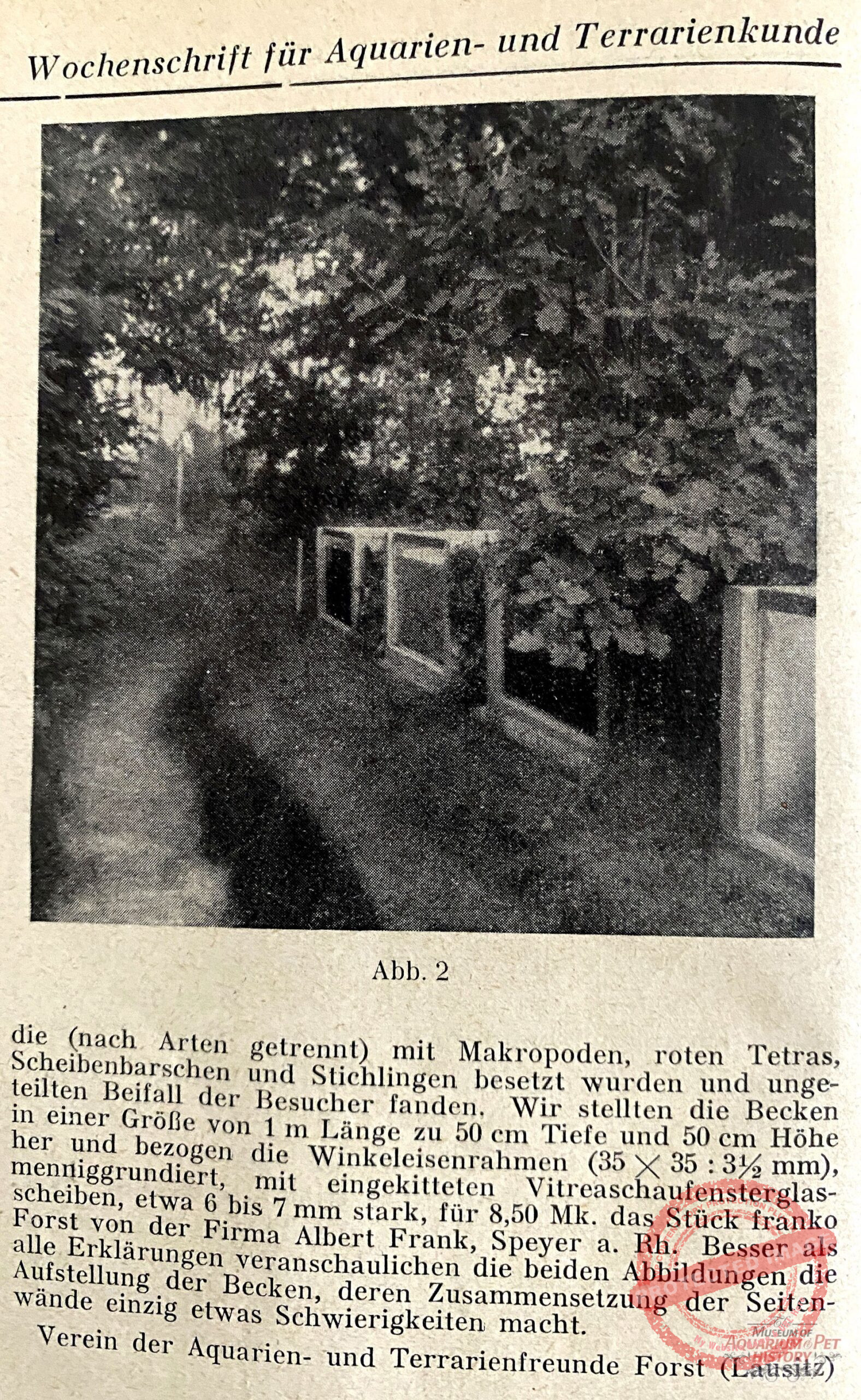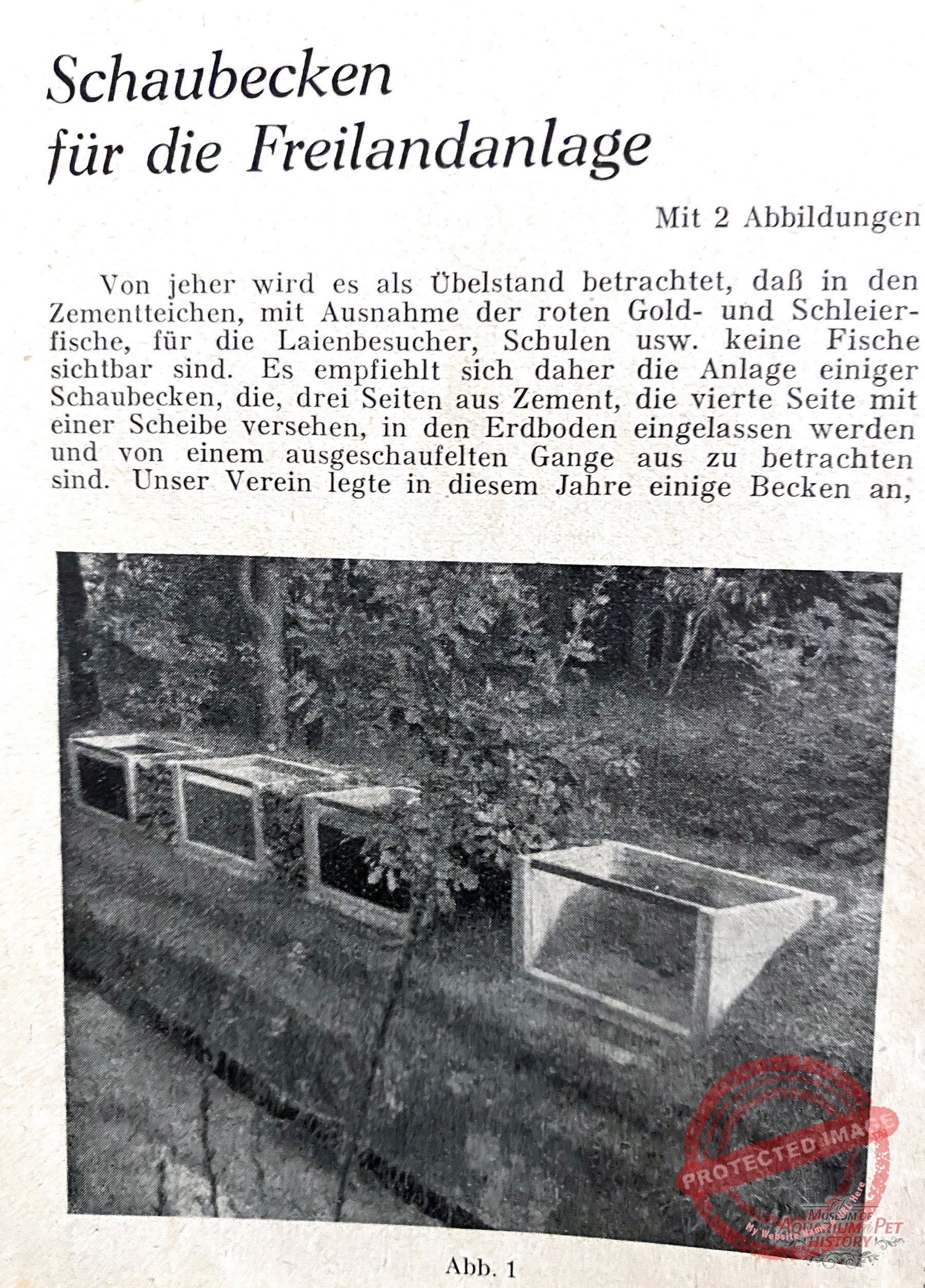 A 1933 contribution in the Wochenschrift titled “Schaubecken fur die Freilandanlage” (Display tank for the outdoor facility) describing the outdoor installation in Forst (Lausitz).