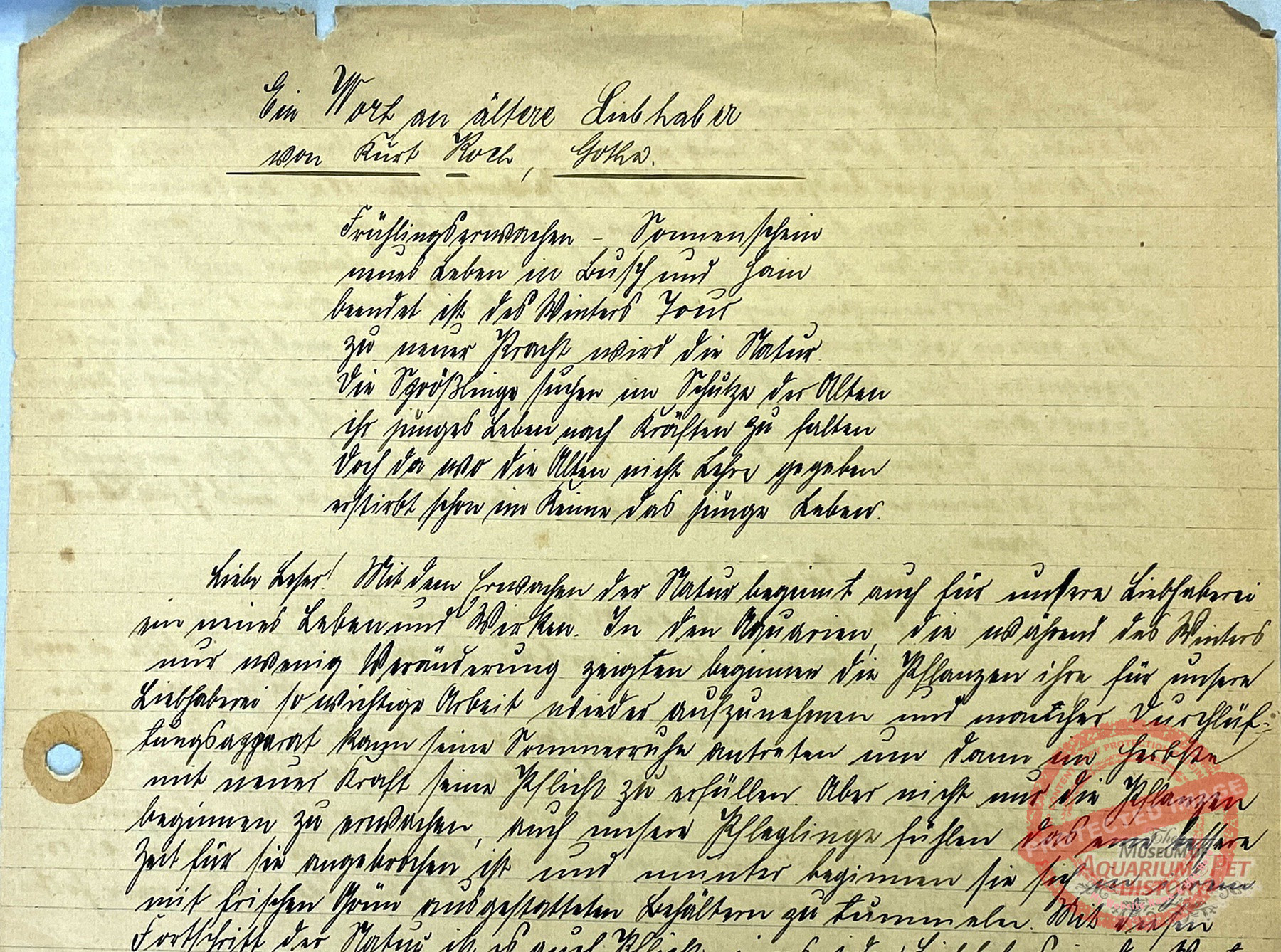 During the Third Reich, Kurt Koch increasingly focused on private breeding activities, which also provided his income. He had registered his ornamental fish breeding as a business at Roseggerstraße 6 in Gotha and sold fish almost like a pet shop. As a member of a Reichsbund-organized club, he would not have been allowed to do this. Apparently, for this reason, he gradually let his Gotha club fall dormant. He also certainly did not want forced unification with his previous clubs, Nymphaea and Danio. In the autumn of 1934, he published a remarkably detailed breeding report on Neon Tetra (Paracheirodon innesi) in the Wochenschrift, showing successful reproduction in Gotha’s soft water. His apparently unpublished handwritten manuscript, Für ältere Liebhaber (“For Older Enthusiasts”), likely dates from this period.