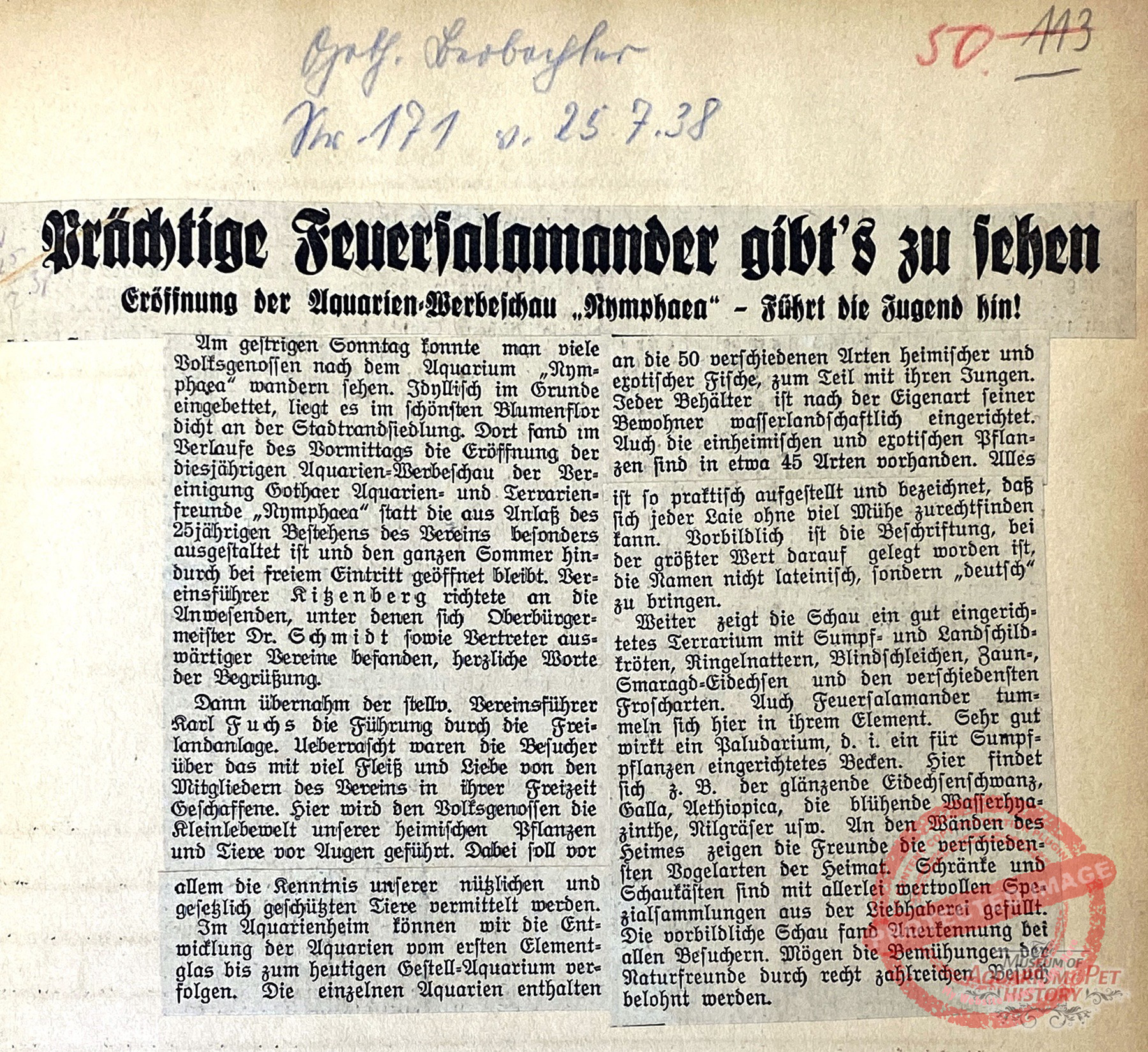 On July 25, 1938, the Gotha regional newspaper reported on the jubilee festivities. The headline translates roughly to “Magnificent fire salamanders can be seen at the opening of the “Nymphaea” Aquarium Exhibition – Bring the youth!”
