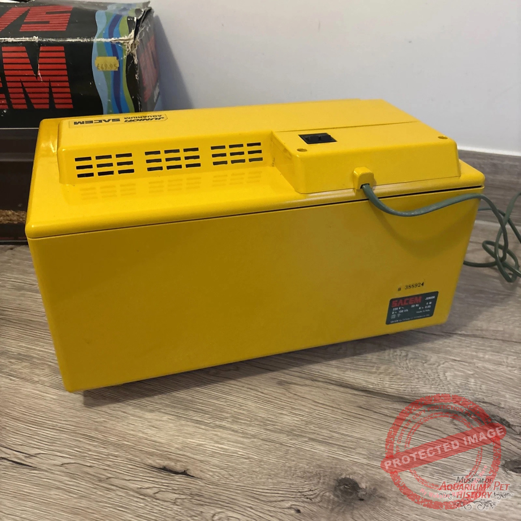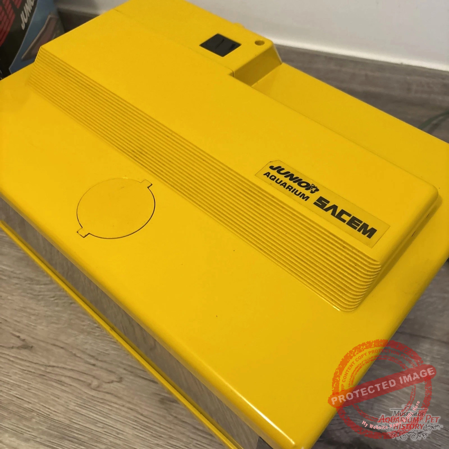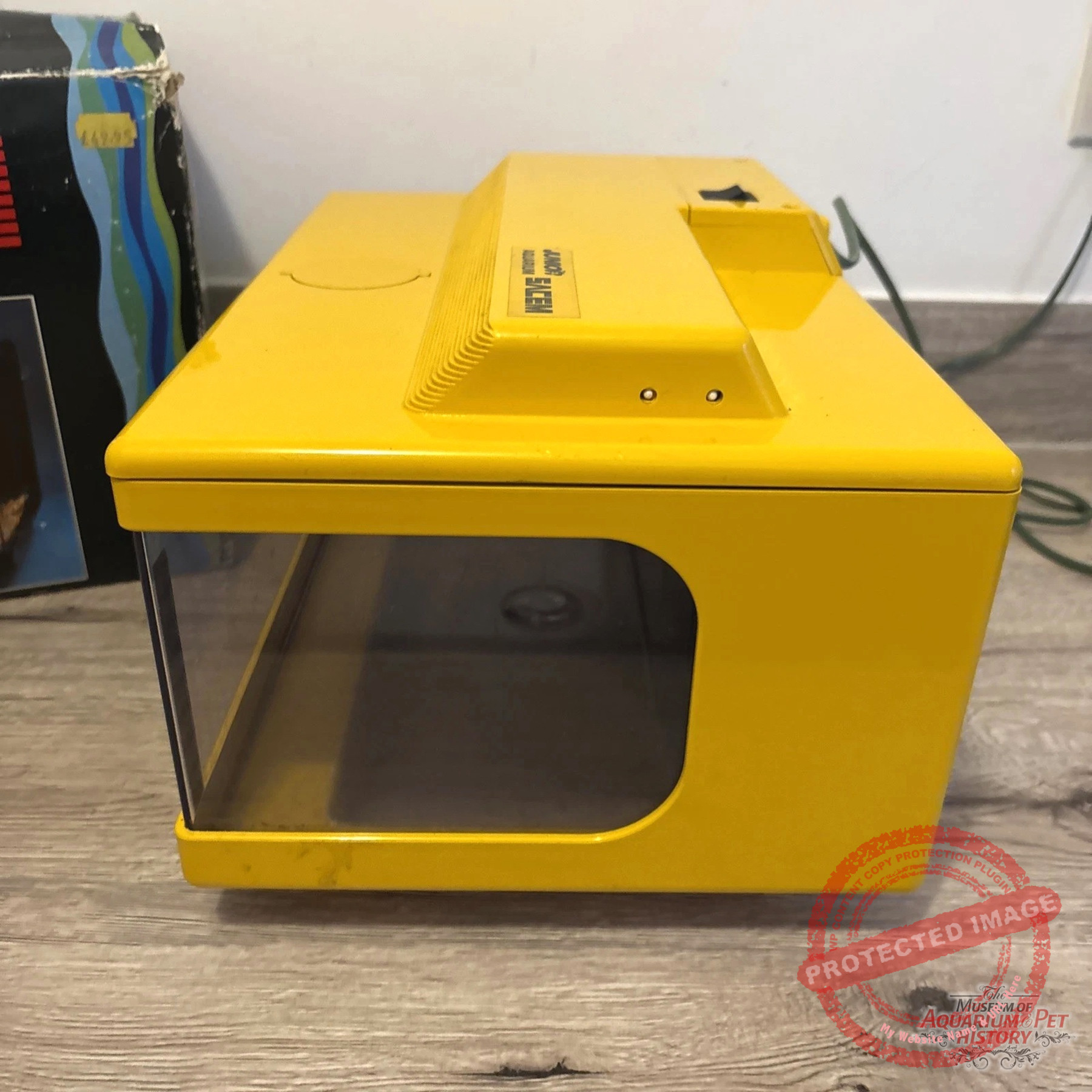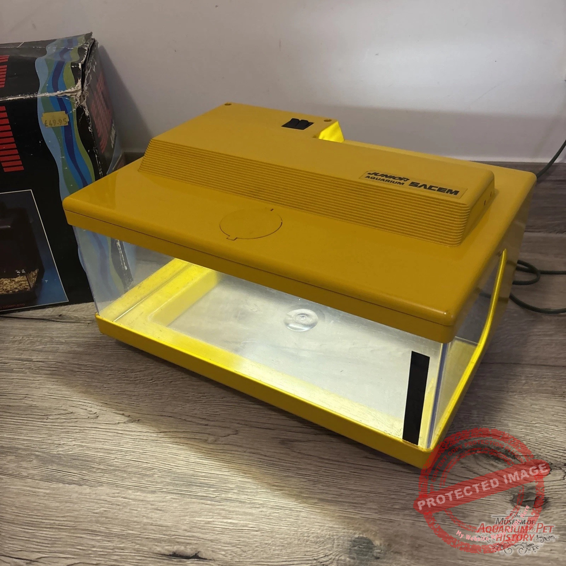 The reluctant star of this article is called SACEM Junior Aquarium. It was made entirely of plastic and came fully equipped with everything you might need: a water pump, a heater, and a full hood. Luckily, I managed to find it in its yellow version rather than the more common black one.