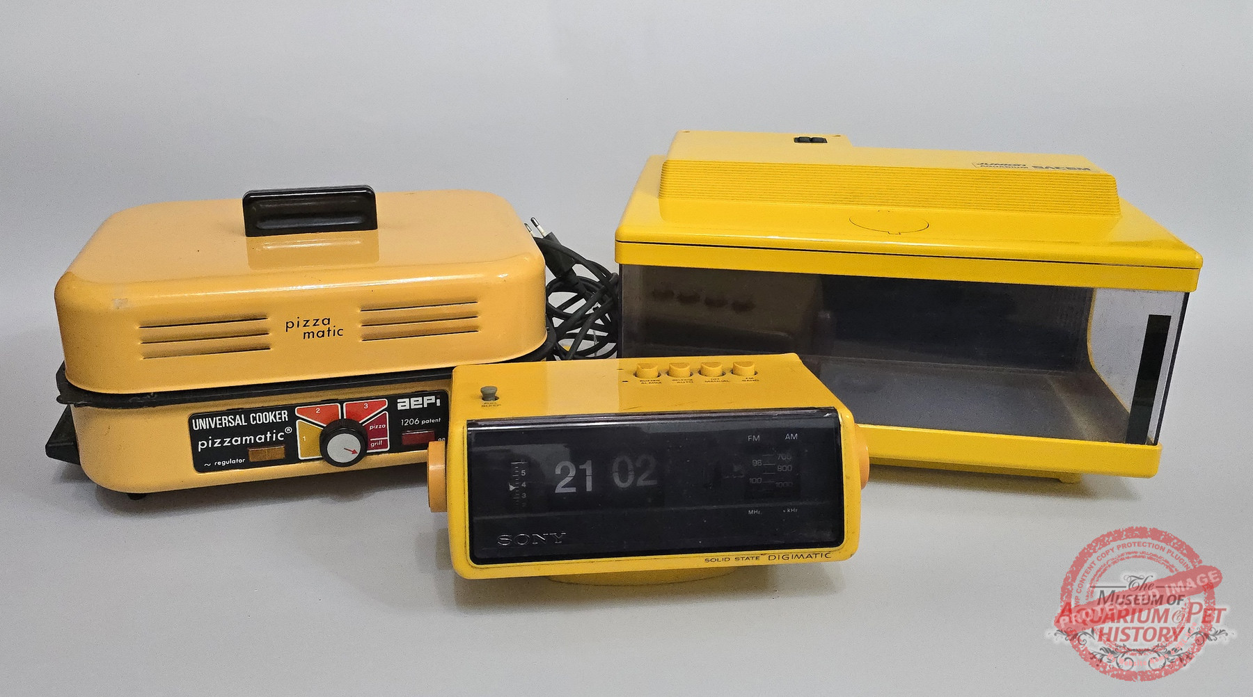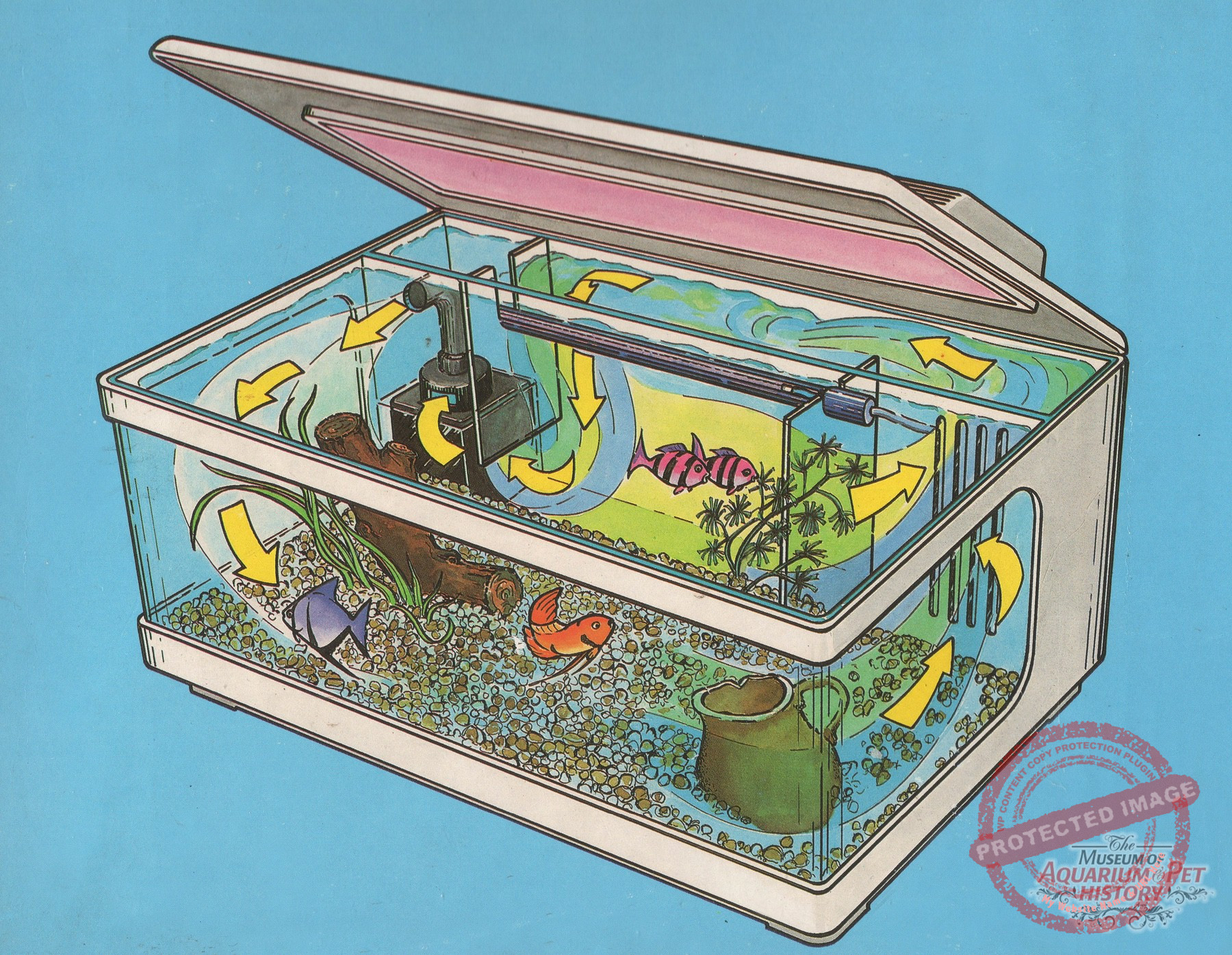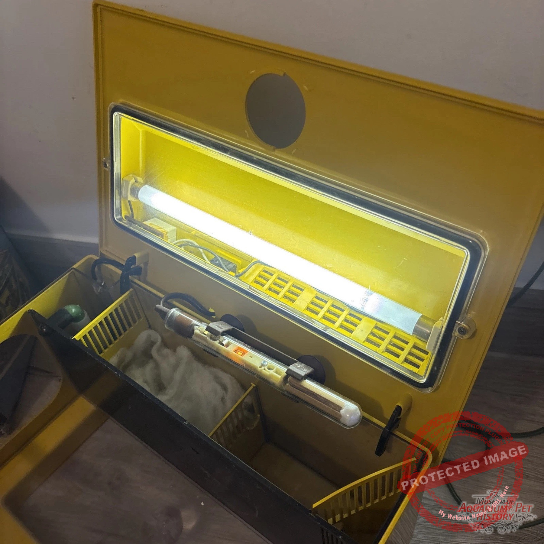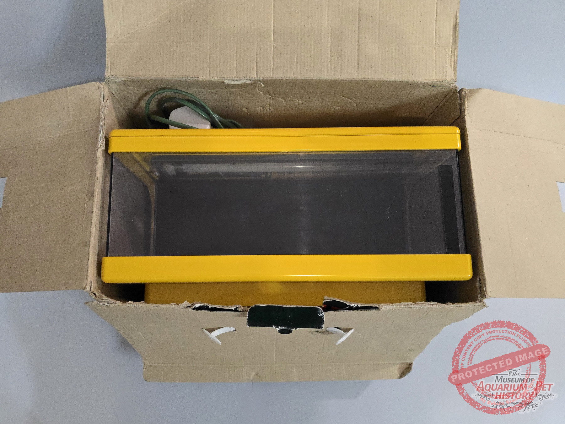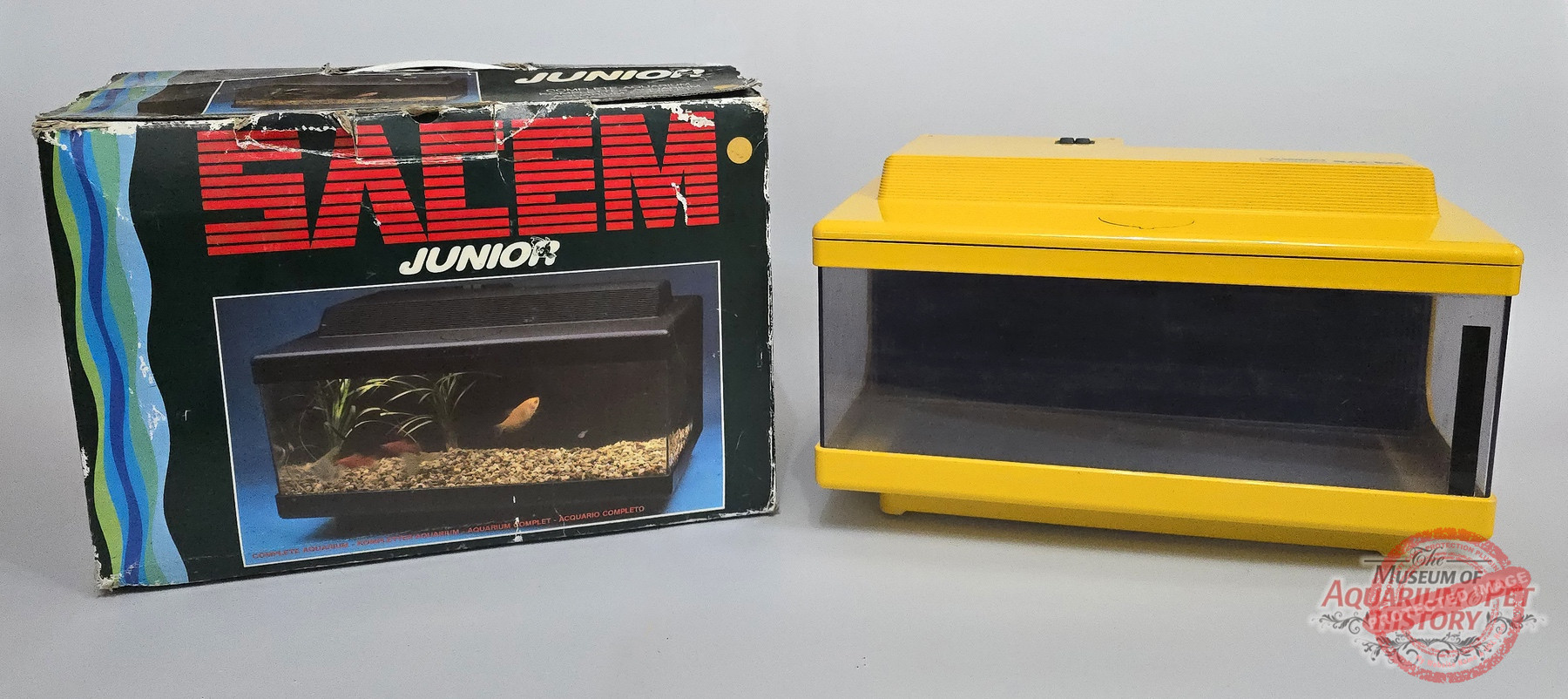 The reluctant star of this article is called SACEM Junior Aquarium. It was made entirely of plastic and came fully equipped with everything you might need: a water pump, a heater, and a full hood. Luckily, I managed to find it in its yellow version rather than the more common black one.