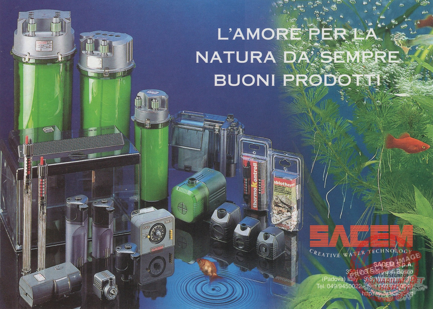 This peculiar tank was designed and produced by SACEM, an Italian company that sadly went out of business years ago. Founded in the late 1970s, SACEM was one of the earliest, proudly Italian alternatives to major German manufacturers such as EHEIM. The firm specialized in filters, heaters, water pumps, accessories for fish ponds, and on a smaller scale aquariums. Its advertisements in trade magazines often included the slogan: “L’amore per la natura dà sempre buoni prodotti” (Love for nature always bears good products).