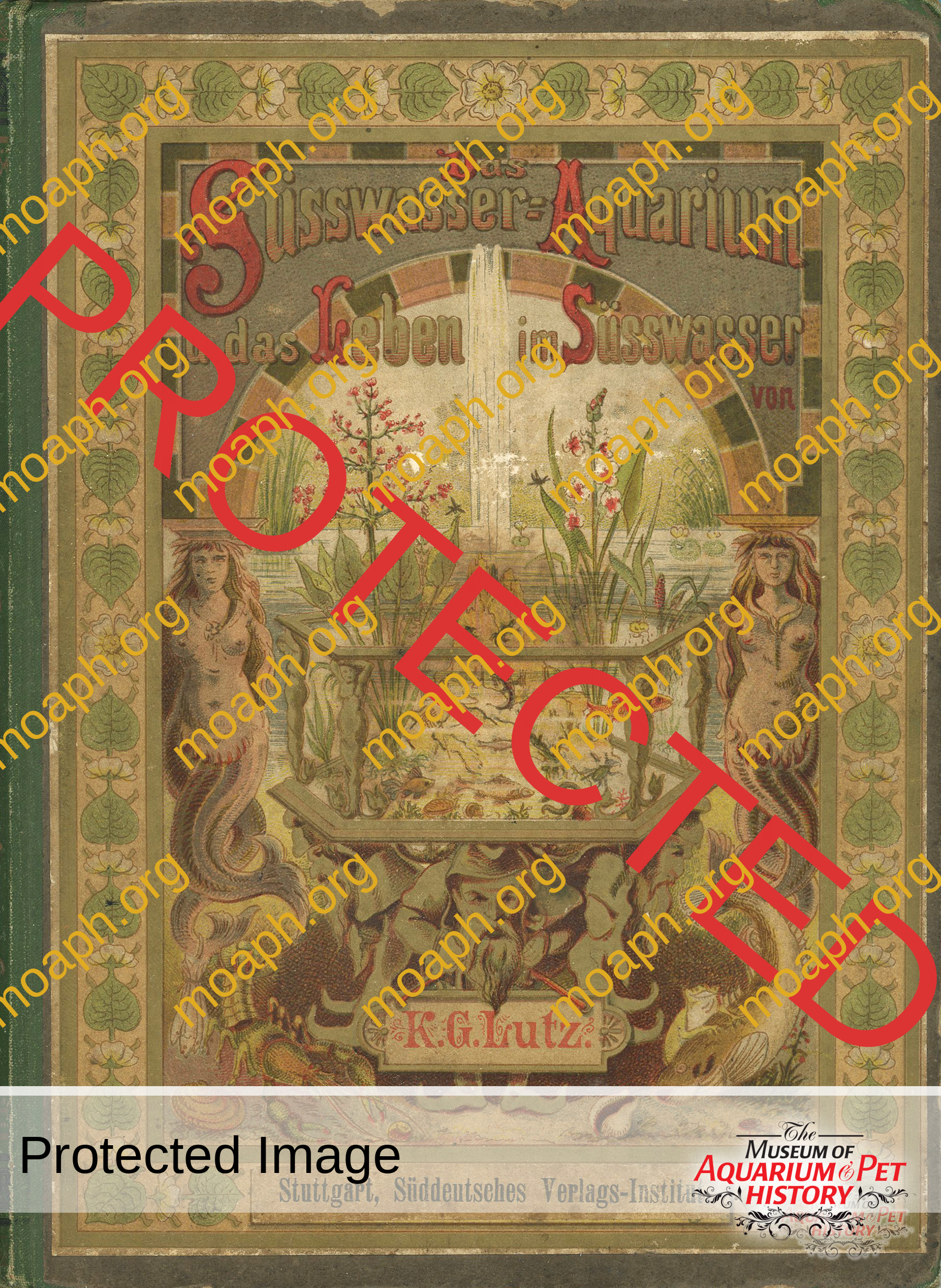In 1886, the book ‘The Freshwater Aquarium and Life in Freshwater’ by K. G. Lutz was published by Emil Hanselmann’s publishing house in Stuttgart. The book, in an octavo format1 (21.5 x 15 cm), is bound in a green half-cloth cover with a spine title embossed in gold. The title and a colored title illustration are mounted on the front cover. The beautiful title illustration makes the cover undoubtedly the most attractive of all aquaristic book covers of the 19th century.