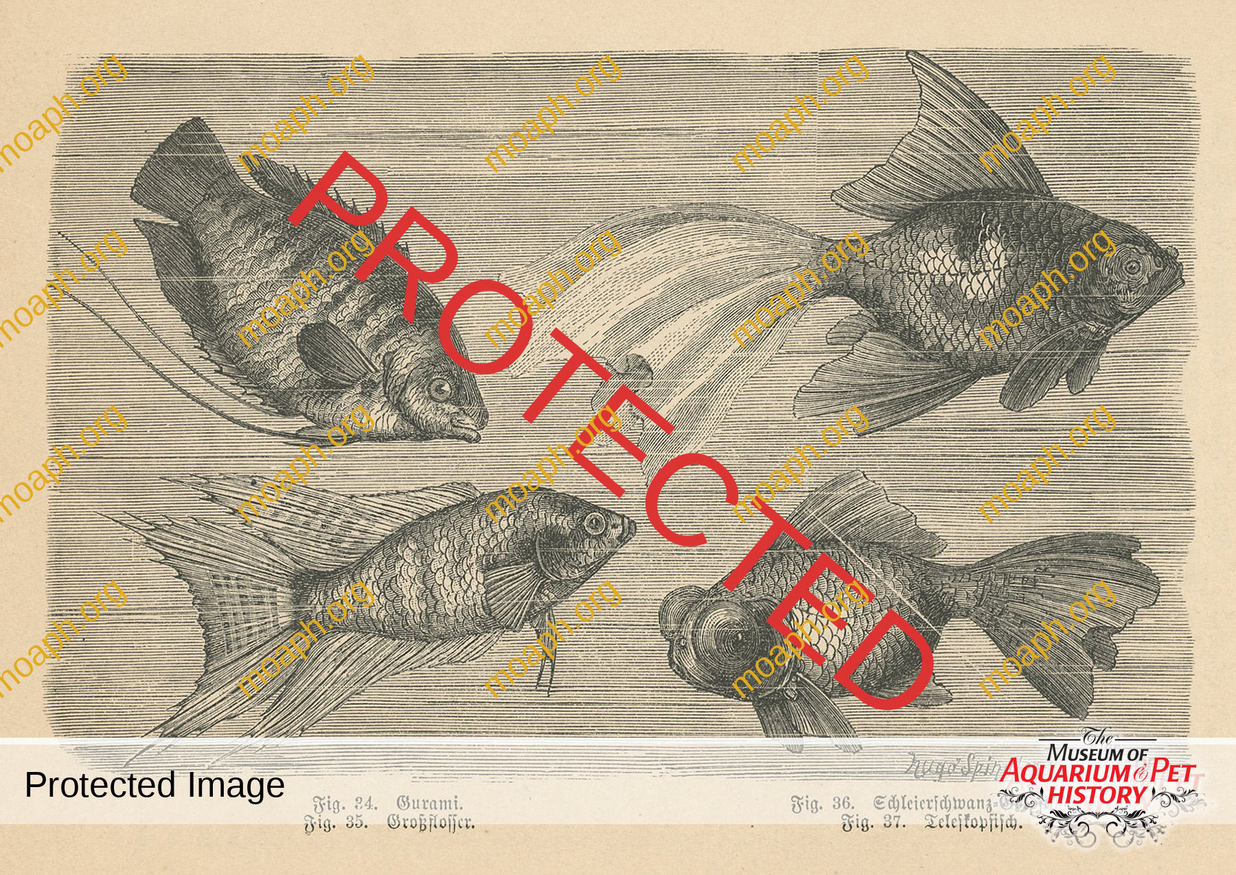 The work comprises VIII, 171 pages of text and is illustrated with nearly 200 color images on 16 chromolithographic plates, as well as 40 partially large-format wood engravings within the text. The color illustrations predominantly depict swamp and aquatic plants, along with fish, amphibians, and water insects. The color illustrations are exceptionally appealing, and the book stands out in 19th-century German aquarium literature for its quantity of illustrations I am not aware of any other work that contains nearly as many illustrations. Most of the text illustrations depict the most commonly used types of aquariums at that time in various versions. Notable is a full-page woodcut that features the first foreign ornamental fish species, including veiltail, telescope goldfish, gourami, and paradise fish.