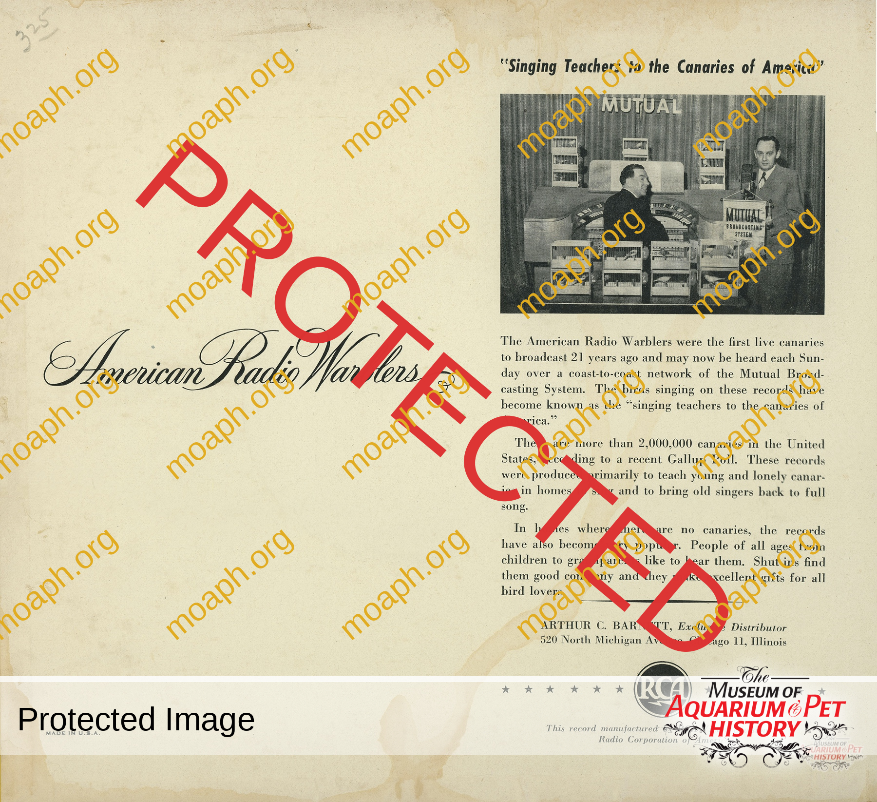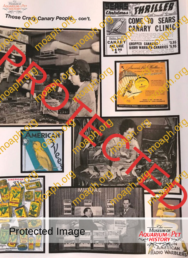 People flocked to hear the radio stars of American Radio Warblers in person. Of course, American Bird Products sold tons of birdie accoutrements. Called the 3 Vees (for Vitality, Vigor, Vitamins) the products included everything for molting, mating, and singing. A canary might be had for $3.95 but a premium Radio Warbler trained songster would run $5.95. There were phonograph records to help! Soon imitators were catching a ride on the canary band wagon: the Canary Chorus from Chicago’s other bird food company Kaempfer, Inc; and the Master Radio Canaries from Hartz Mountain. But the American Radio Warblers, in one form or another, retained their popular attraction from the mid-1920s throughout the 1950s.