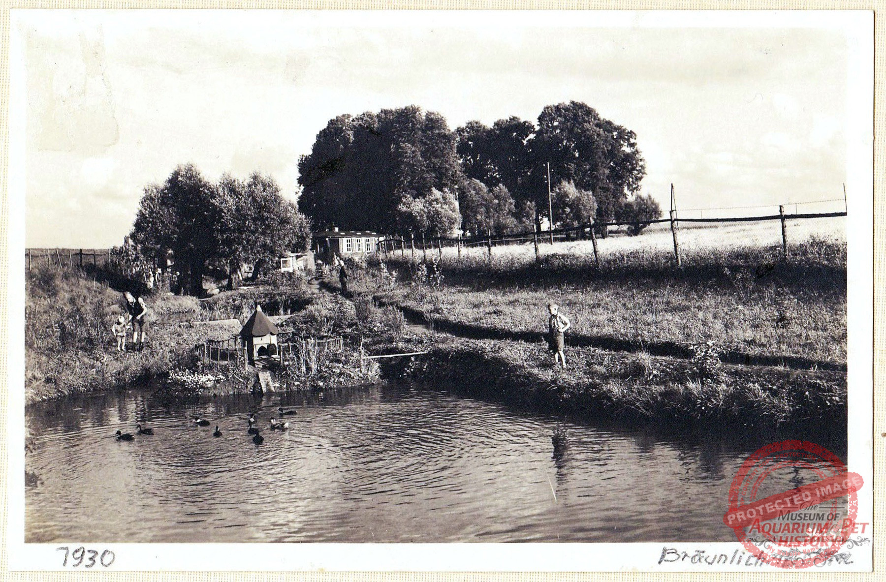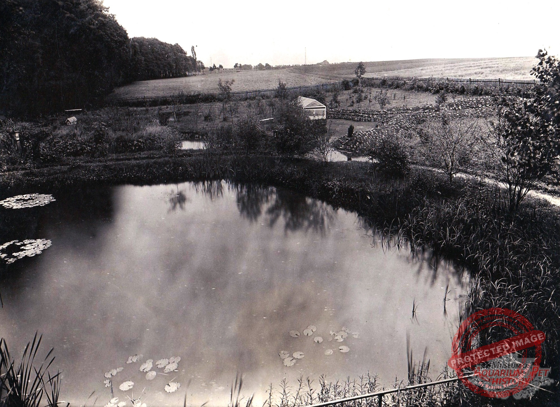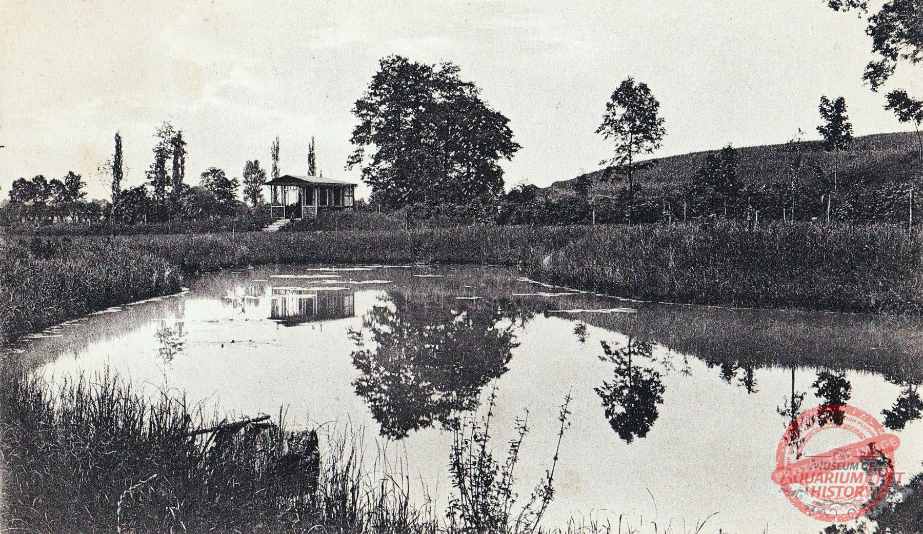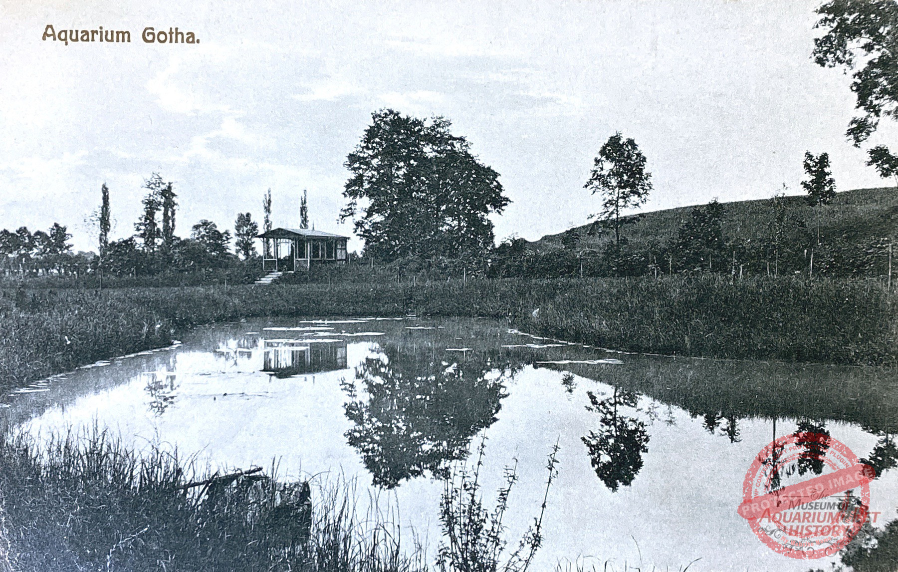The grounds were smaller than those leased by Danio on the Seeberg, but they lay close to the oldest aquarium, the newly established outdoor swimming pool, and a peripheral settlement that had arisen nearby—where a street called An den sieben Teichen still commemorates that era, even though the ponds themselves no longer exist. The topography alone virtually guaranteed a steady stream of visitors. The result of the work was a sparsely enclosed area containing small, arbor-like buildings and ponds. With relatively few trees, it differed markedly from the other two Gotha open-air aquariums. Here, in the largely open landscape, everything resembled a well-kept garden. Perennial plantings and conifers, as well as attractive aquatic and marsh plants, adorned the site. There were also several open-air terrariums, some closable with glass like cold frames, others built of masonry with a front window. The ponds were connected by ditches and a gentle flow, crossed by small bridges made of wide planks. On the final pond stood a peninsula with a small wooden house for waterfowl—again with the same aim as the duck pond on the Danio grounds: to ensure a constant supply of water fleas.