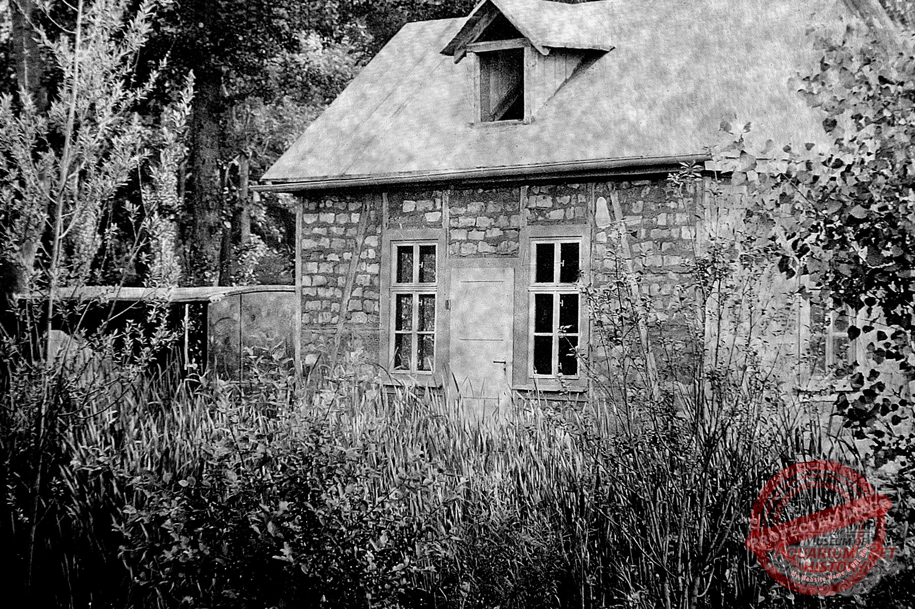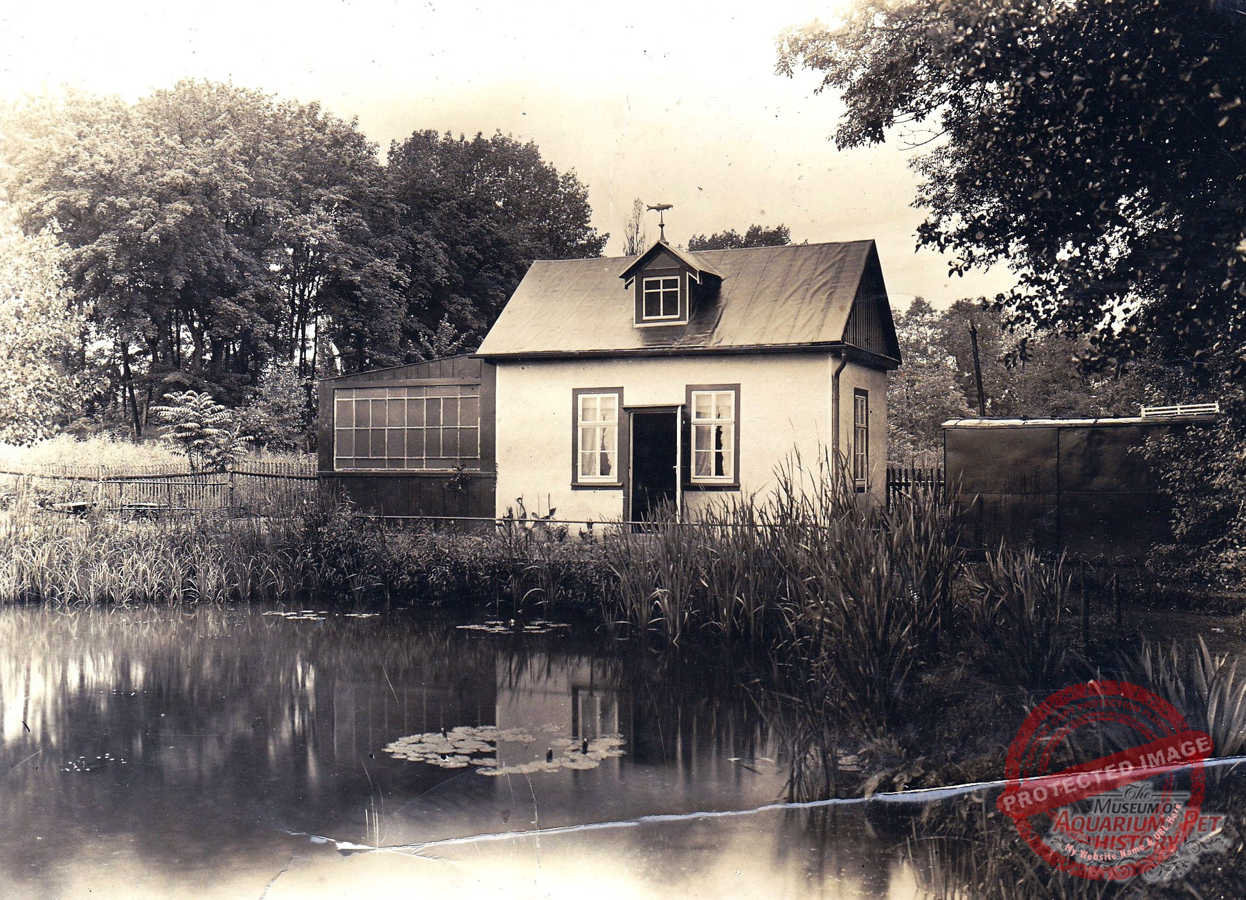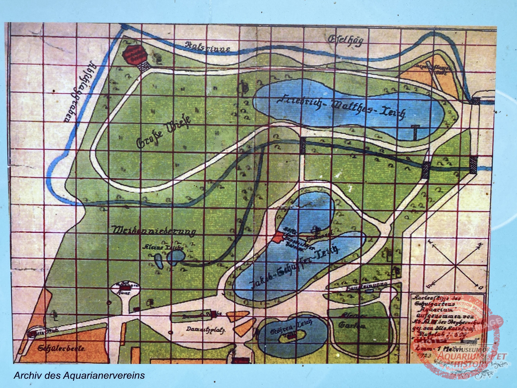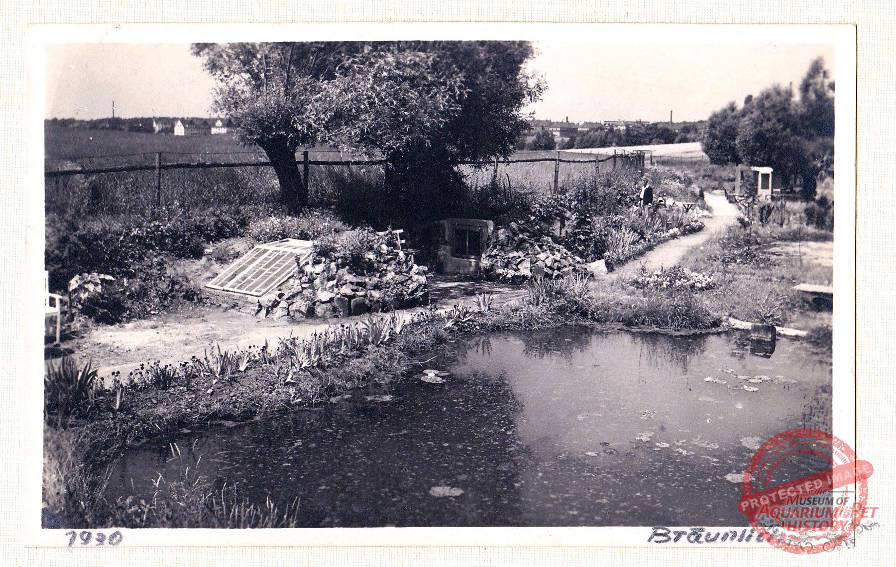 The grounds were smaller than those leased by Danio on the Seeberg, but they lay close to the oldest aquarium, the newly established outdoor swimming pool, and a peripheral settlement that had arisen nearby—where a street called An den sieben Teichen still commemorates that era, even though the ponds themselves no longer exist. The topography alone virtually guaranteed a steady stream of visitors. The result of the work was a sparsely enclosed area containing small, arbor-like buildings and ponds. With relatively few trees, it differed markedly from the other two Gotha open-air aquariums. Here, in the largely open landscape, everything resembled a well-kept garden. Perennial plantings and conifers, as well as attractive aquatic and marsh plants, adorned the site. There were also several open-air terrariums, some closable with glass like cold frames, others built of masonry with a front window. The ponds were connected by ditches and a gentle flow, crossed by small bridges made of wide planks. On the final pond stood a peninsula with a small wooden house for waterfowl—again with the same aim as the duck pond on the Danio grounds: to ensure a constant supply of water fleas.