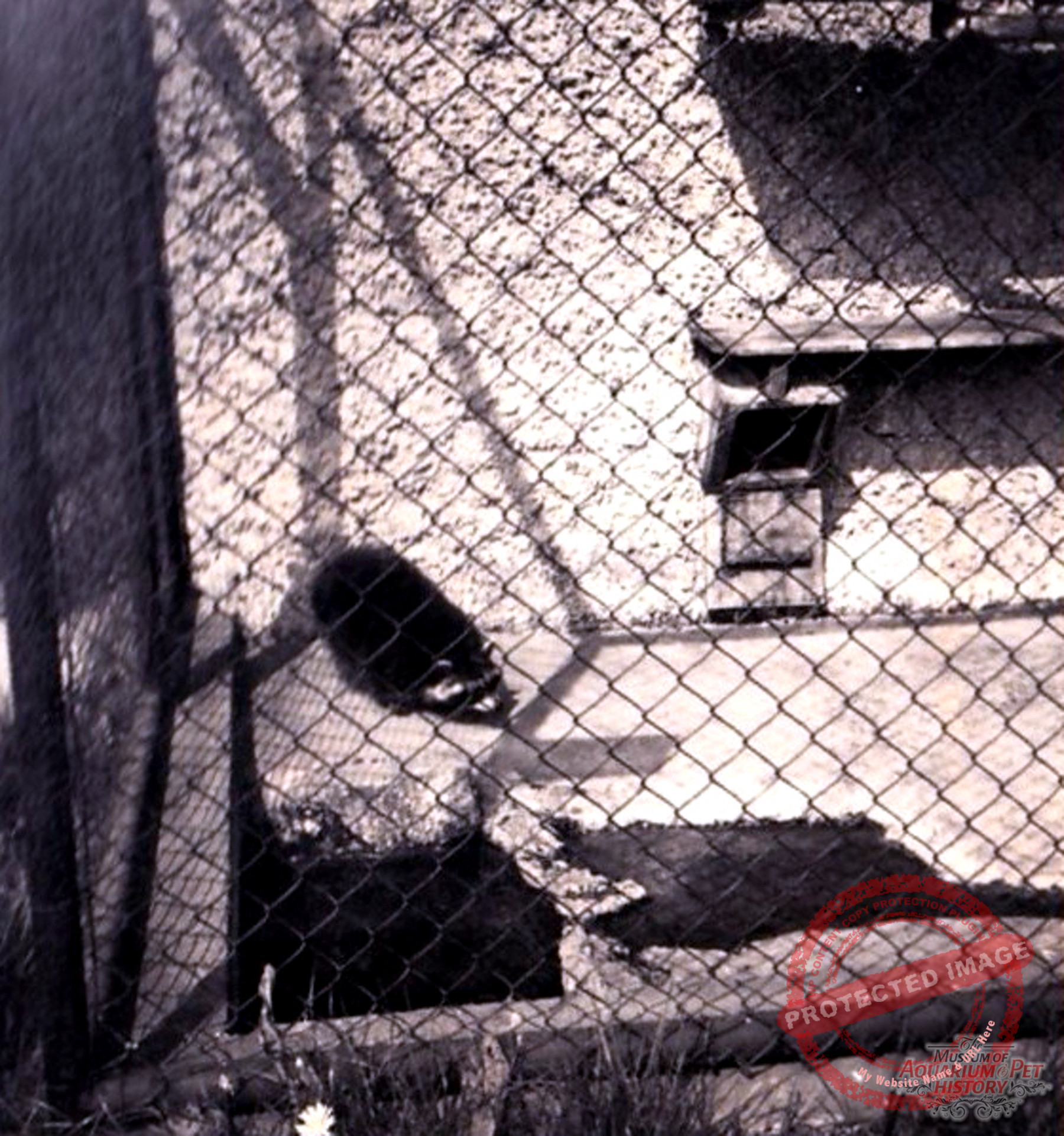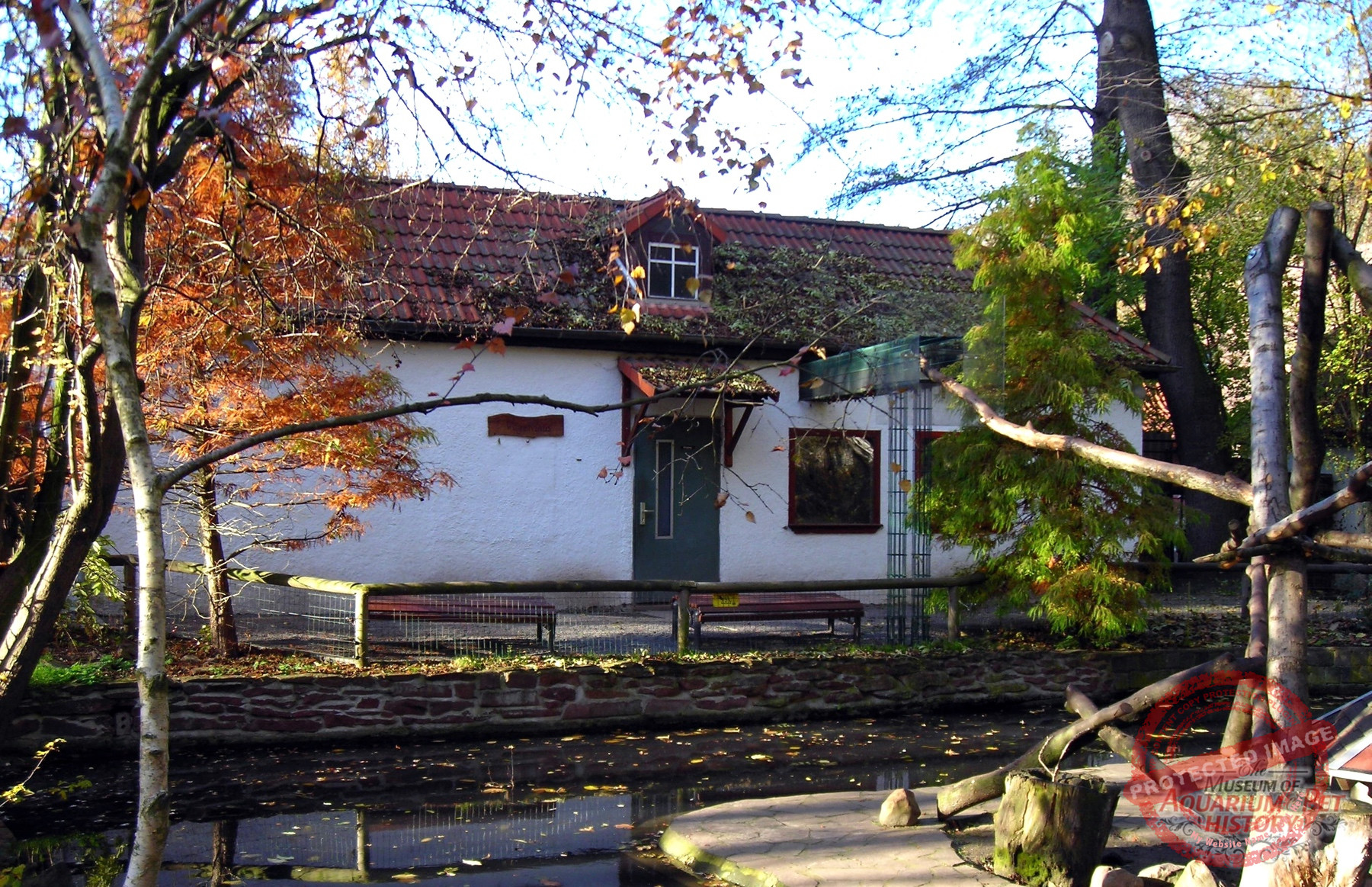 While until the 1980s the original clubhouse served as housing for budgerigars (Melopsittacus undulatus) and cockatiels (Nymphicus hollandicus), it was converted in the 1990s—when this photograph was taken—into an animal house for the neighboring island open-air enclosure; today it has been replaced by another building.