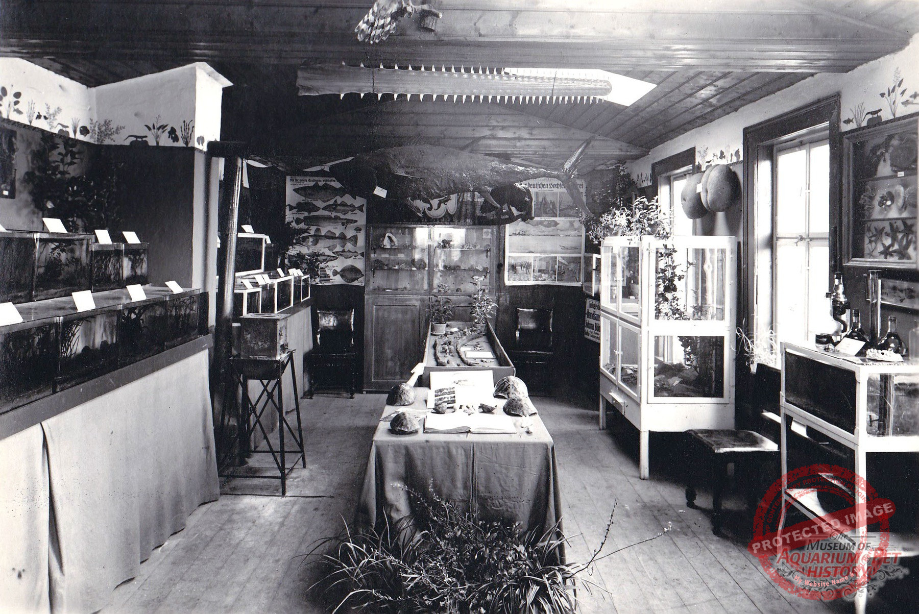 In the bungalow-style clubhouse, people gathered for every imaginable occasion. Everyone contributed items from their own possessions that were best suited, both in content and decoration, to the displays: educational posters from natural-history classes; taxidermied birds of prey and a tuna; the saw of a sawfish; numerous minerals; turtle shells; and even the world’s largest nut—the Seychelles nut of the coco de mer palm (Lodoicea maldivica). Plants that needed frost-free winter quarters were placed in the center and along the walls. Someone had also built a miniature world reminiscent of the artificial landscapes of model-railroad layouts. Most important, however, were the aquariums arranged around the room, housing those specimens that each member could spare from their home collections. A sign from the Gotha pet shop Johann Böhlke attests to contact with its proprietor for selling offspring and acquiring new imports. This, in turn, must have been a thorn in the side of Kurt Koch—the leader of Danio and later founder of his other club—who was then preparing to establish an ornamental-fish business in Gotha with his own private breeding facility. The rivalry that arose persisted into the 1970s in the GDR and was carried on by the successor clubs and pet shops. But more on that later, when the focus turns to Gotha aquaristics during the GDR era.