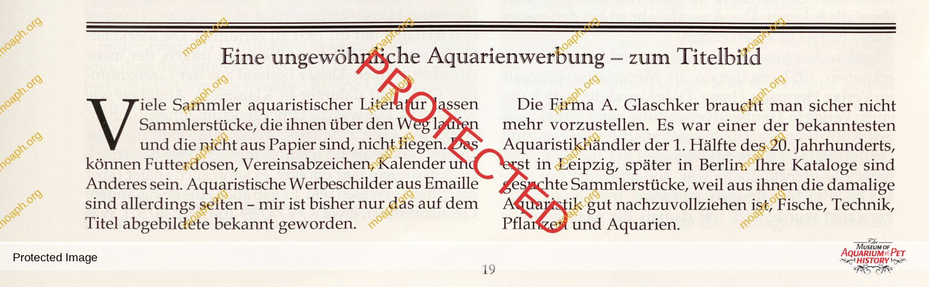 The company A. Glaschker hardly needs an introduction. It was one of the most renowned aquarium dealers of the first half of the 20th century, initially based in Leipzig and later in Berlin. Their catalogs are sought-after collectibles because they provide insights into the aquaristic practices of the time, including fish, equipment, plants, and aquariums.