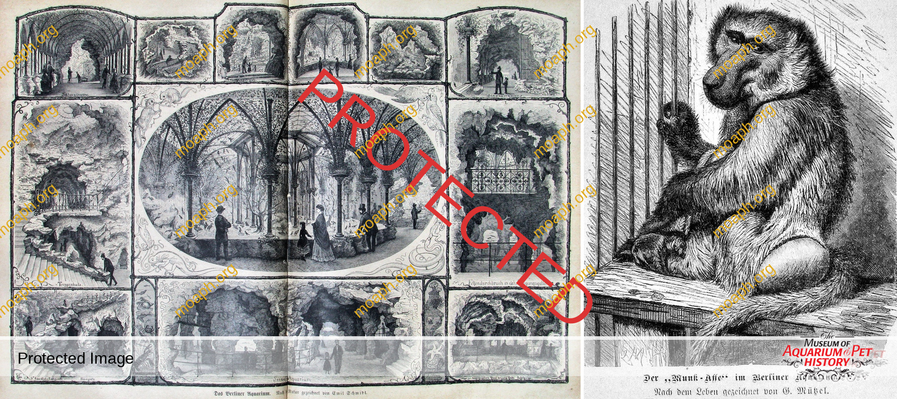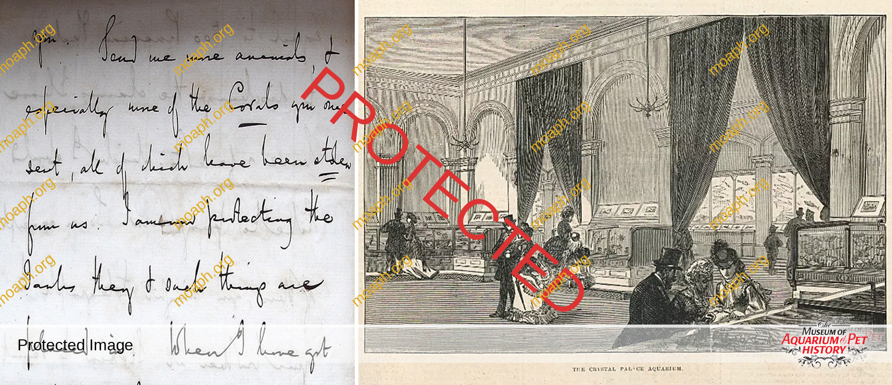 Close-up of page 4 of the letter dated July 11, 1873: “…Send me more animals, and especially more of the Corals you once sent, all of which have been stolen from us. I am now protecting the tanks they and such things are placed in…” ©Bayerische Staatsbibliothek. Right: the most popular illustration depicting the Crystal Palace Aquarium (Illustrated London News, December 30, 1871). This facility had both Regent’s Park-style table tanks, which were designed to be looked down upon, and large wall-mounted display tanks.