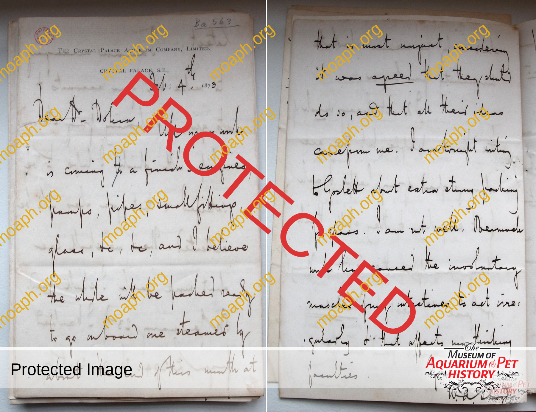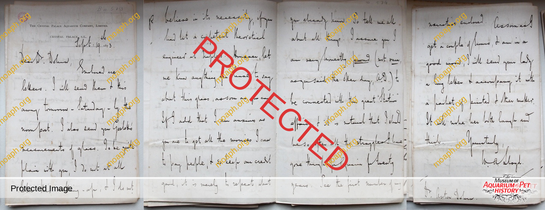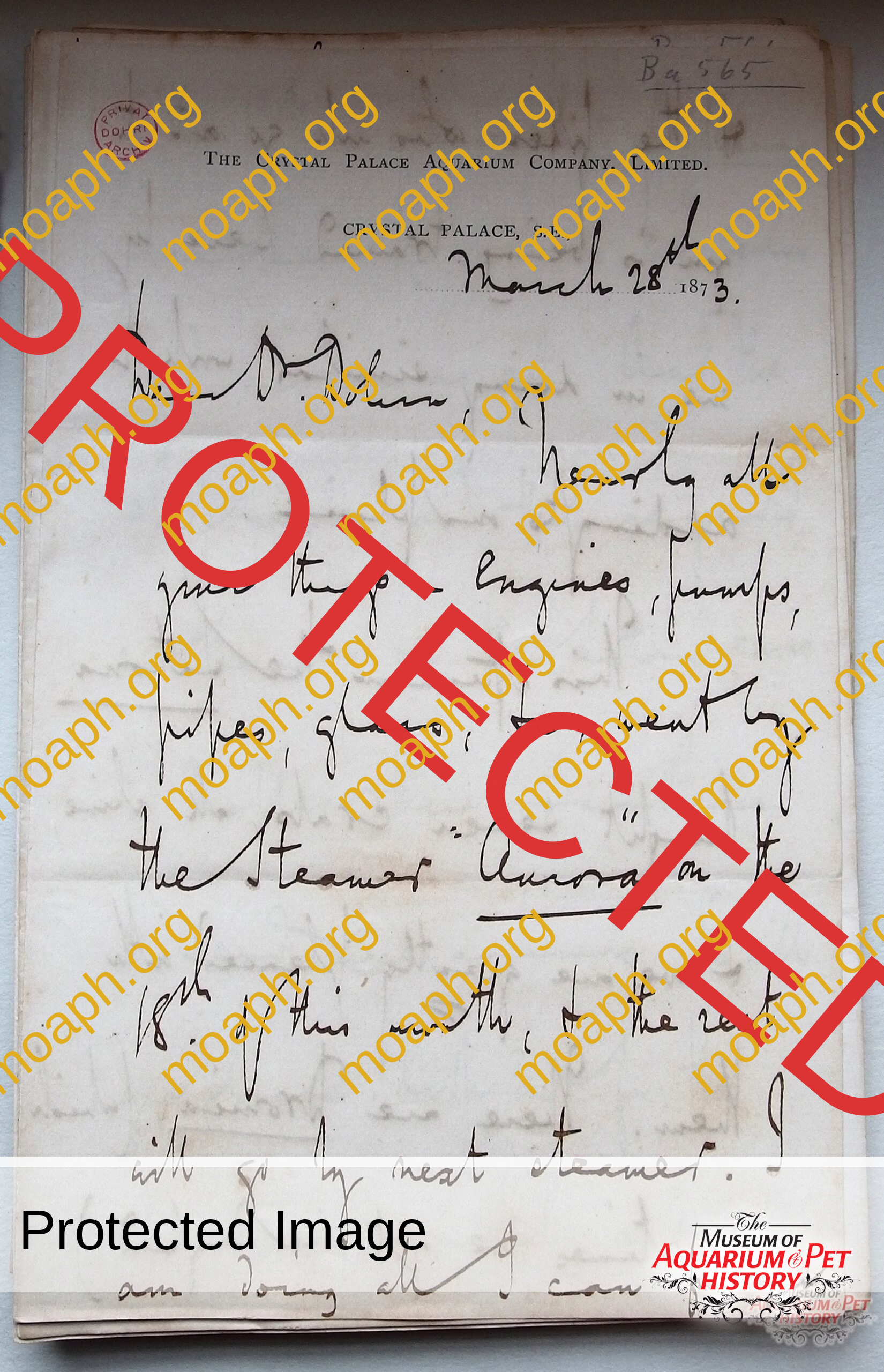 “…The glass, in 16 cases, weighing eight and a quarter tons (one ton English is 2240 pounds) is all packed and paid for, and the engines and most of the pipes are also packed. I saw the engines tried and worked successfully, and yesterday I similarly inspected the working of the pumps. Thus I give my personal attention to all your things, as far as it can be given. These pumps, and the remainder of the pipes will be packed by next Monday, and I have asked the shipping people to tell me by what vessel I had best forward all the goods really early next week. Leete and Edwards’ things will be in seven or eight cases, and will weigh about 3 1/2 tons. I have urged them by all means in my power and I believe they have done their best but with the best will I believe all such work presents hindrances which cannot be forseen. That L and E [Leete, Edwards & Norman] shall have no excuse for being slow, I have kept them well paid-up by successive cheques. They have asked me for another £100 tomorrow, but I shall give them only £50 and say all shall be handed them when everything is quite ready for shipment, so that will hurry matters. But at a little later period, they will leave one small and final arrangement to forward after the fitter is with you, and that will hinder nothing. I am doing all I can about the man, and he is preparing to come to you, and as we are here [the Crystal Palace Aquarium] having some changes made in our circulating system, I am having the same man to do them, by way of his learning, and preparing himself to serve you well. I am thus trying to forsee everything, and tomorrow I will go about the soft India rubber pipes, and use my own judgment as to quantity. You cannot do better than use our system here, with such soft pipes. You would have wasted much money had you done as you instructed L and E.