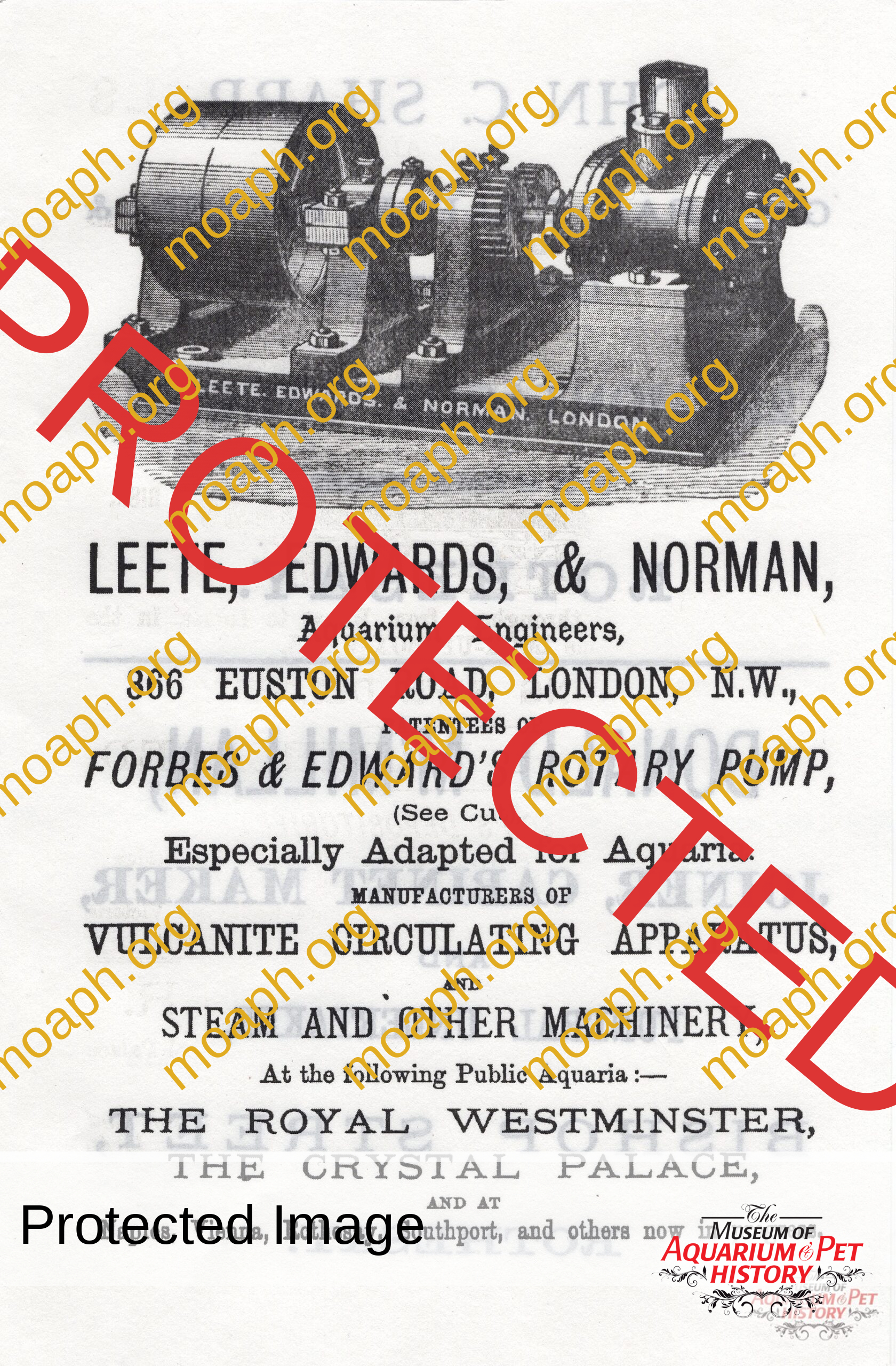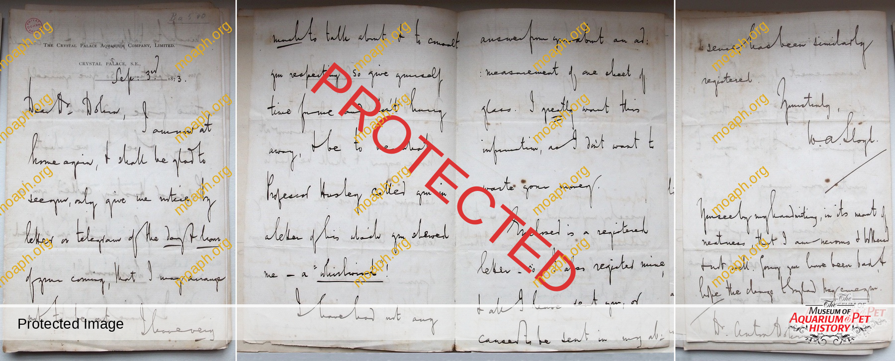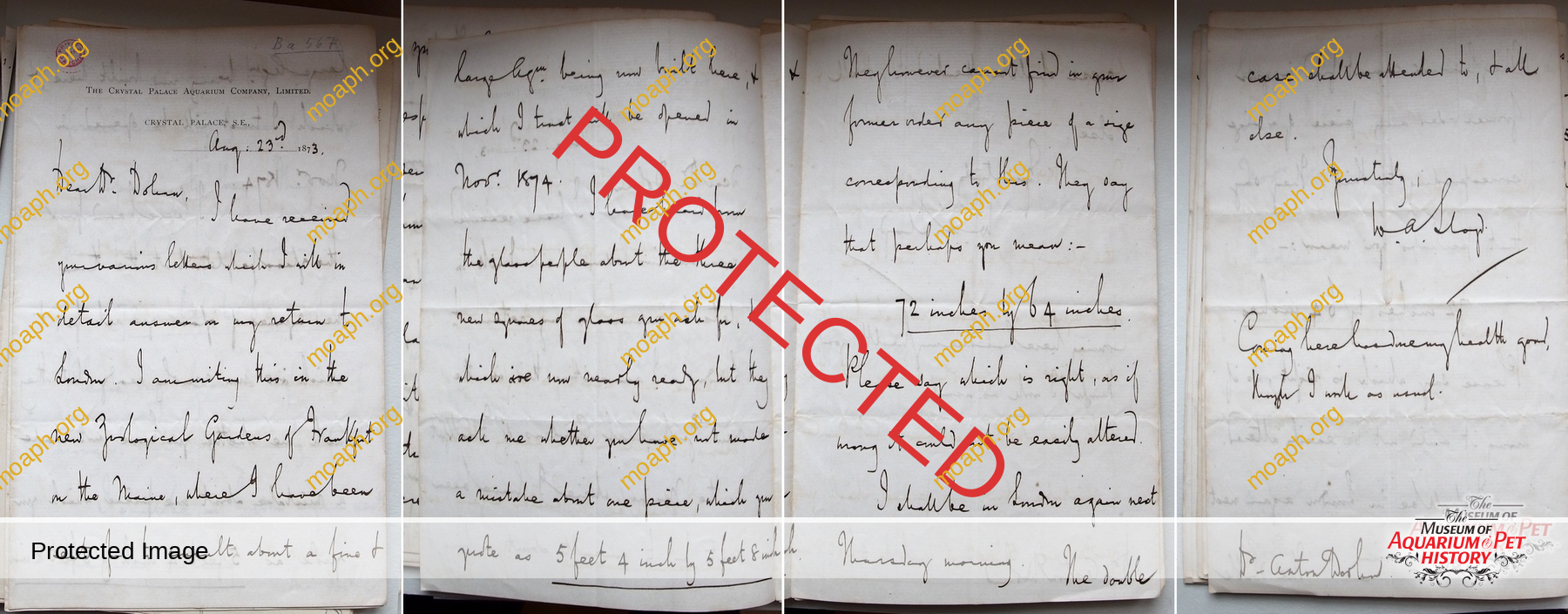 “…The glass, in 16 cases, weighing eight and a quarter tons (one ton English is 2240 pounds) is all packed and paid for, and the engines and most of the pipes are also packed. I saw the engines tried and worked successfully, and yesterday I similarly inspected the working of the pumps. Thus I give my personal attention to all your things, as far as it can be given. These pumps, and the remainder of the pipes will be packed by next Monday, and I have asked the shipping people to tell me by what vessel I had best forward all the goods really early next week. Leete and Edwards’ things will be in seven or eight cases, and will weigh about 3 1/2 tons. I have urged them by all means in my power and I believe they have done their best but with the best will I believe all such work presents hindrances which cannot be forseen. That L and E [Leete, Edwards & Norman] shall have no excuse for being slow, I have kept them well paid-up by successive cheques. They have asked me for another £100 tomorrow, but I shall give them only £50 and say all shall be handed them when everything is quite ready for shipment, so that will hurry matters. But at a little later period, they will leave one small and final arrangement to forward after the fitter is with you, and that will hinder nothing. I am doing all I can about the man, and he is preparing to come to you, and as we are here [the Crystal Palace Aquarium] having some changes made in our circulating system, I am having the same man to do them, by way of his learning, and preparing himself to serve you well. I am thus trying to forsee everything, and tomorrow I will go about the soft India rubber pipes, and use my own judgment as to quantity. You cannot do better than use our system here, with such soft pipes. You would have wasted much money had you done as you instructed L and E.