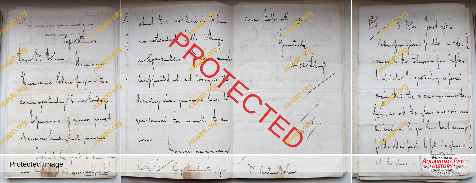 “Enclosed are letters. I will send them and this away tomorrow – Saturday – by the morn post. I also send you Goslett’s measurements of your glass. To be quite plain with you, I do not at all like this cutting-up, and I do not believe in its necessity, if you had but a competent theoretical engineer at Naples. […] If I add that I am anxious as you are to get all the monies I can to pay people, and so keep our credit good, it is merely to respect what you already know. So tell me all about all things. I assure you I m very honestly proud (not vain as you said the other day, A.D.) to be connected with this great “station” affair and it is natural that I should be so after all the struggles I have gone through for aquaria for twenty years. See the first number of my narrative enclosed.