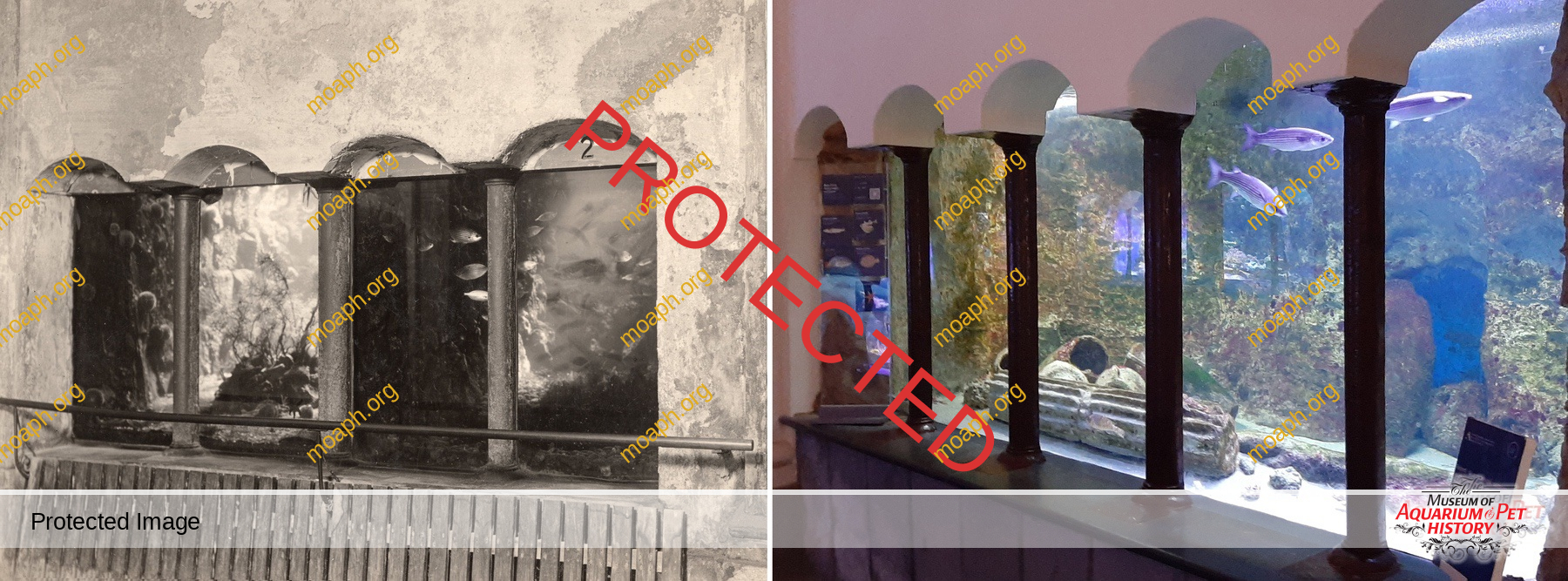 Tanks n. 1 and 2 at the Naples aquarium. Notice the sunlight coming from the skylights on the roof. ©Stazione Zoologica Anton Dohrn, Archivio Storico (ASZN, 1.Lb.6.1.22). On the right, the Aquarium as it looks today.
