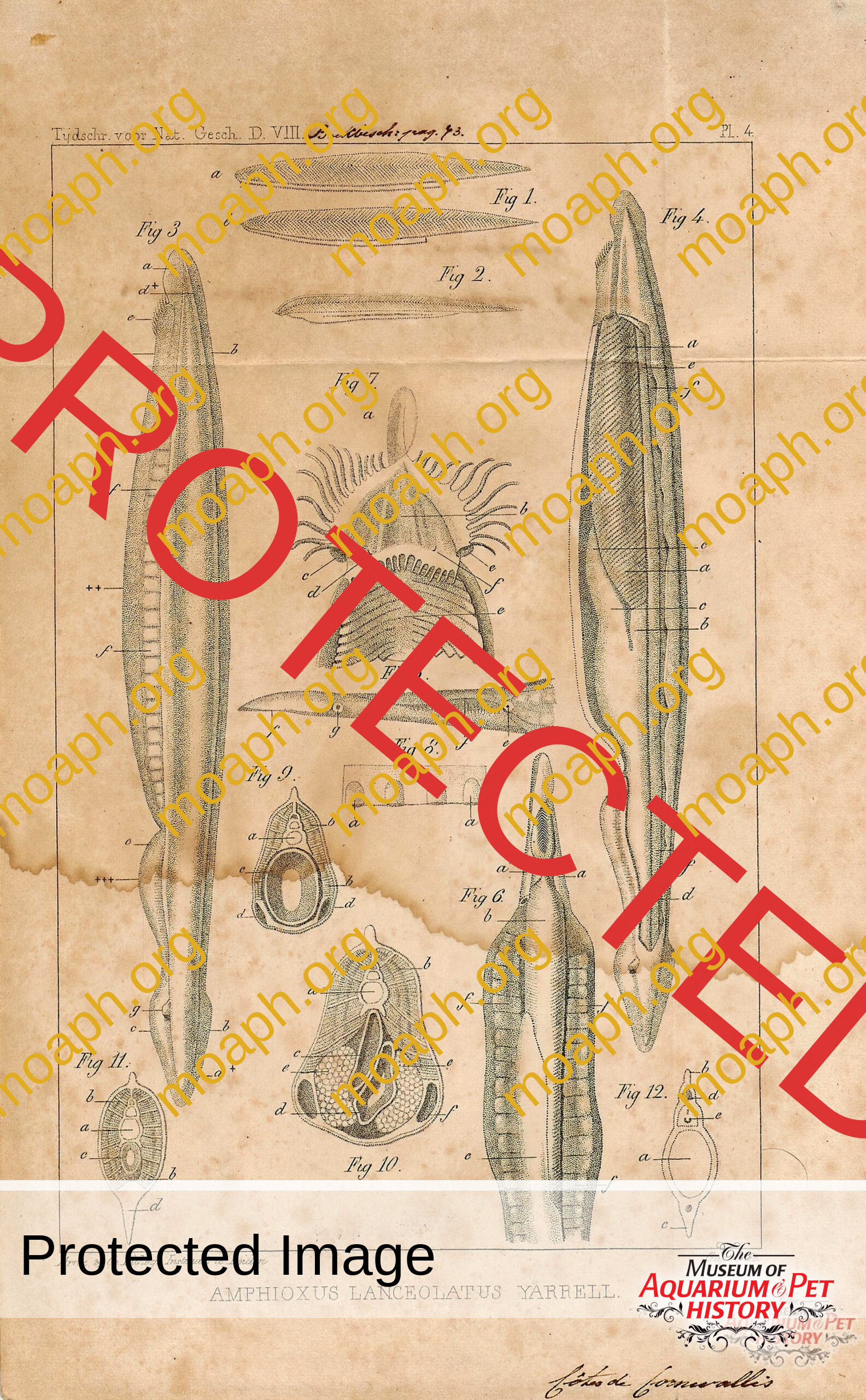 I am just as eager as ever to get new animals for our Aqm. […] Your Amphioxus [Branchiostoma lanceolatum] are all right, and I am very proud of them. These are the lowest fish in our collection here – our highest being Labrax, and our mortality is very small indeed. We do not obtain our success by dishonest means, as by cohabiting Reptilia, Aves, and Mammalia, as at Brighton and Berlin. We strictly and severely confine ourselves to non-lung healthy animals, from Sponges to Fishes, and I hope you will do the same, though the vulgar people – rich or poor – cannot see why I so object to lung-breathing animals. At Brighton they have Seals (Phoca) and otters (Lutra) and I believe Birds are coming. This is an insult to science. Certainly, all animals are interesting, but if words are to have definite meanings as expressive of ideas – such exhibitions should not be called Aquaria. An Aqm is an arrangement in which unchanged water is preserved in respirable condition for animals which respire it and therefore if one introduces animals for whom water is not a respiratory medium – but only a medium for motion, as Turtles (Chelonia) and the other animals I have named, their whole significance is lost, and we get Chaos back again. […]