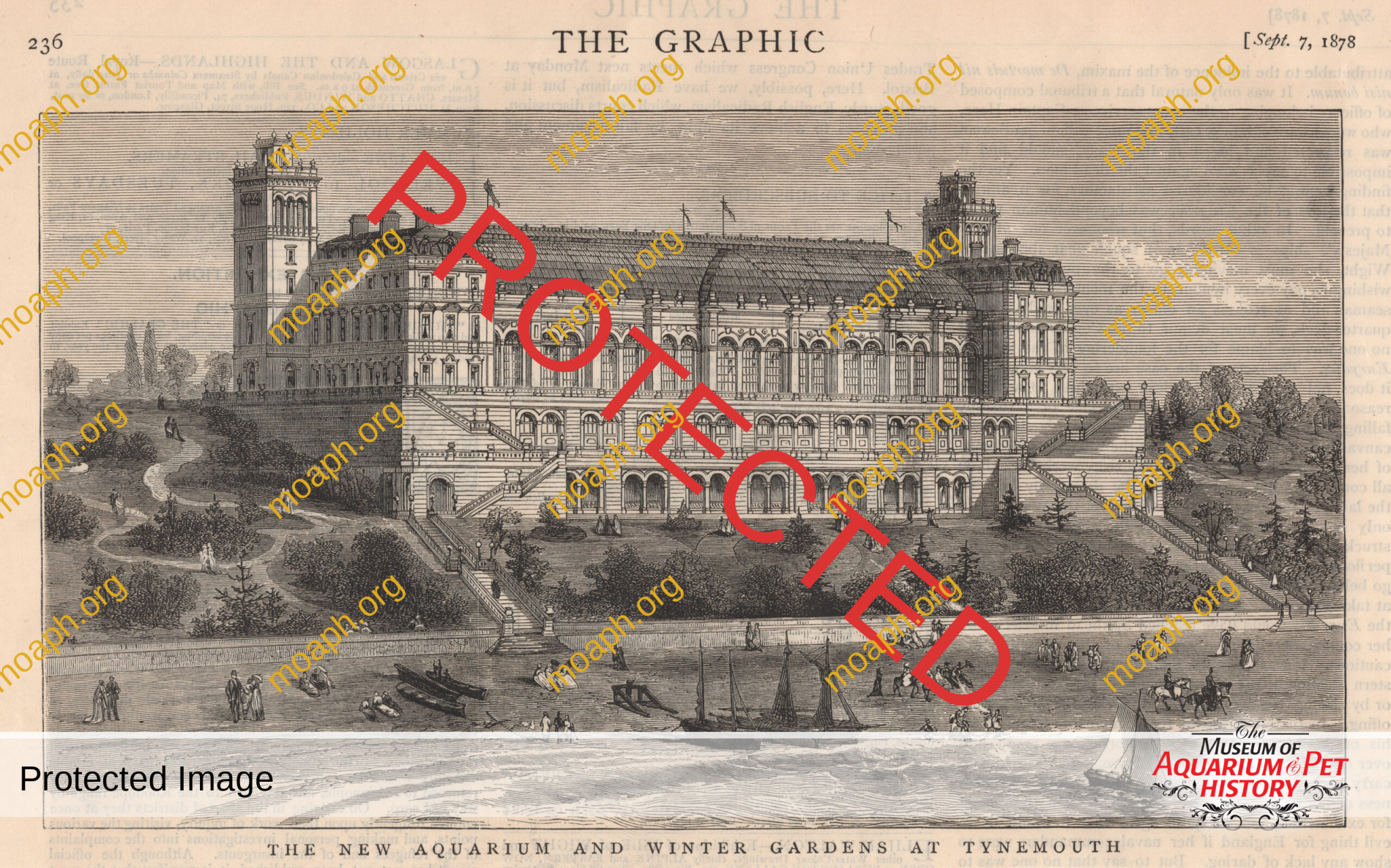 The Tynemouth Aquarium and Winter Garden was a short-lived establishment which failed and was sold at auction in 1880. Illustration from the weekly newspaper The Graphic (September 7, 1878).