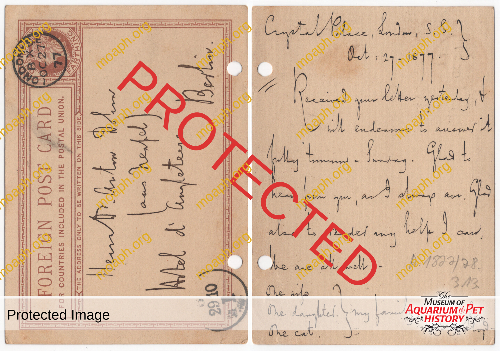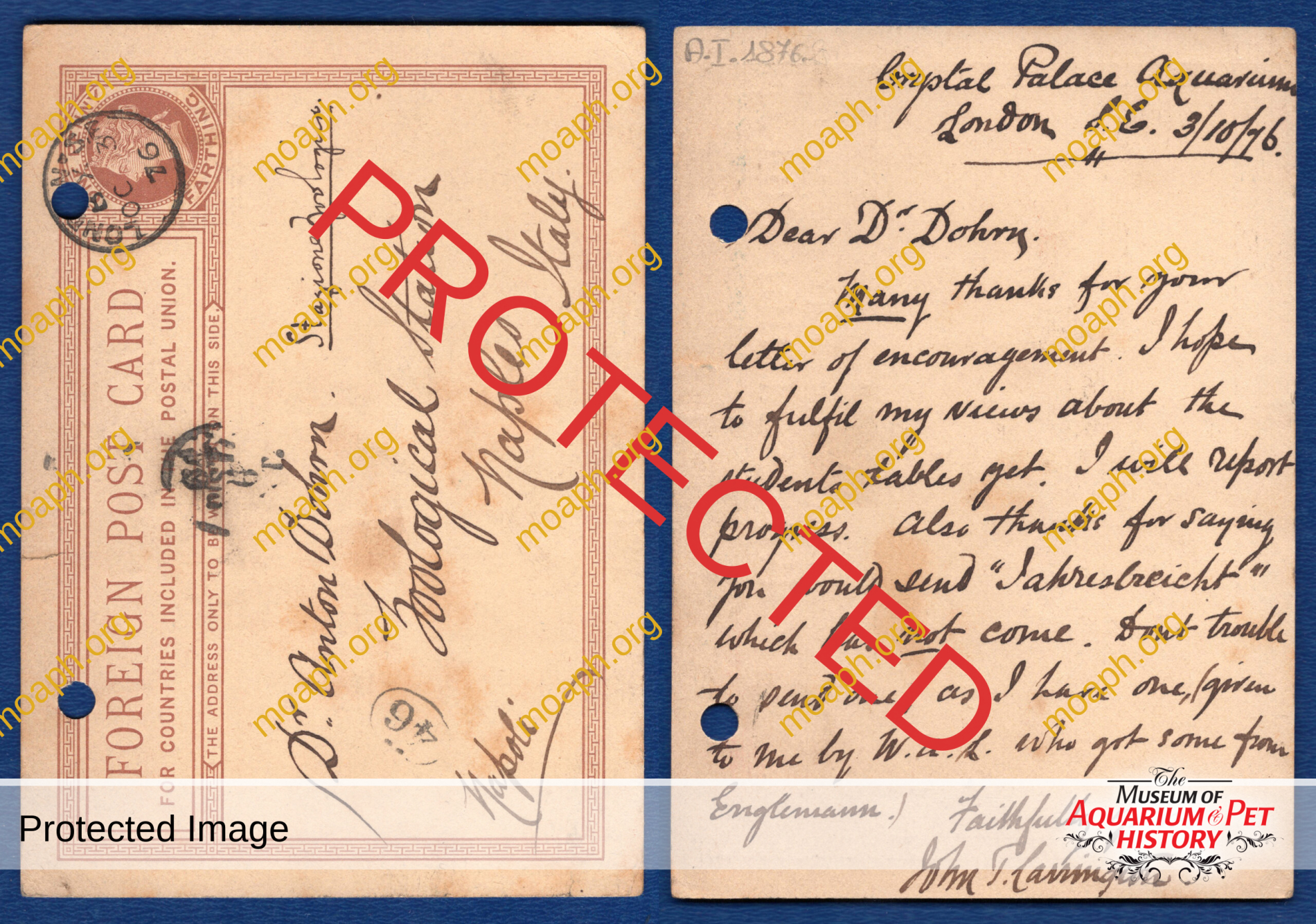 I fear I can never visit Naples till I am sent there on business at the cost of somebody other than my own. I can less than ever now afford it, because in consequence of our lessened Aqm income here, I have had to give up £200 out of the £400 a year I formerly had, and to lose one half of one’s wages is so serious a thing that I am now compelled to earn the other half by my pen, or by advising aquarium companies, etc, etc. which is very hard work especially as my book has to be written and till I sell it, it brings me nothing. I now never travel on pleasure, and never have any summer holiday, but whenever I am not out, I am, with my dear old cat, hard at work in my underground study in Lower Norwood. I am much obliged for your asking for her. She and my wife and daughter are all quite well, and send their kindest regards to you, and Mrs Dohrn, and little Boguslaw [Dohrn’s firstborn]. And we are much disappointed at your not coming to England – all of you – this summer. Have you any marmalade left? I have been disappointed as to my aqm pupils, of whom I have had three – Carrington, Birchall and Barker. The latter was such a poor devil that I taught him gratis, and got him a situation at £200 a year and a bonus. But he is careless now of me, as nothing more is to be got from me. Carrington and Birchall came for £50 each for six months, but as they had not too much money I voluntarily took only £25 each, letting the other £25 be till they had got their places. I kept them 12 months – not 6 – and got Carrington to Westminster [aquarium] or helped to get him there – at £200 a year, and Birchall to Yarmouth [aquarium] at £200 a year. I then when they had been engaged 6 months asked them to pay each his £25 at 10/- a week, thus spreading it over a year. They promised doing so but never kept their word, and now my lawyer is pursuing them, as I cannot allow them to set me at defiance, much as I dislike law. Carrington is now at Naples, getting animals for the Westminster Aqm. I advise you not to give credit as the Westr Aqm is not in a good state. You see the things which there goes on from this advertisement in the Times of Oct 29th, 1877.
