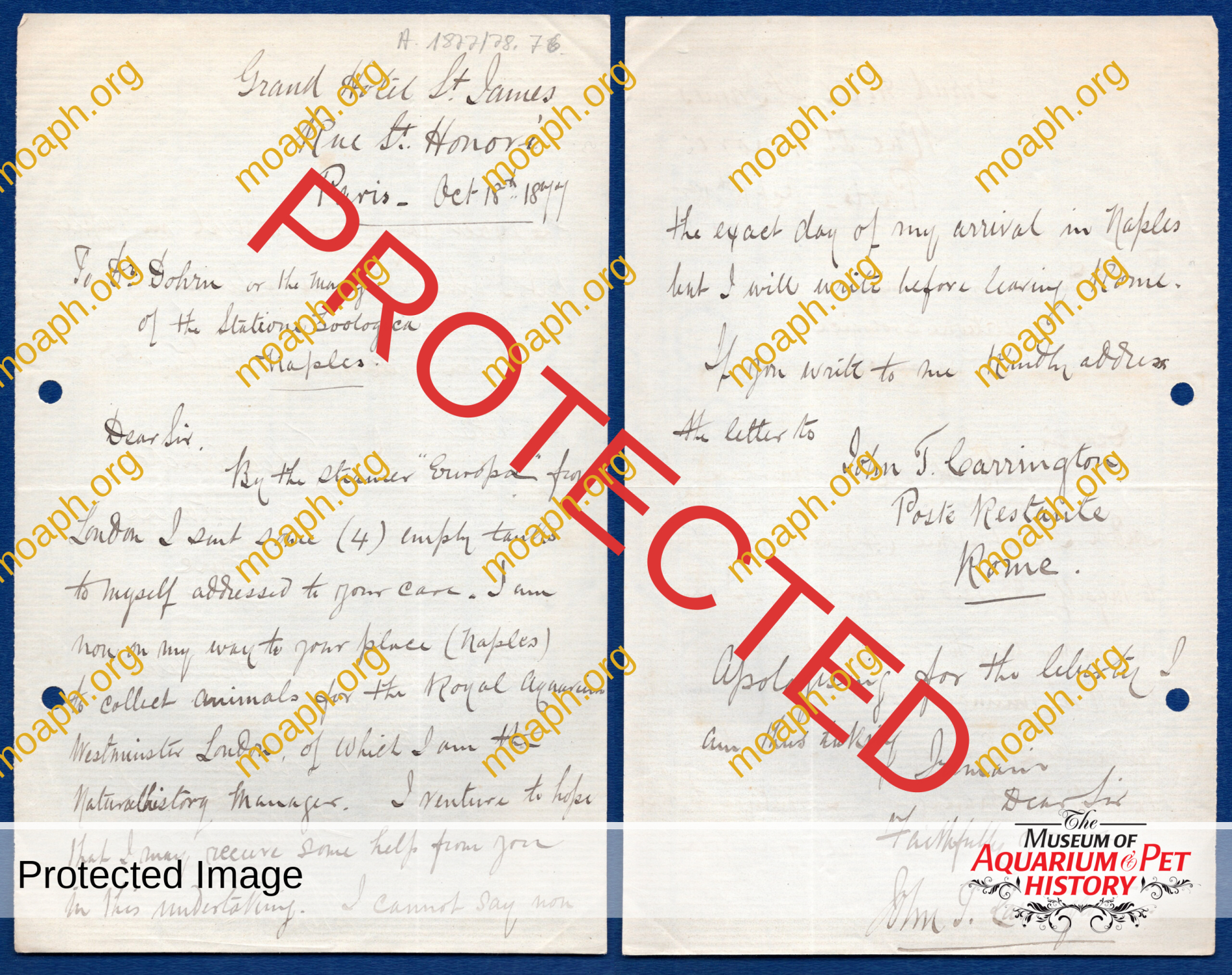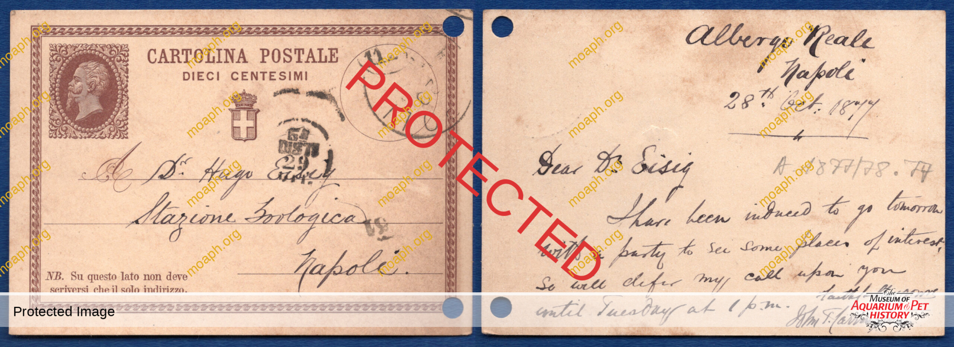 Postcard from Carrington to Hugo Eisig dated October 28, 1877. Eisig (1847-1920) was the deputy director of the Zoological Station. ©Stazione Zoologica Anton Dohrn, Archivio Storico (ASZN, 1. A.I.1877.C.).