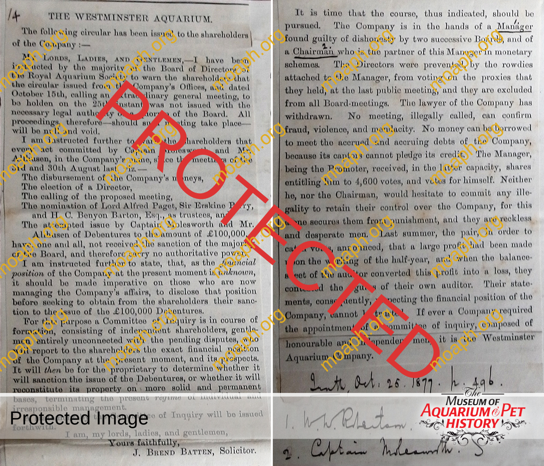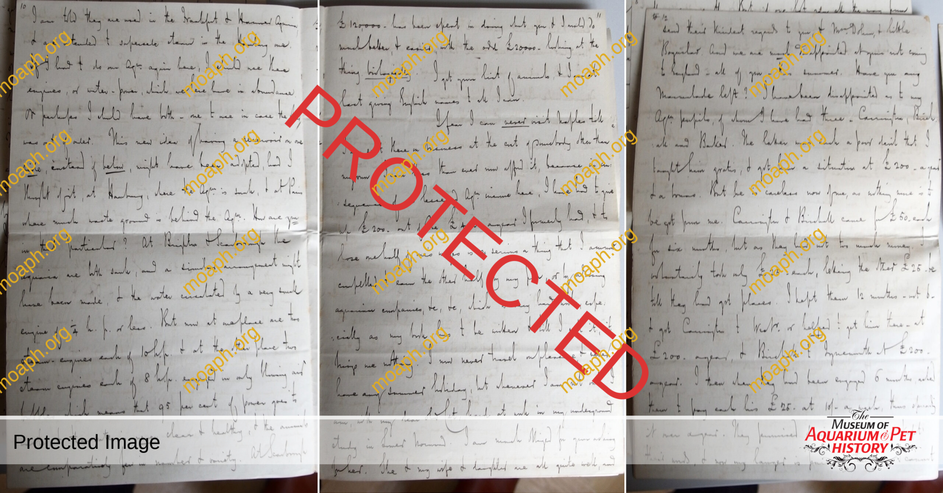“Yesterday I sent you a postcard saying I today would fully answer your letter of Oct 23. I want to do so. As far as can now be told, my introduction of asphalt in aquaria is successful. I call it my introduction, because it is true, but like most other improvements it was at first opposed unreasonably. There are now two great public aquaria asphalted – at Yarmouth and at Westminster, and no ill results seem to have followed to any animals. This is of course negative evidence, but I have not been able to afford the cost of having a complete chemical analysis made of the water long in contact with it. I however, possess many samples of water which would afford a severe test. Some of this water is at the service of you or anyone else, free of cost. Asphalt is being used now in a large aquarium erecting at Tynemouth. But care and patience are needed in using it. Of this has just occurred an example at Westminster where in spite of all my protests it was applied hot to the surface of wet masonry.