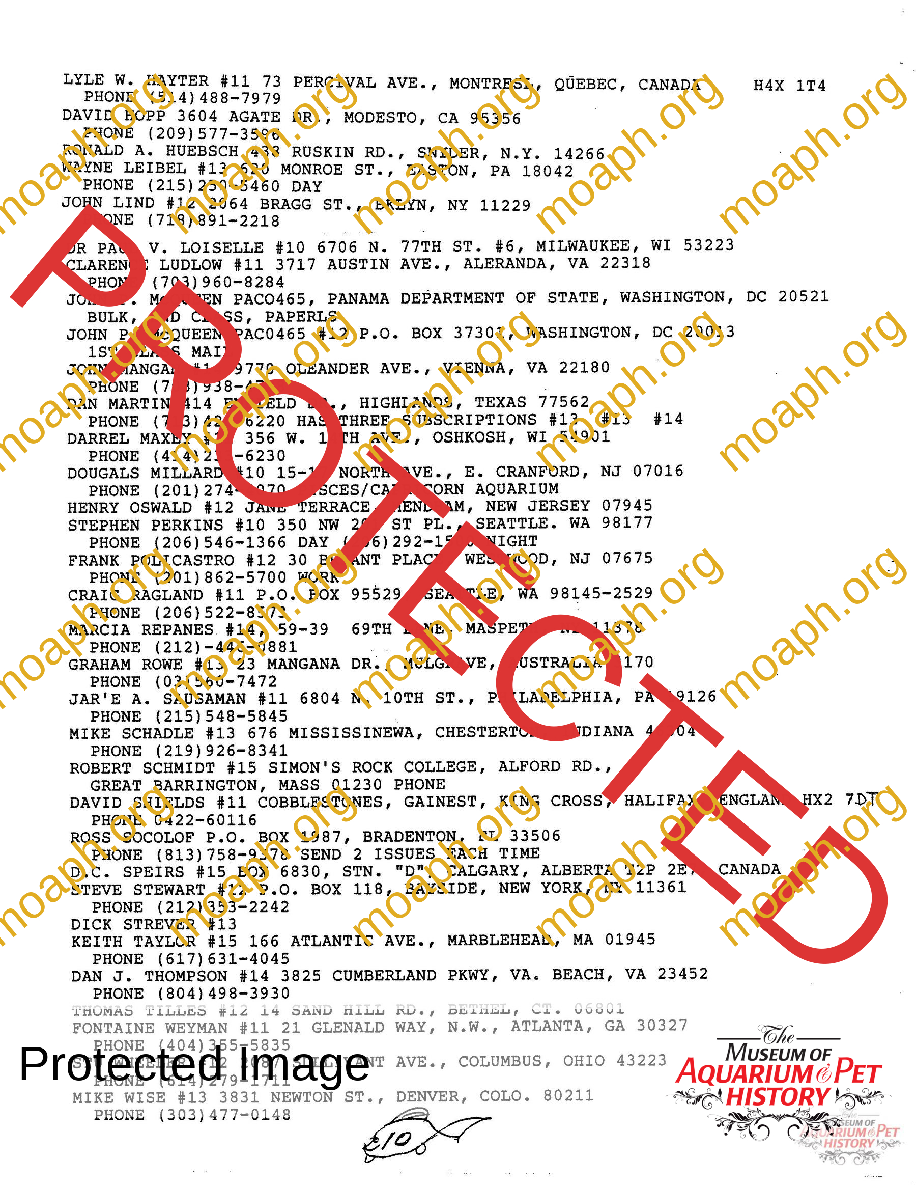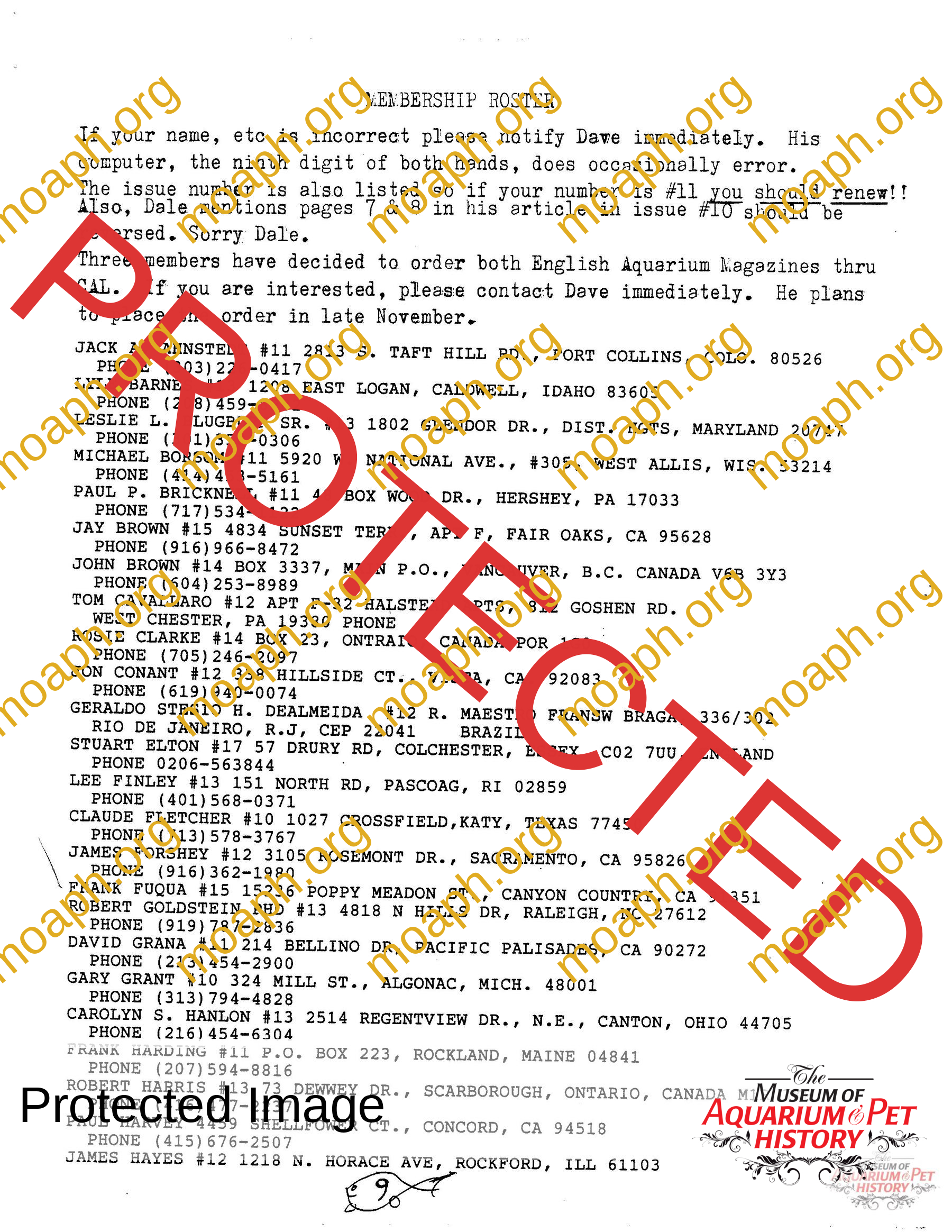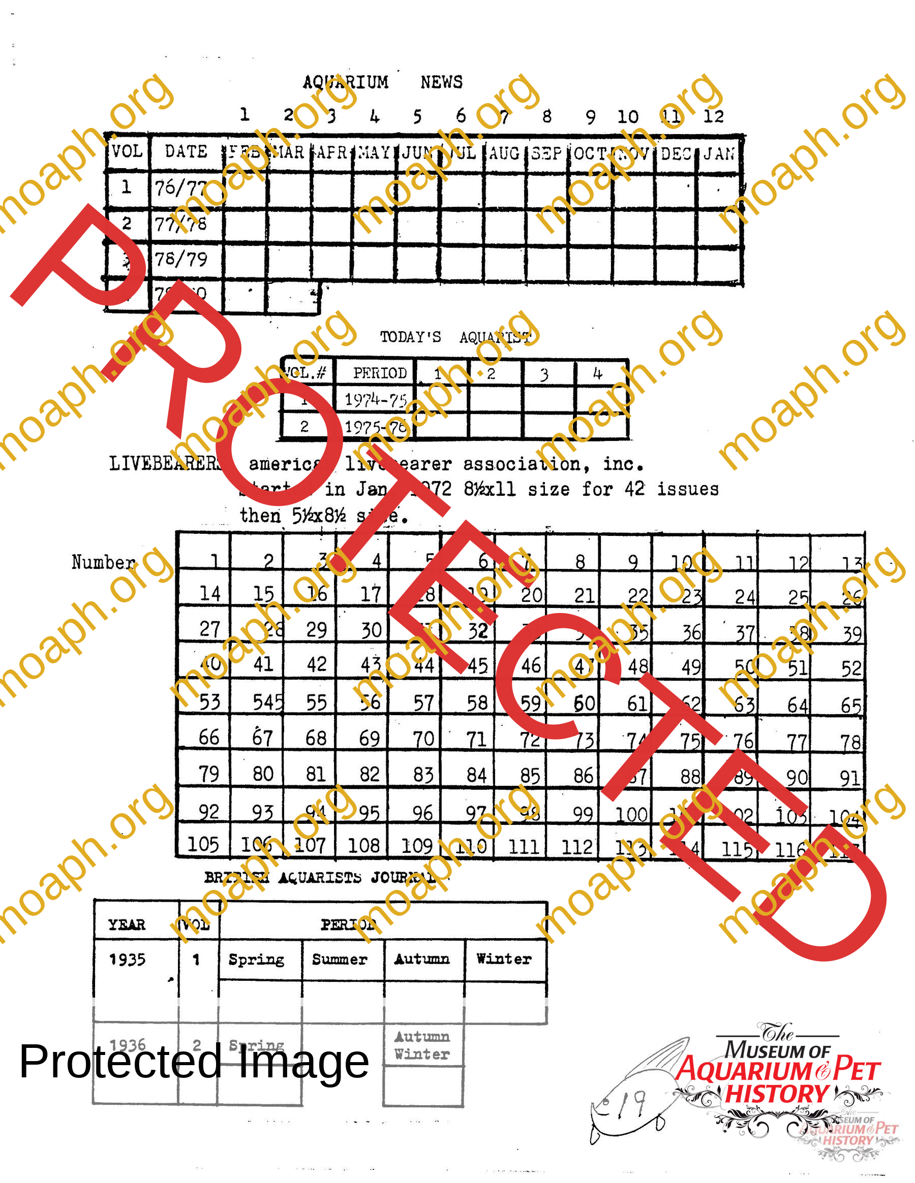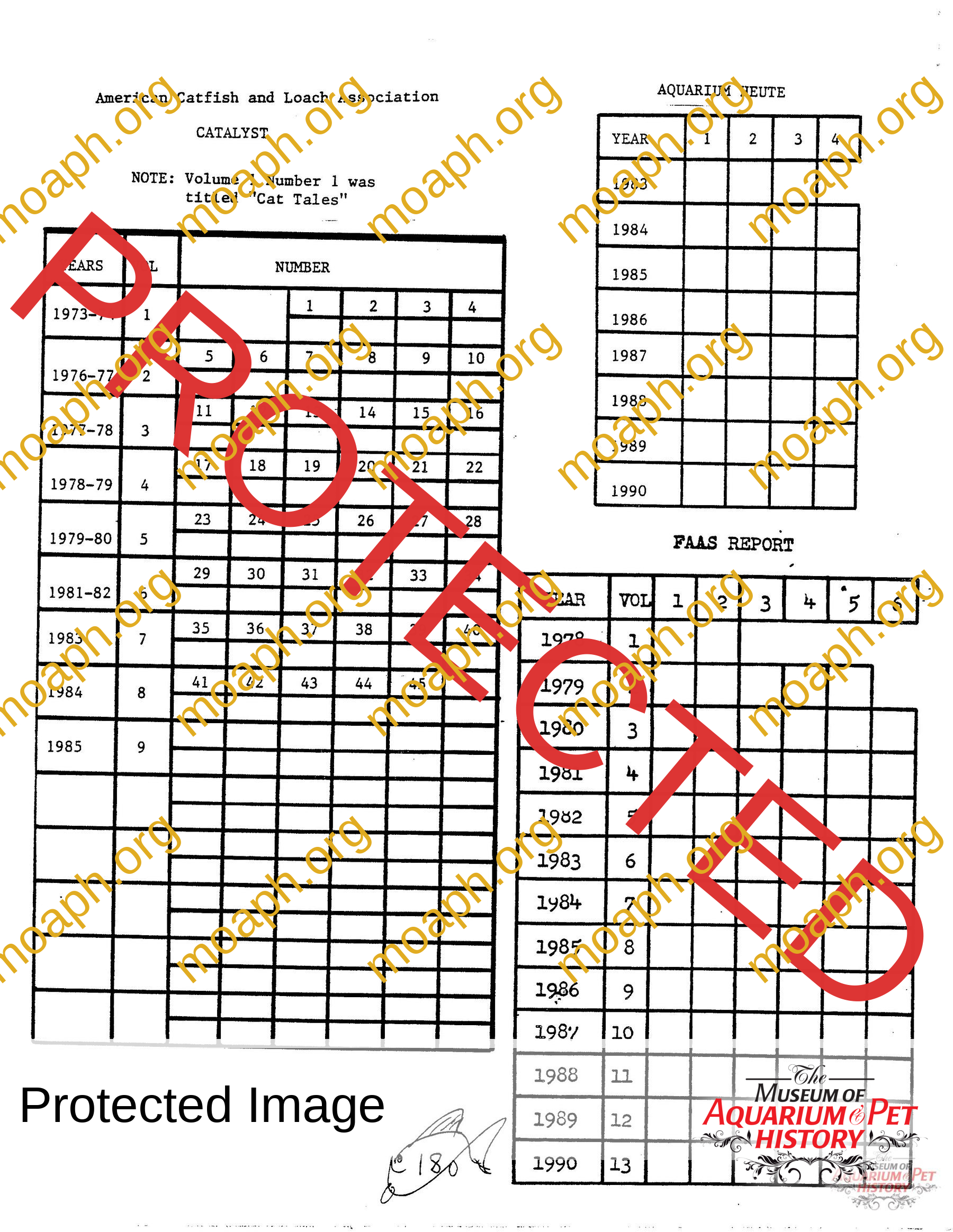 The collectors of aquarium literature was an organization founded by Dave Hopp and Paul Harvey to better organize those who collected vintage aquarium magazines and books. Each issue had articles on aquarium publication history plus articles related to book and magazine collecting in general. This publication ran from May 1983 through June 1994 for a total of 55 issues. (August through November 1988 was a combined issue 25/26 and March through July 1989 was marked 29/30 1989.)