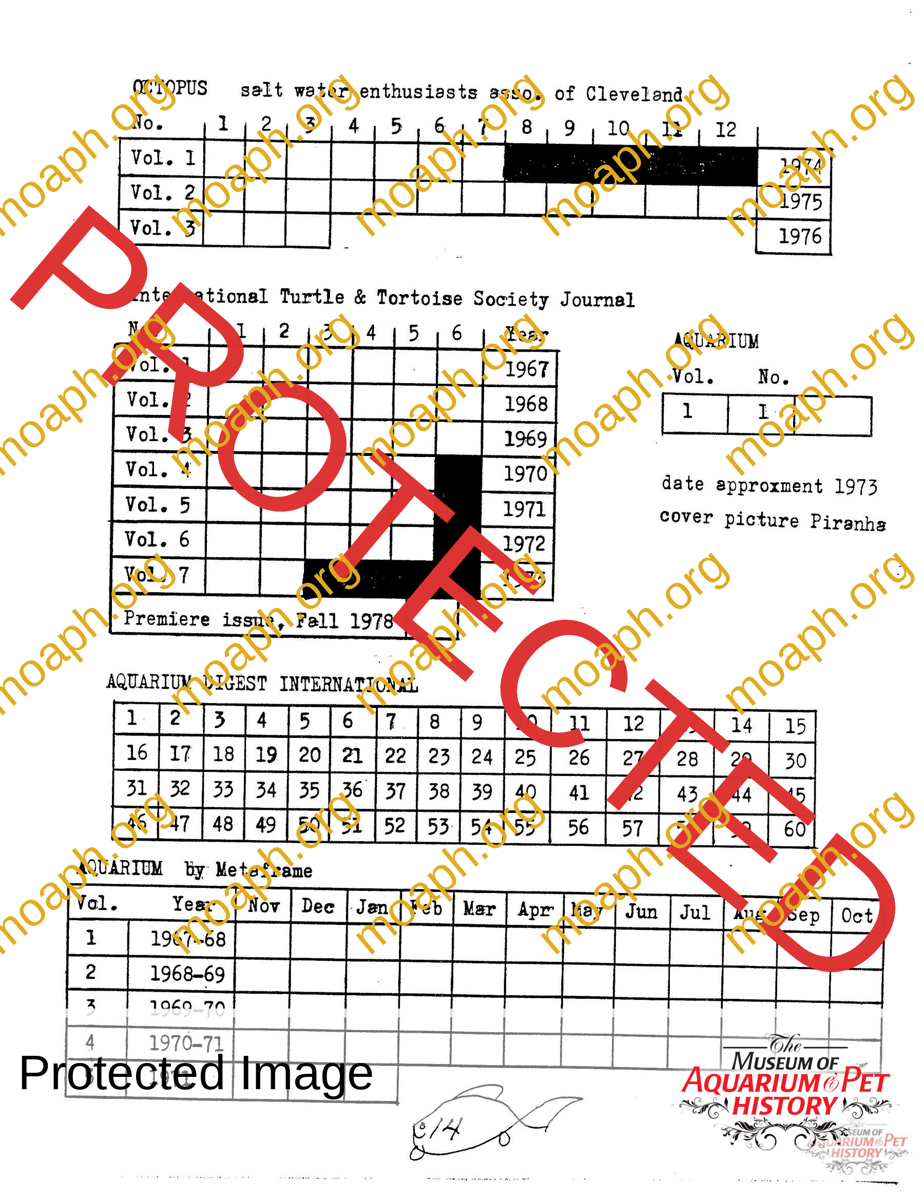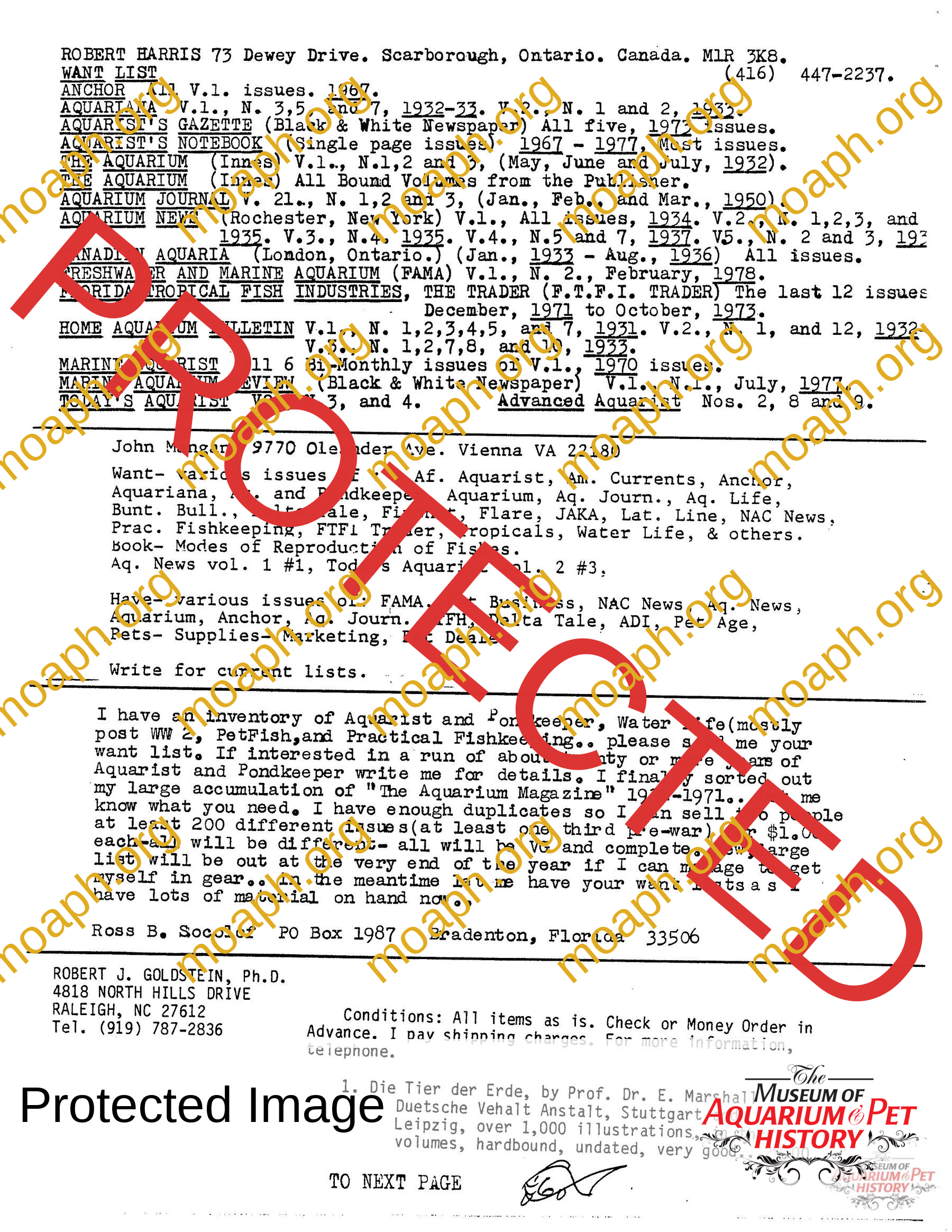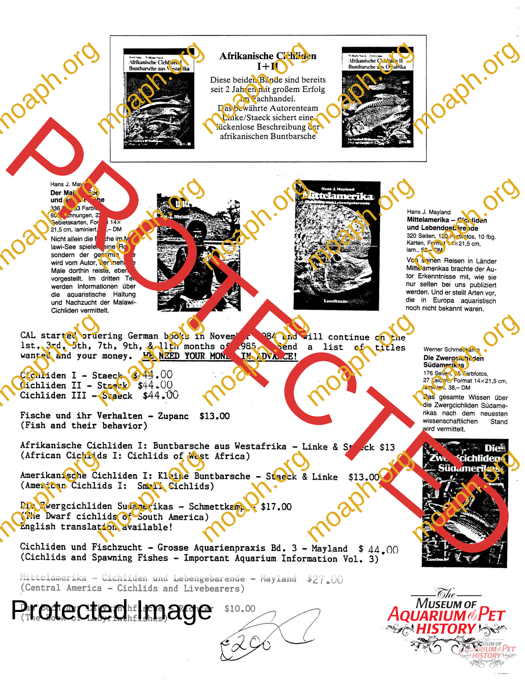 The collectors of aquarium literature was an organization founded by Dave Hopp and Paul Harvey to better organize those who collected vintage aquarium magazines and books. Each issue had articles on aquarium publication history plus articles related to book and magazine collecting in general. This publication ran from May 1983 through June 1994 for a total of 55 issues. (August through November 1988 was a combined issue 25/26 and March through July 1989 was marked 29/30 1989.)