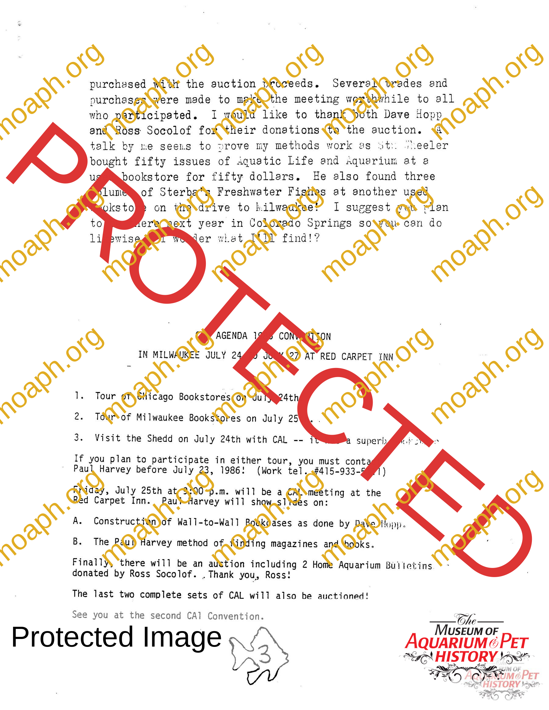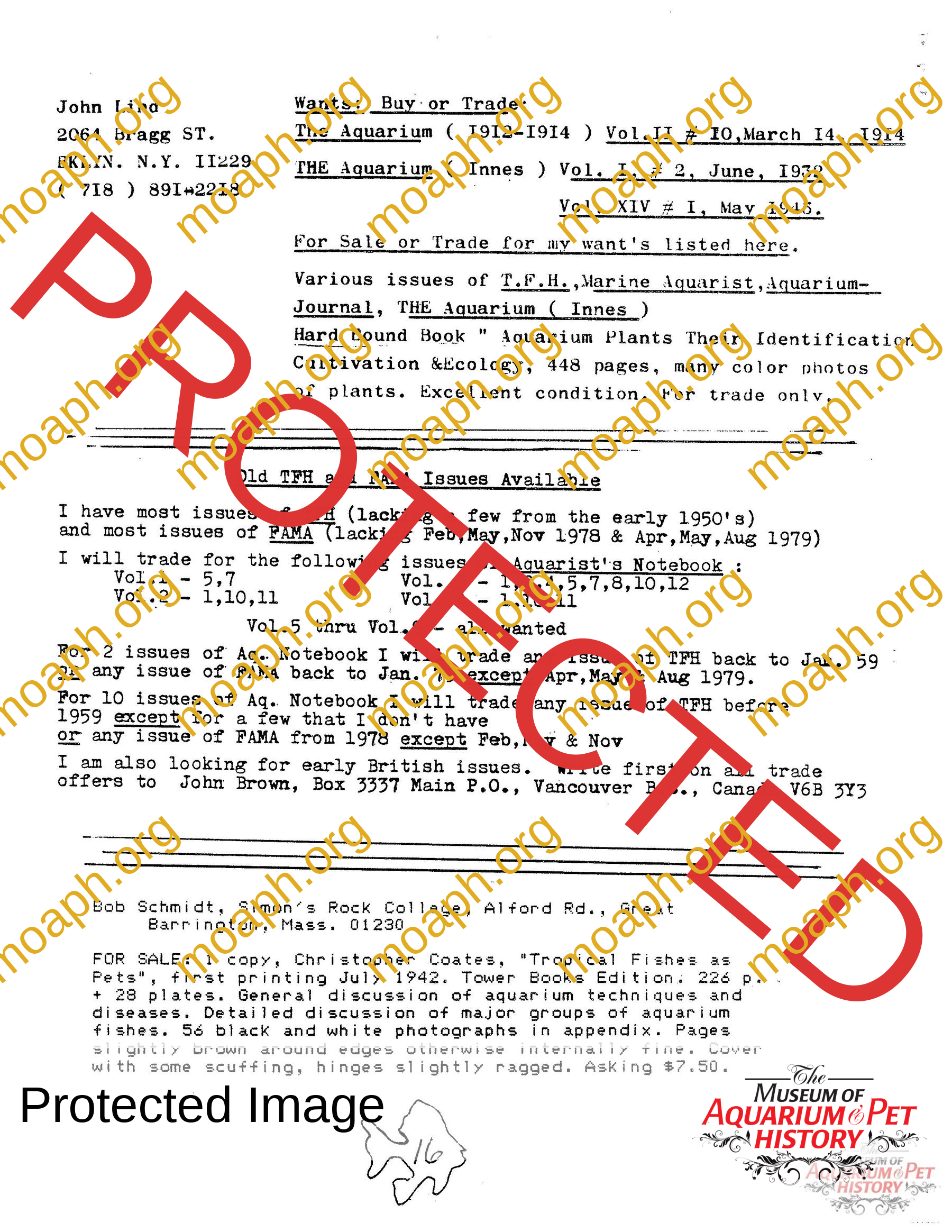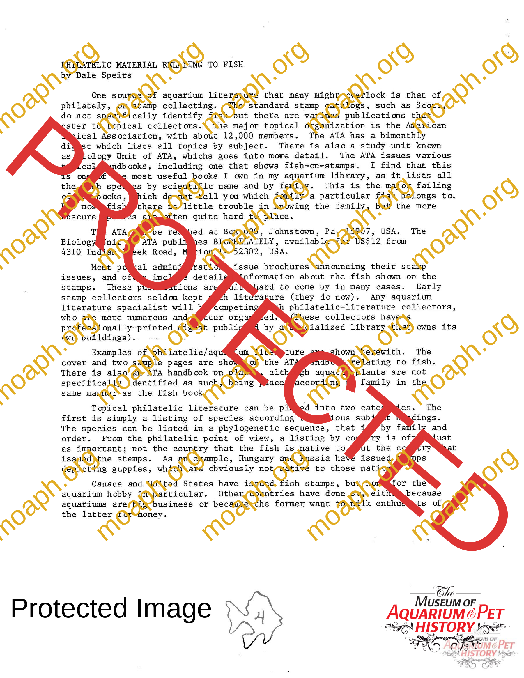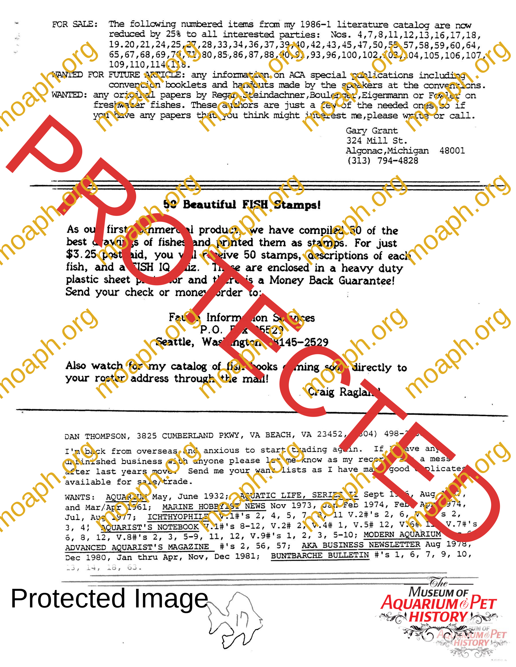 The collectors of aquarium literature was an organization founded by Dave Hopp and Paul Harvey to better organize those who collected vintage aquarium magazines and books. Each issue had articles on aquarium publication history plus articles related to book and magazine collecting in general. This publication ran from May 1983 through June 1994 for a total of 55 issues. (August through November 1988 was a combined issue 25/26 and March through July 1989 was marked 29/30 1989.)