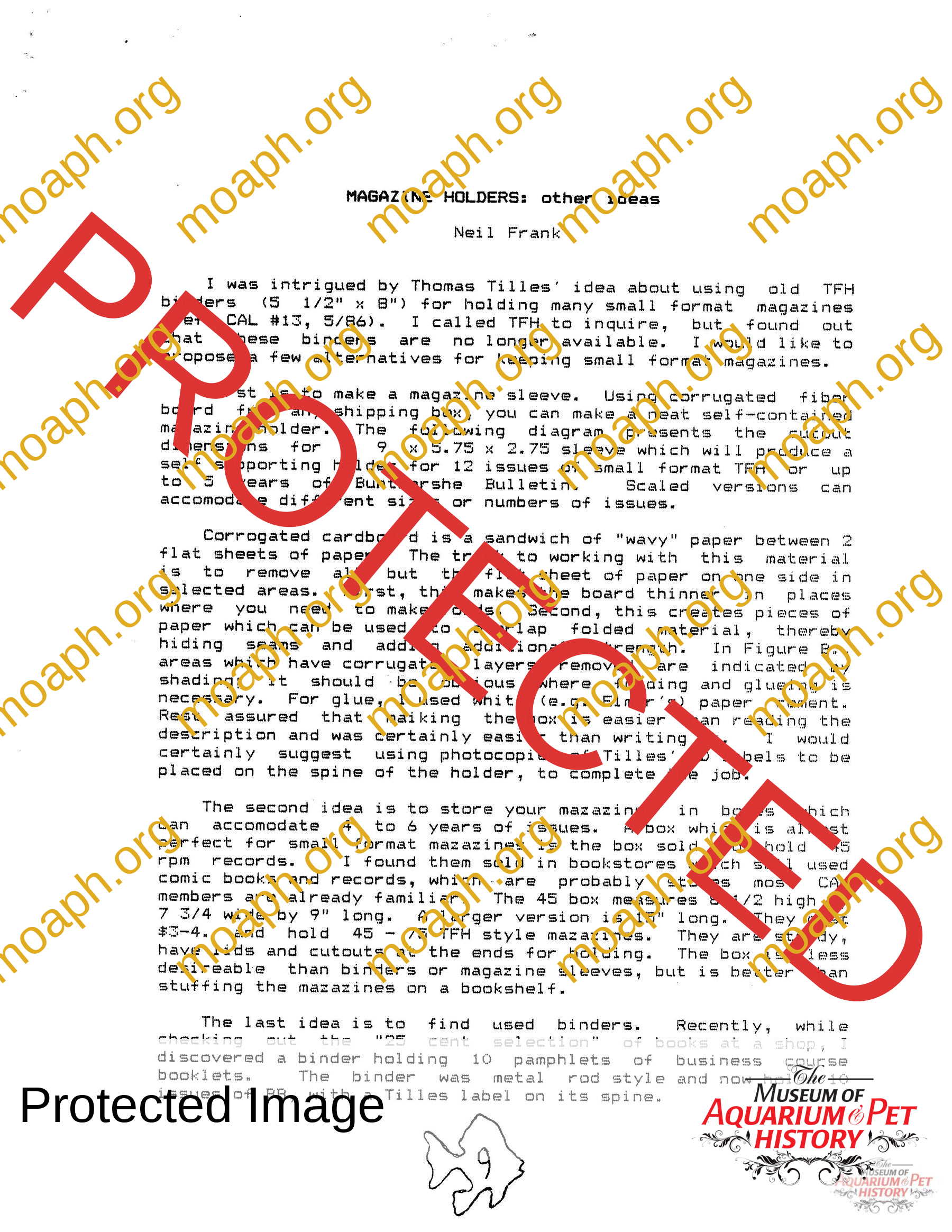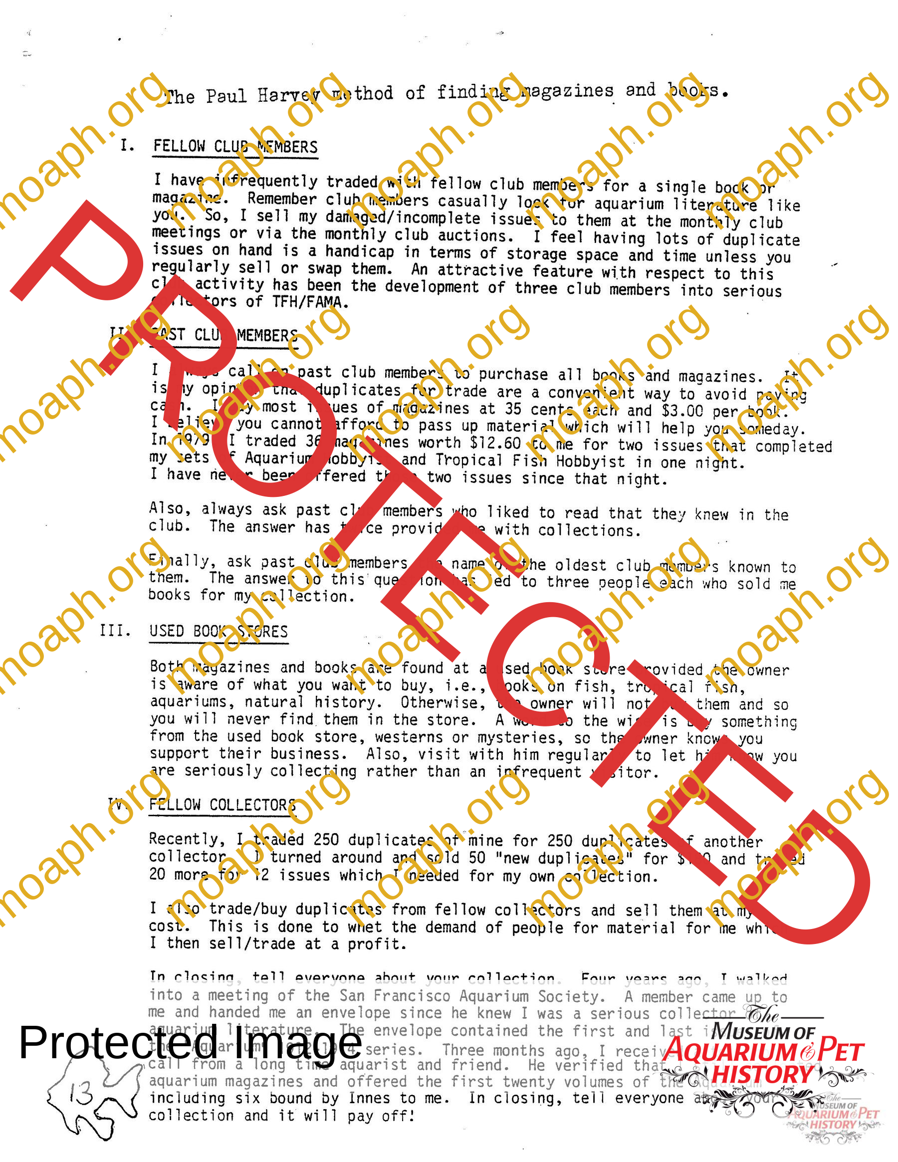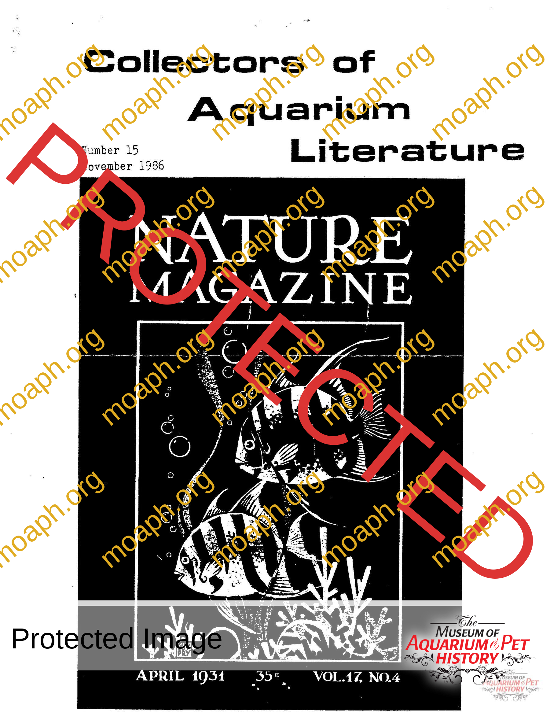 The collectors of aquarium literature was an organization founded by Dave Hopp and Paul Harvey to better organize those who collected vintage aquarium magazines and books. Each issue had articles on aquarium publication history plus articles related to book and magazine collecting in general. This publication ran from May 1983 through June 1994 for a total of 55 issues. (August through November 1988 was a combined issue 25/26 and March through July 1989 was marked 29/30 1989.)