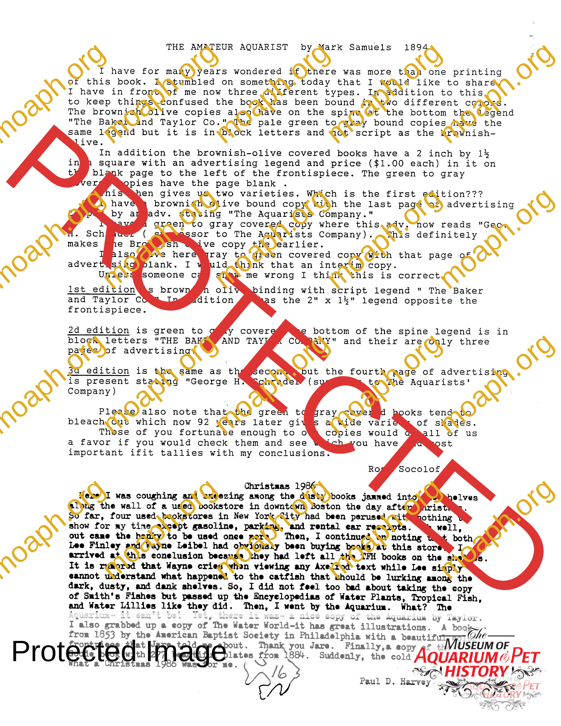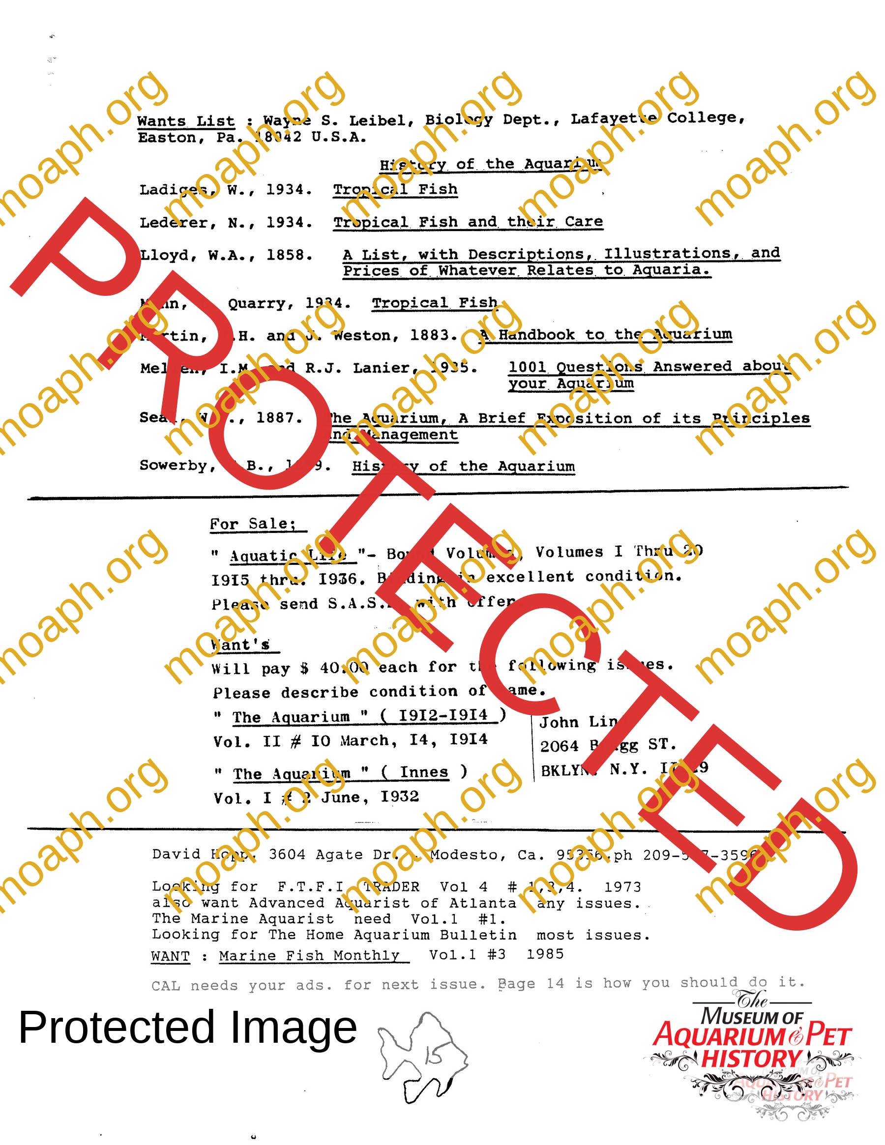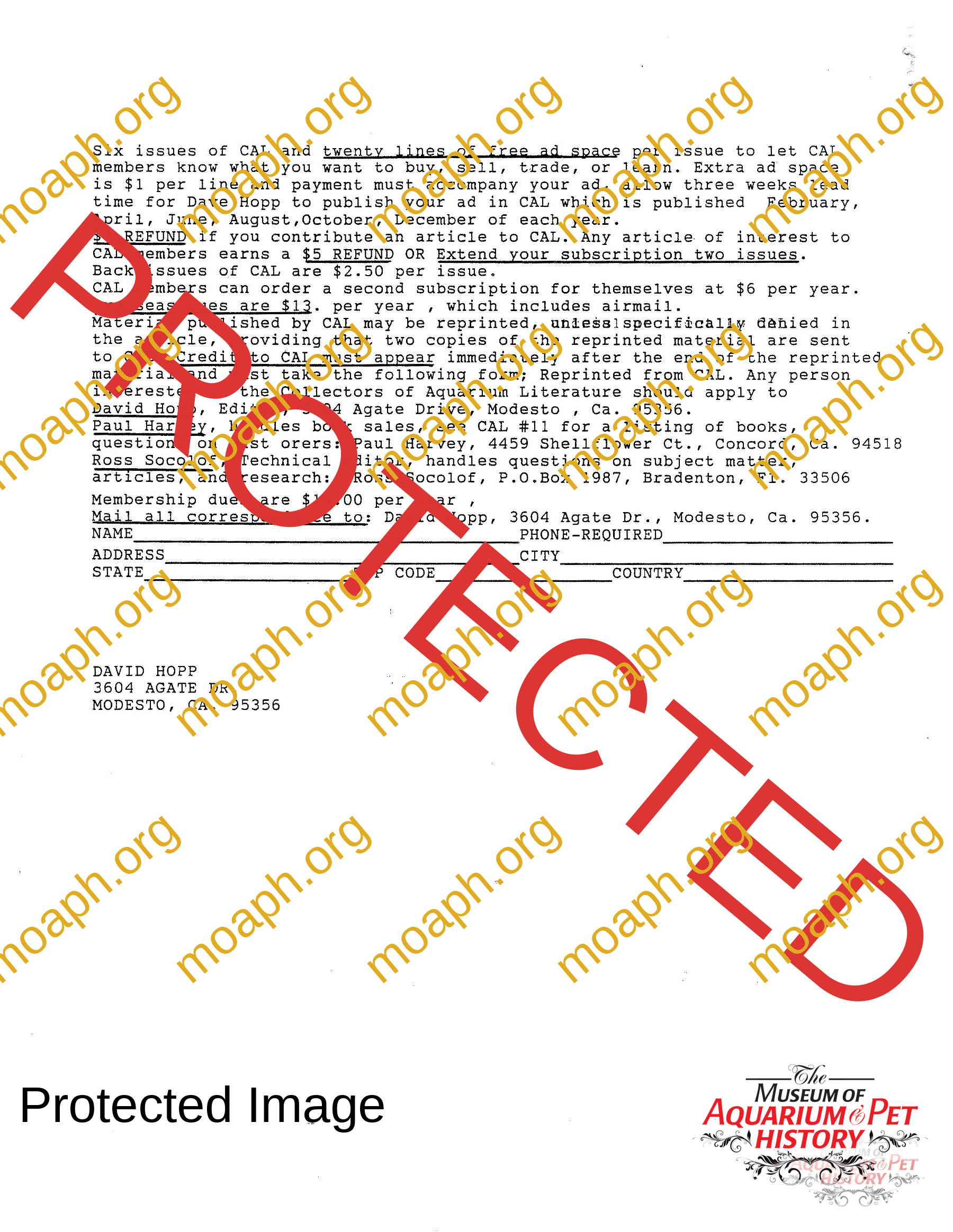 The collectors of aquarium literature was an organization founded by Dave Hopp and Paul Harvey to better organize those who collected vintage aquarium magazines and books. Each issue had articles on aquarium publication history plus articles related to book and magazine collecting in general. This publication ran from May 1983 through June 1994 for a total of 55 issues. (August through November 1988 was a combined issue 25/26 and March through July 1989 was marked 29/30 1989.)