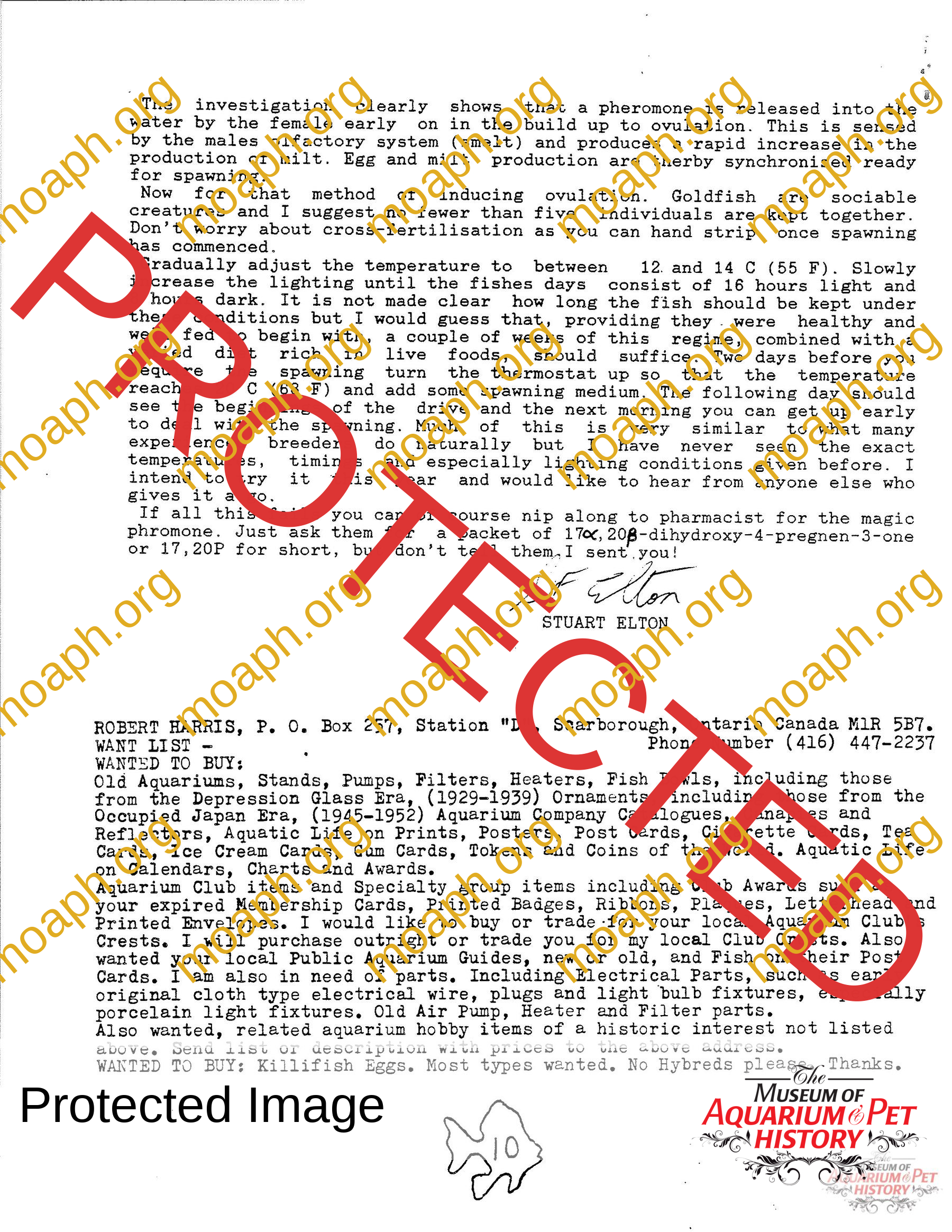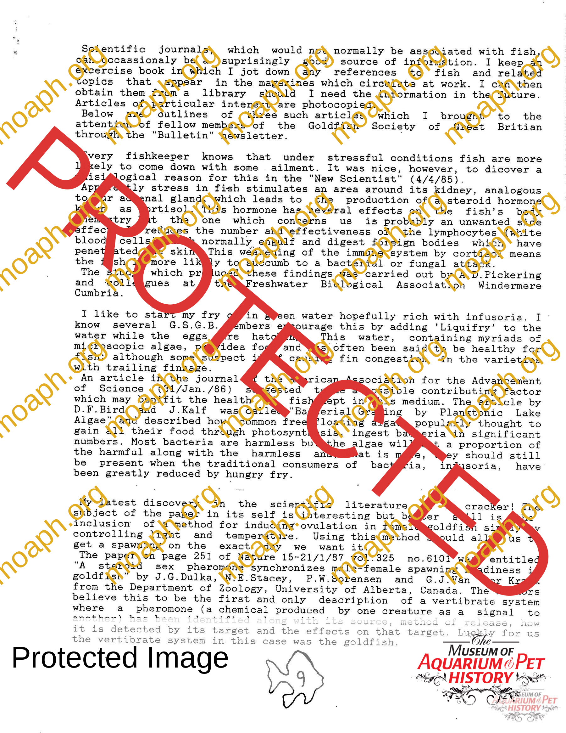 - Outline of three fish articles shared with the Goldfish Society of Great Britain. The first article is about stress caused sickness in fish from “New Scientist” published 4/4/85, the second is about rearing fry in green water from the journal of the American Association for the Advancement of Science published 01/31/86, and the third is about inducing ovulation in goldfish from Nature published January 1987.