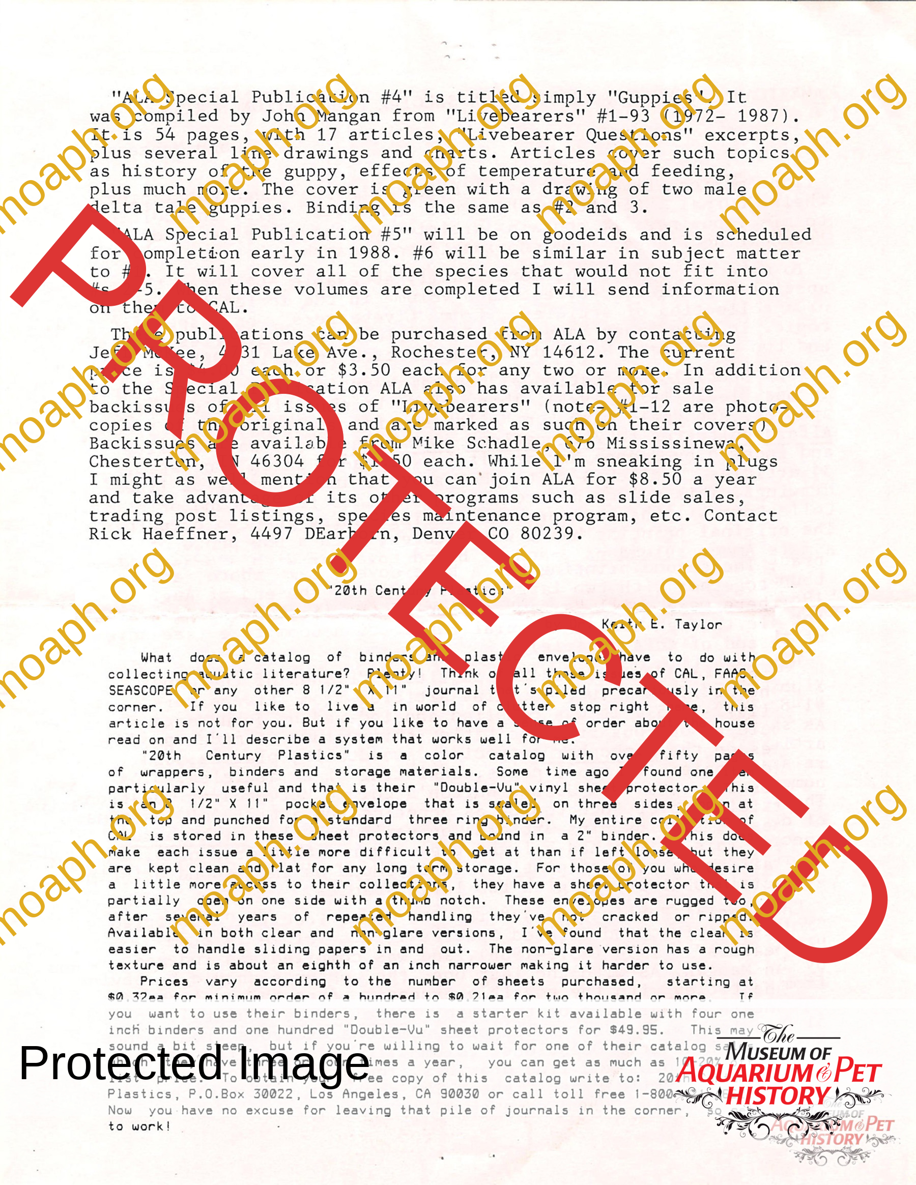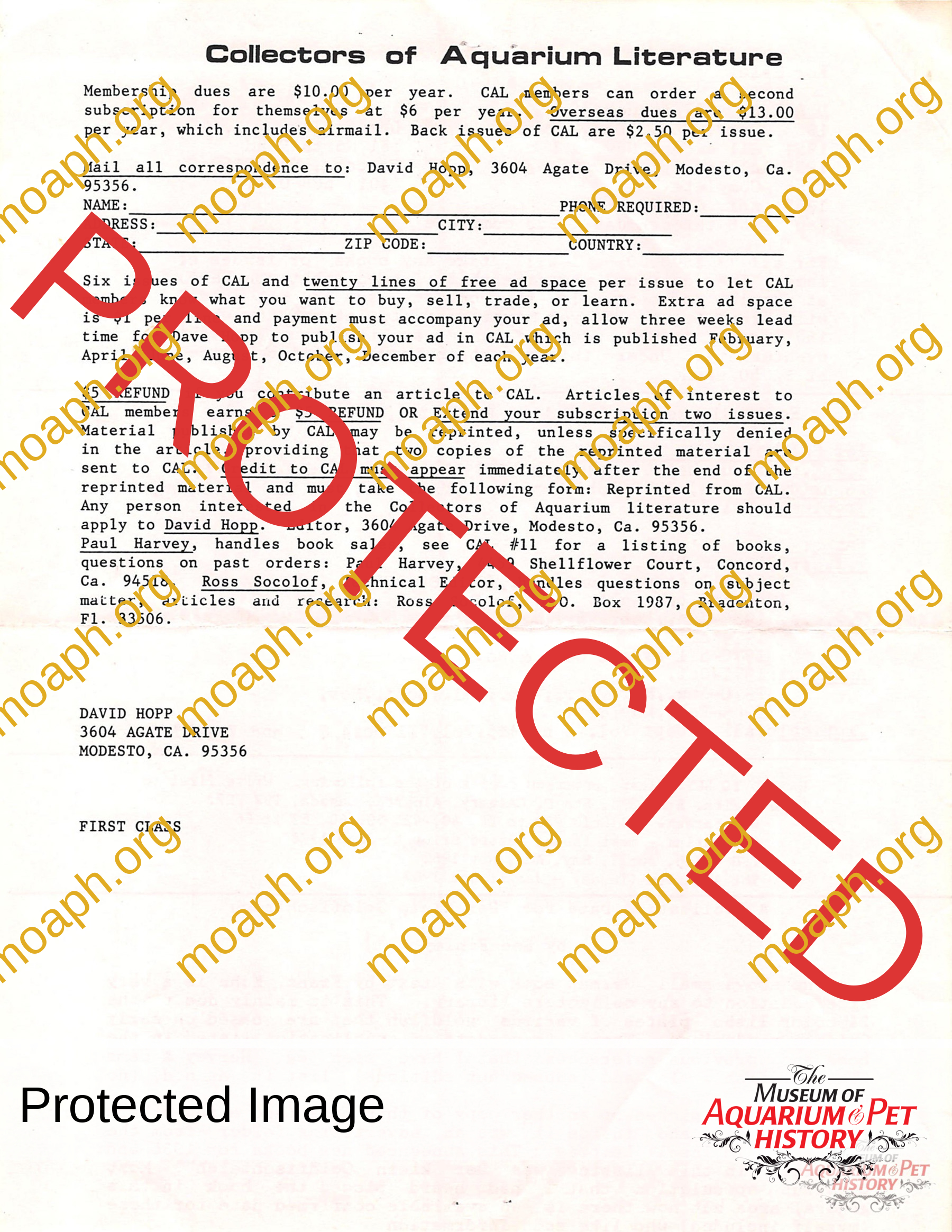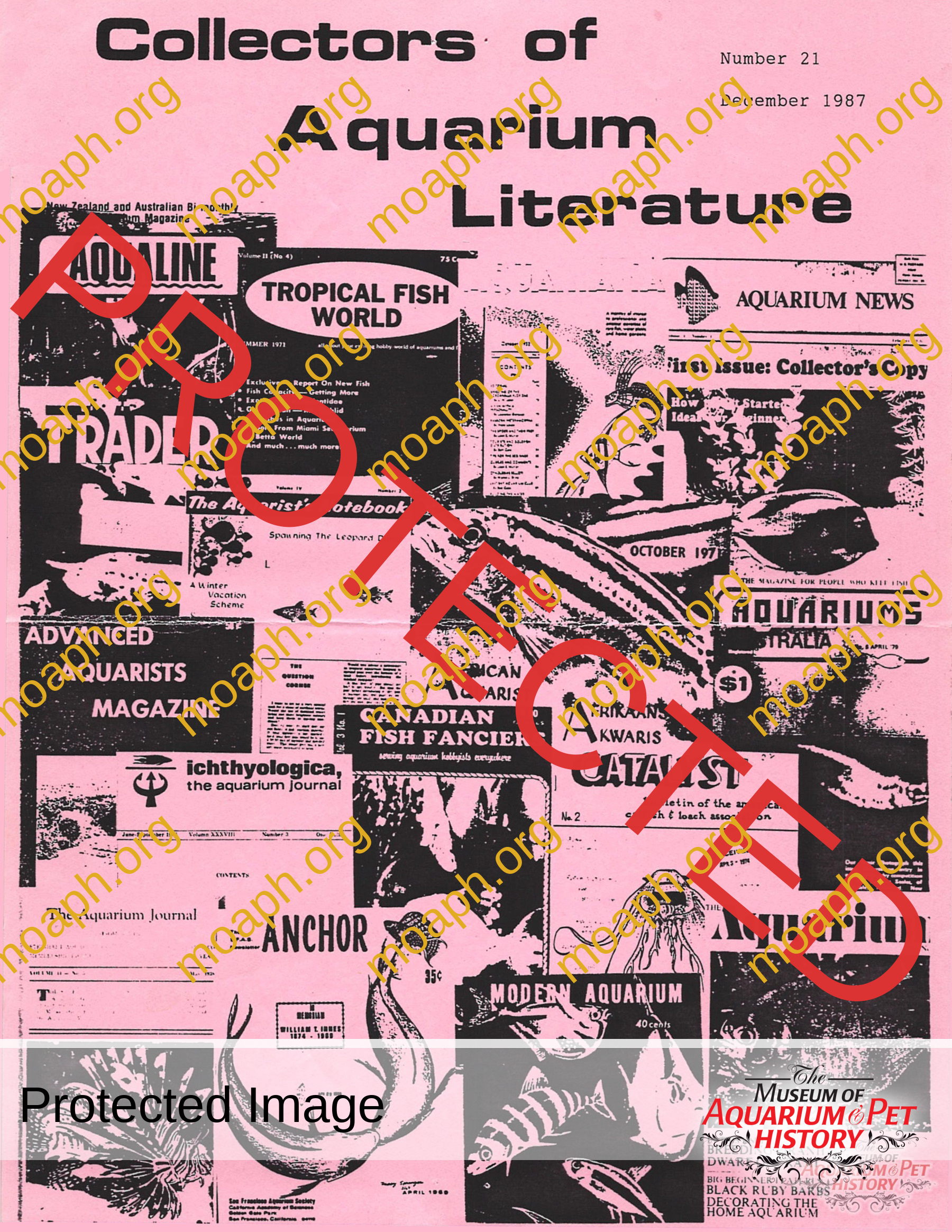 The collectors of aquarium literature was an organization founded by Dave Hopp and Paul Harvey to better organize those who collected vintage aquarium magazines and books. Each issue had articles on aquarium publication history plus articles related to book and magazine collecting in general. This publication ran from May 1983 through June 1994 for a total of 55 issues. (August through November 1988 was a combined issue 25/26 and March through July 1989 was marked 29/30 1989.)