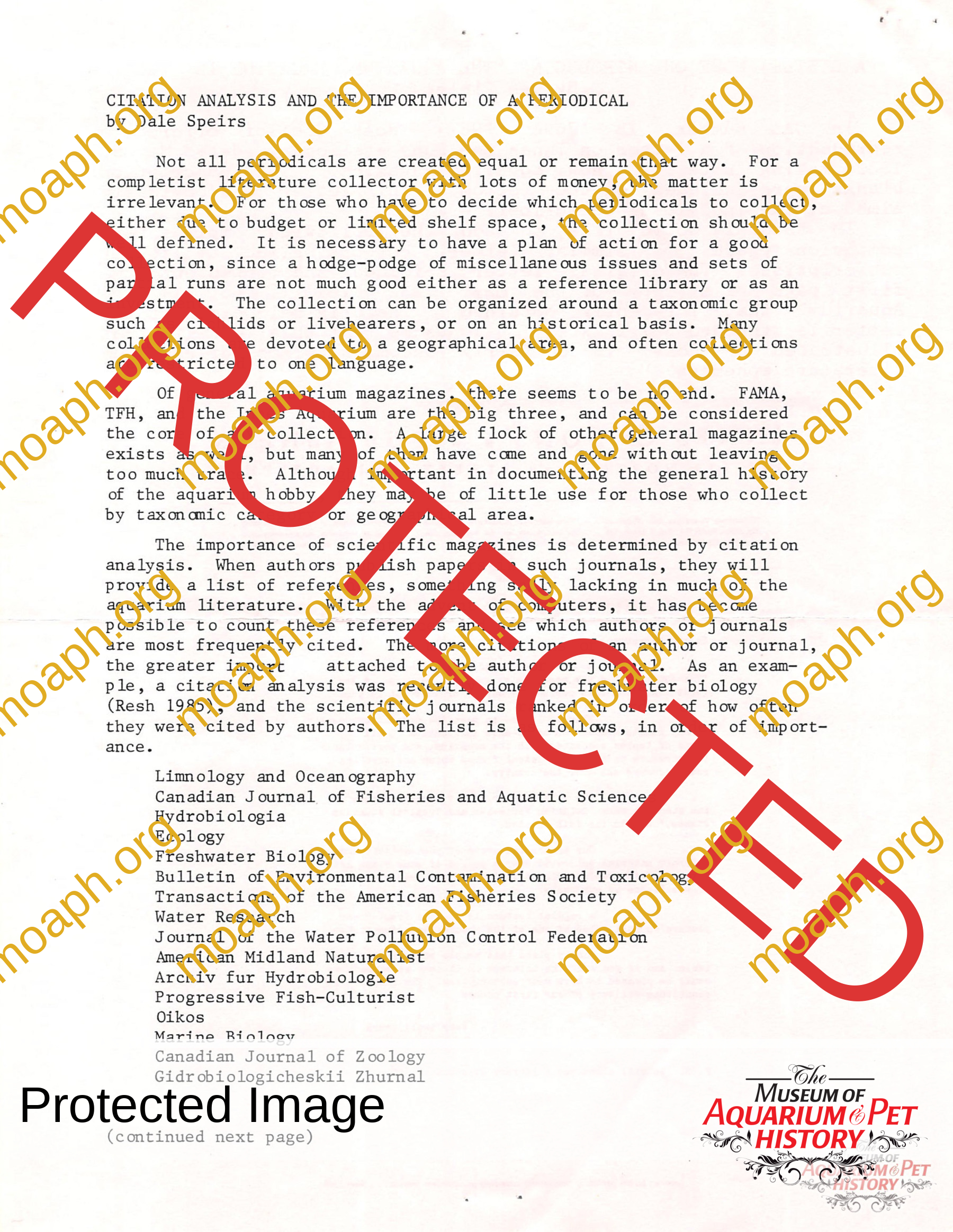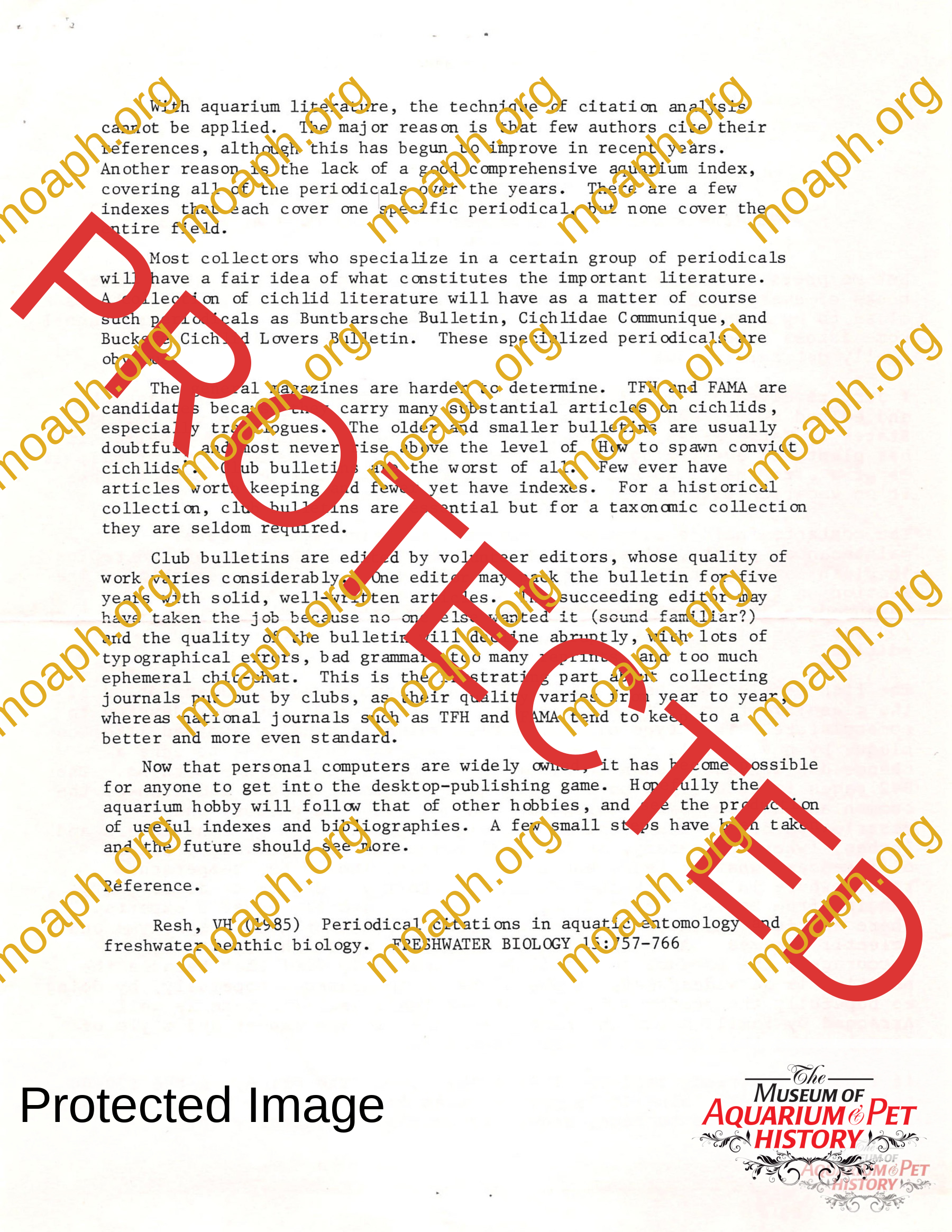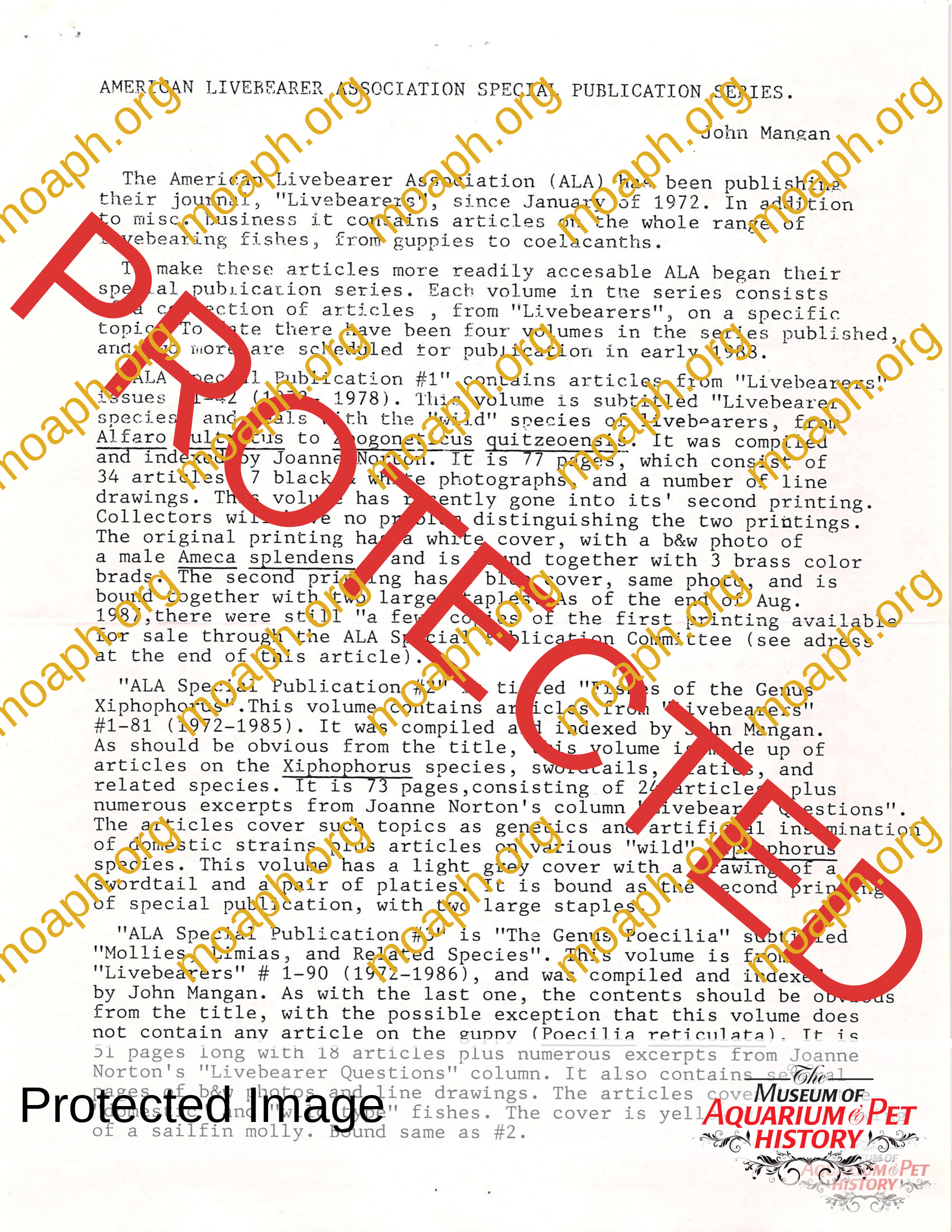The collectors of aquarium literature was an organization founded by Dave Hopp and Paul Harvey to better organize those who collected vintage aquarium magazines and books. Each issue had articles on aquarium publication history plus articles related to book and magazine collecting in general. This publication ran from May 1983 through June 1994 for a total of 55 issues. (August through November 1988 was a combined issue 25/26 and March through July 1989 was marked 29/30 1989.)