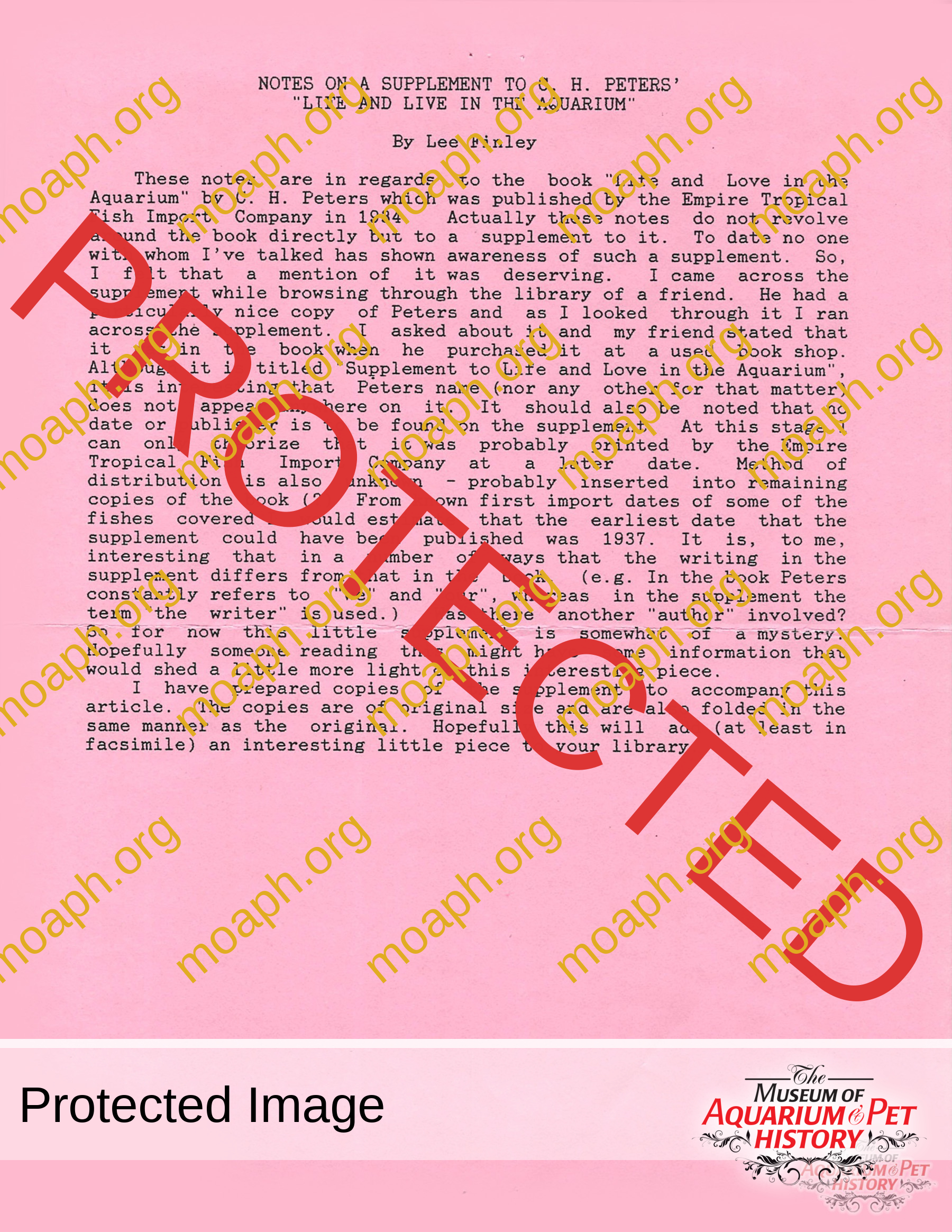 - Notes on a Supplement to C.H. Peters’ “Life and Live in the Aquarium” by Lee Finley
