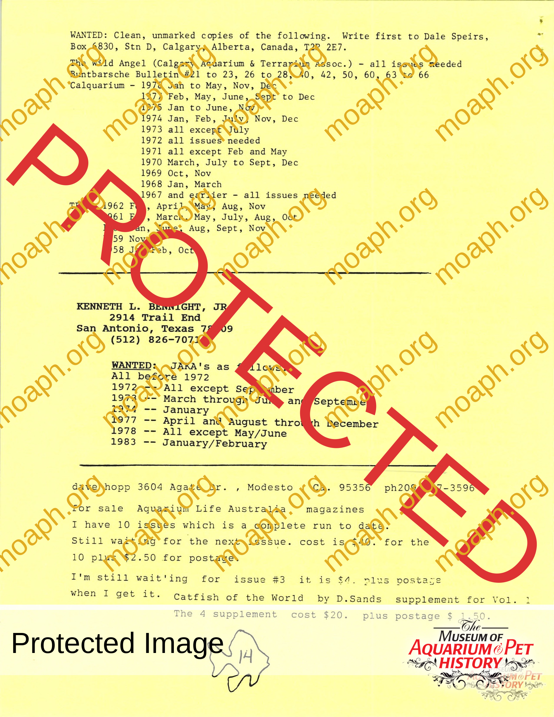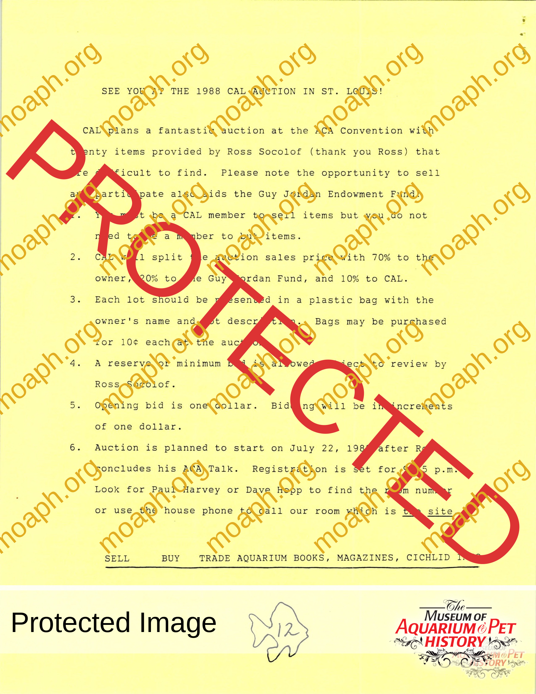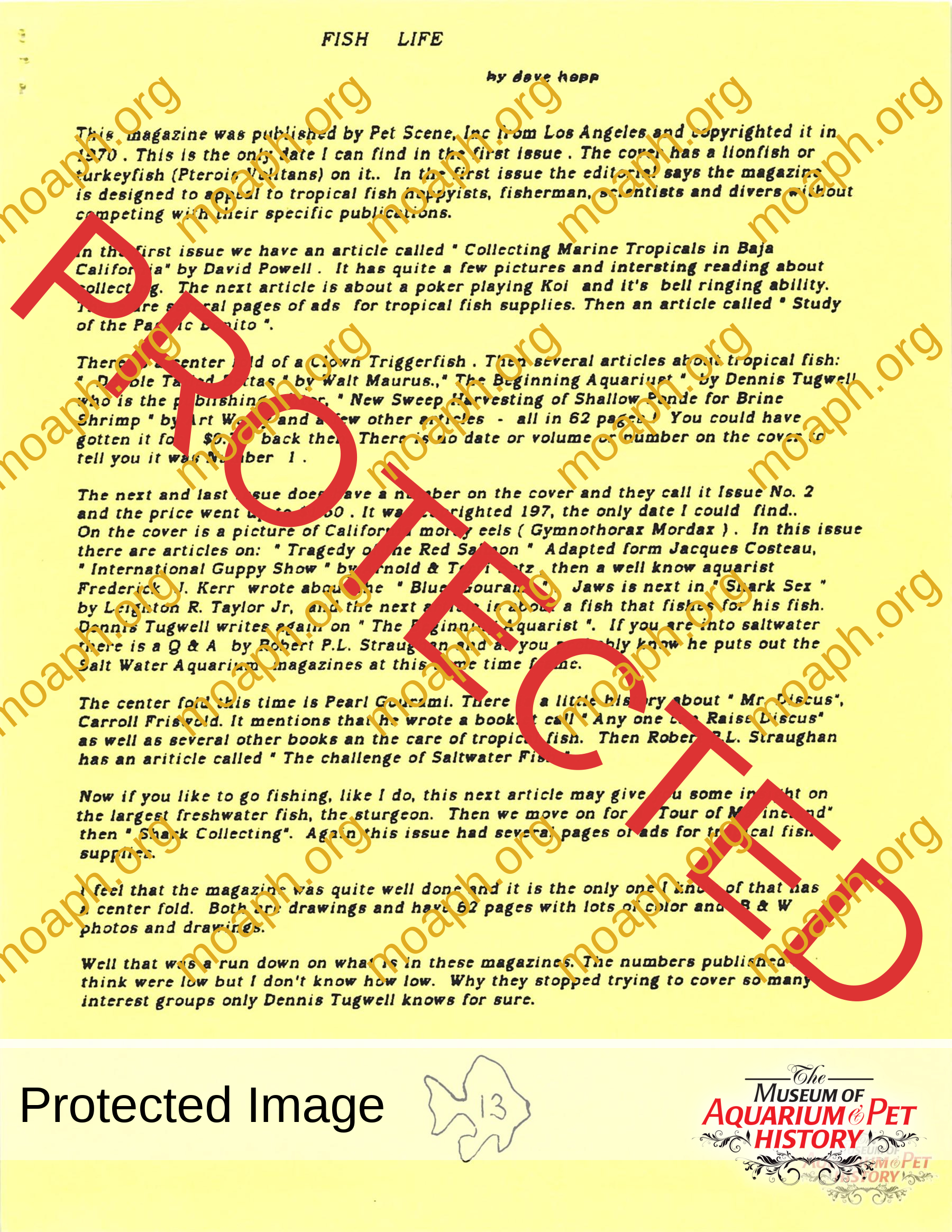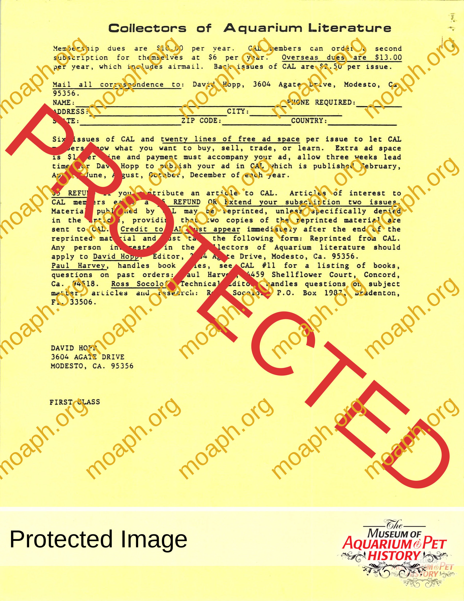 The collectors of aquarium literature was an organization founded by Dave Hopp and Paul Harvey to better organize those who collected vintage aquarium magazines and books. Each issue had articles on aquarium publication history plus articles related to book and magazine collecting in general. This publication ran from May 1983 through June 1994 for a total of 55 issues. (August through November 1988 was a combined issue 25/26 and March through July 1989 was marked 29/30 1989.)