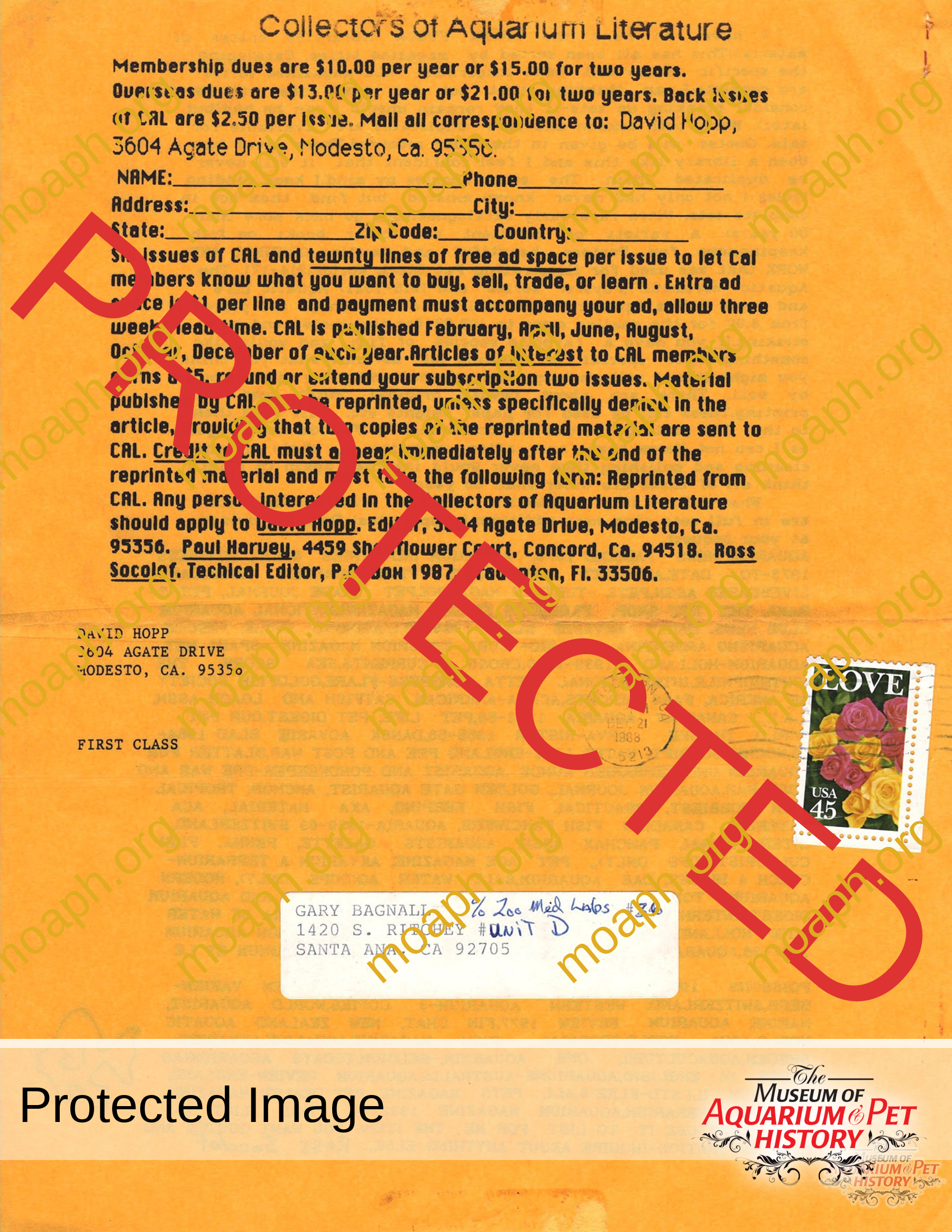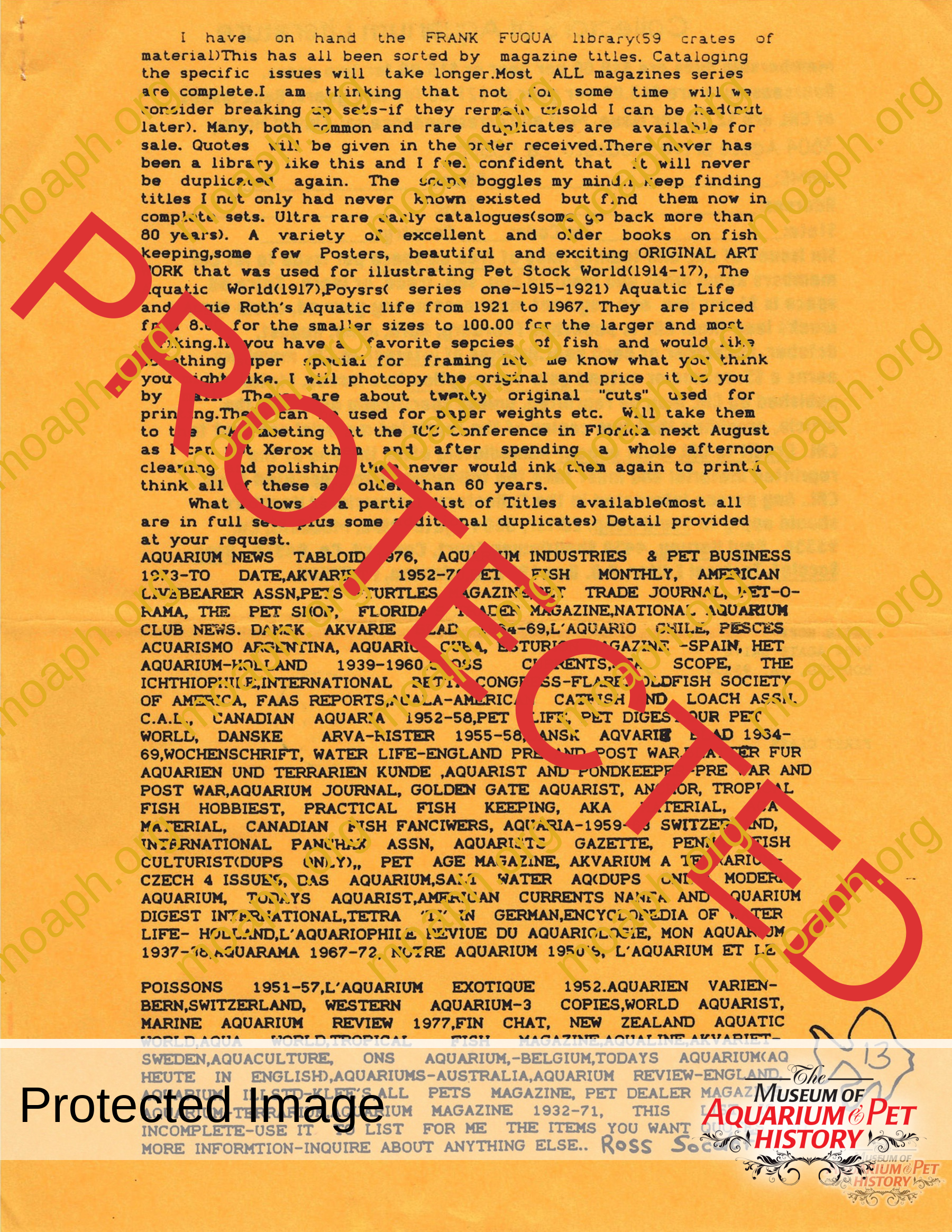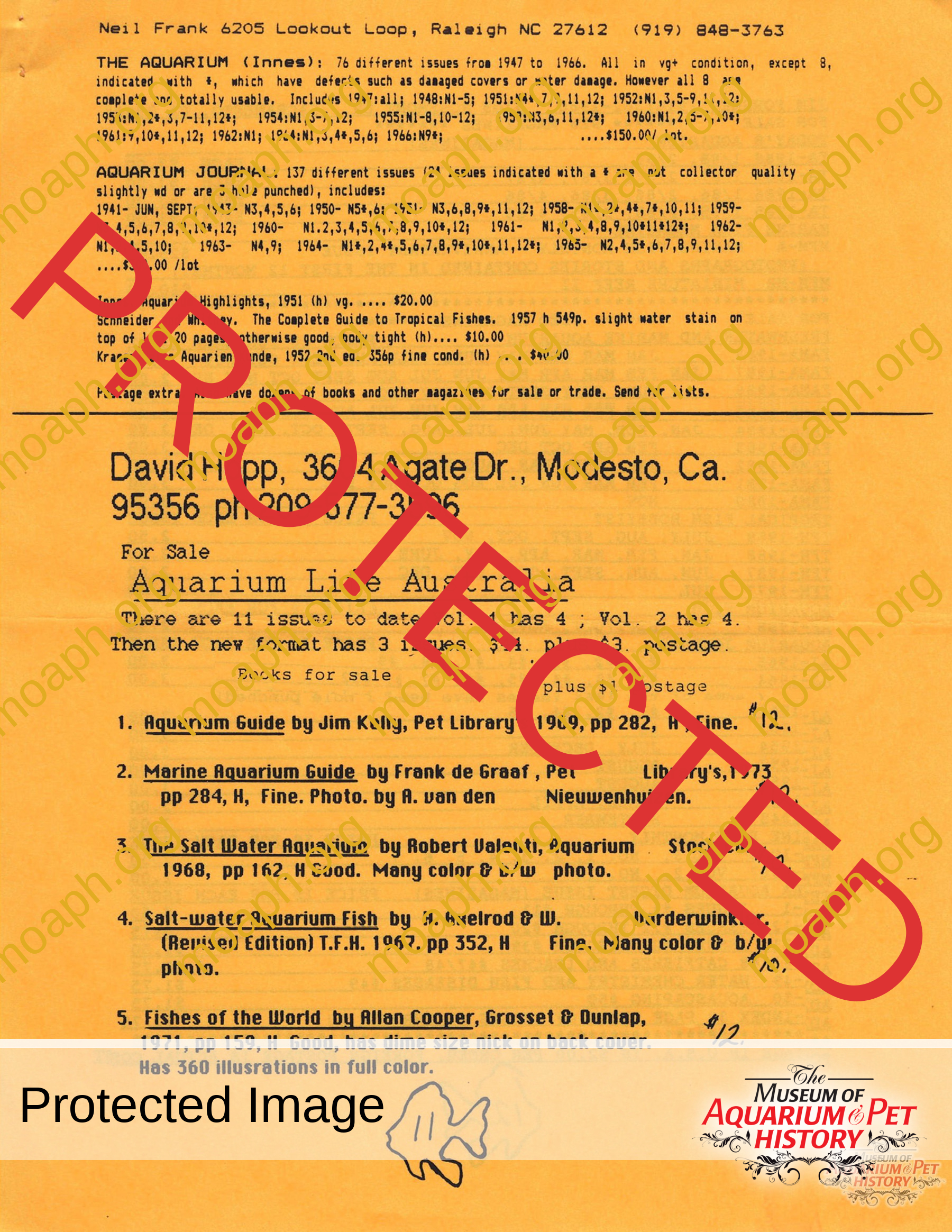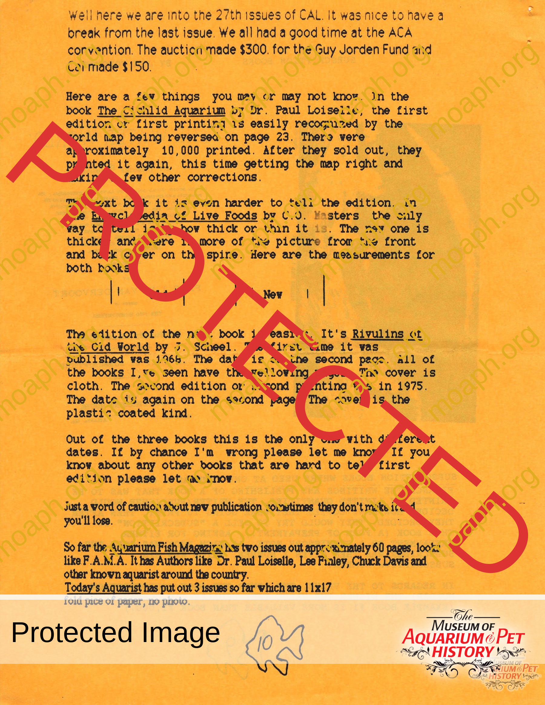 The collectors of aquarium literature was an organization founded by Dave Hopp and Paul Harvey to better organize those who collected vintage aquarium magazines and books. Each issue had articles on aquarium publication history plus articles related to book and magazine collecting in general. This publication ran from May 1983 through June 1994 for a total of 55 issues. (August through November 1988 was a combined issue 25/26 and March through July 1989 was marked 29/30 1989.)