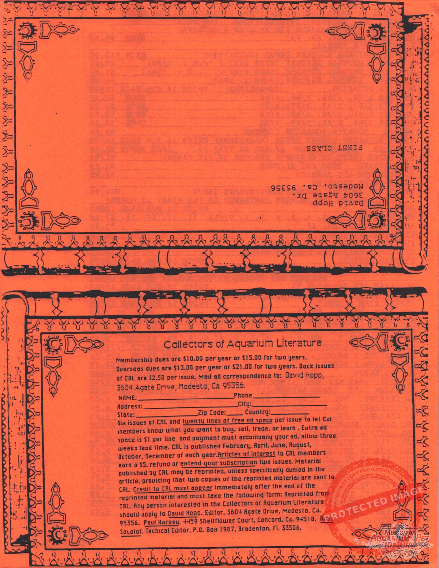 The collectors of aquarium literature was an organization founded by Dave Hopp and Paul Harvey to better organize those who collected vintage aquarium magazines and books. Each issue had articles on aquarium publication history plus articles related to book and magazine collecting in general. This publication ran from May 1983 through June 1994 for a total of 55 issues. (August through November 1988 was a combined issue 25/26 and March through July 1989 was marked 29/30 1989.)
