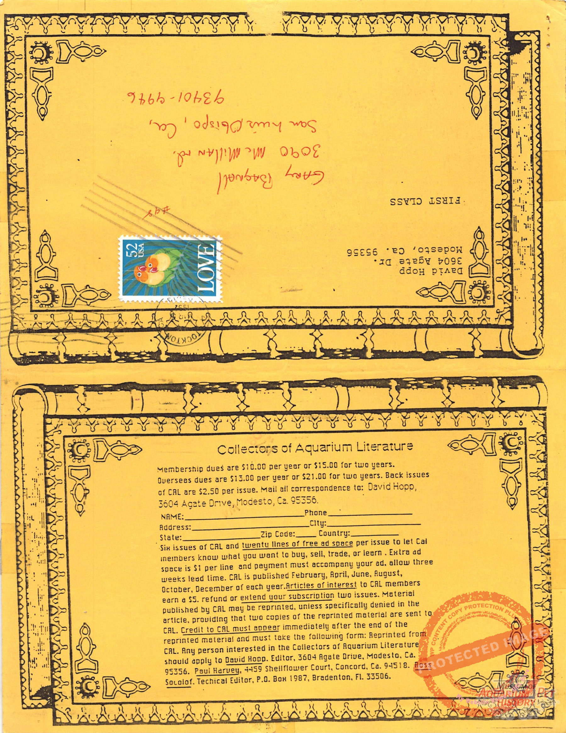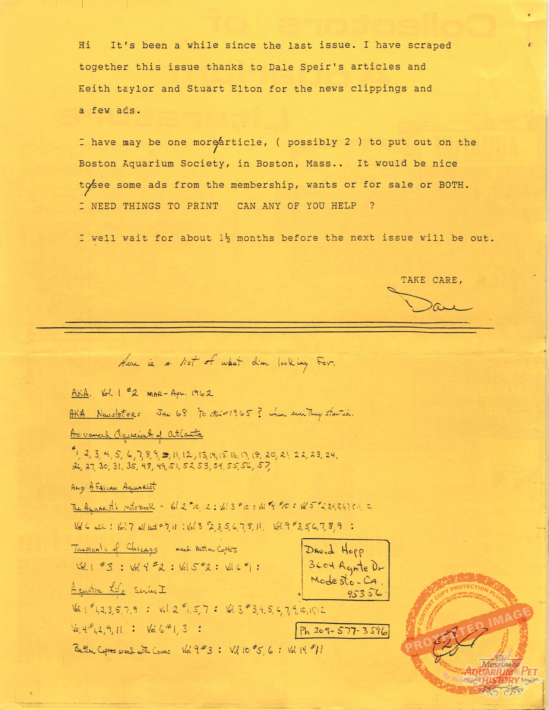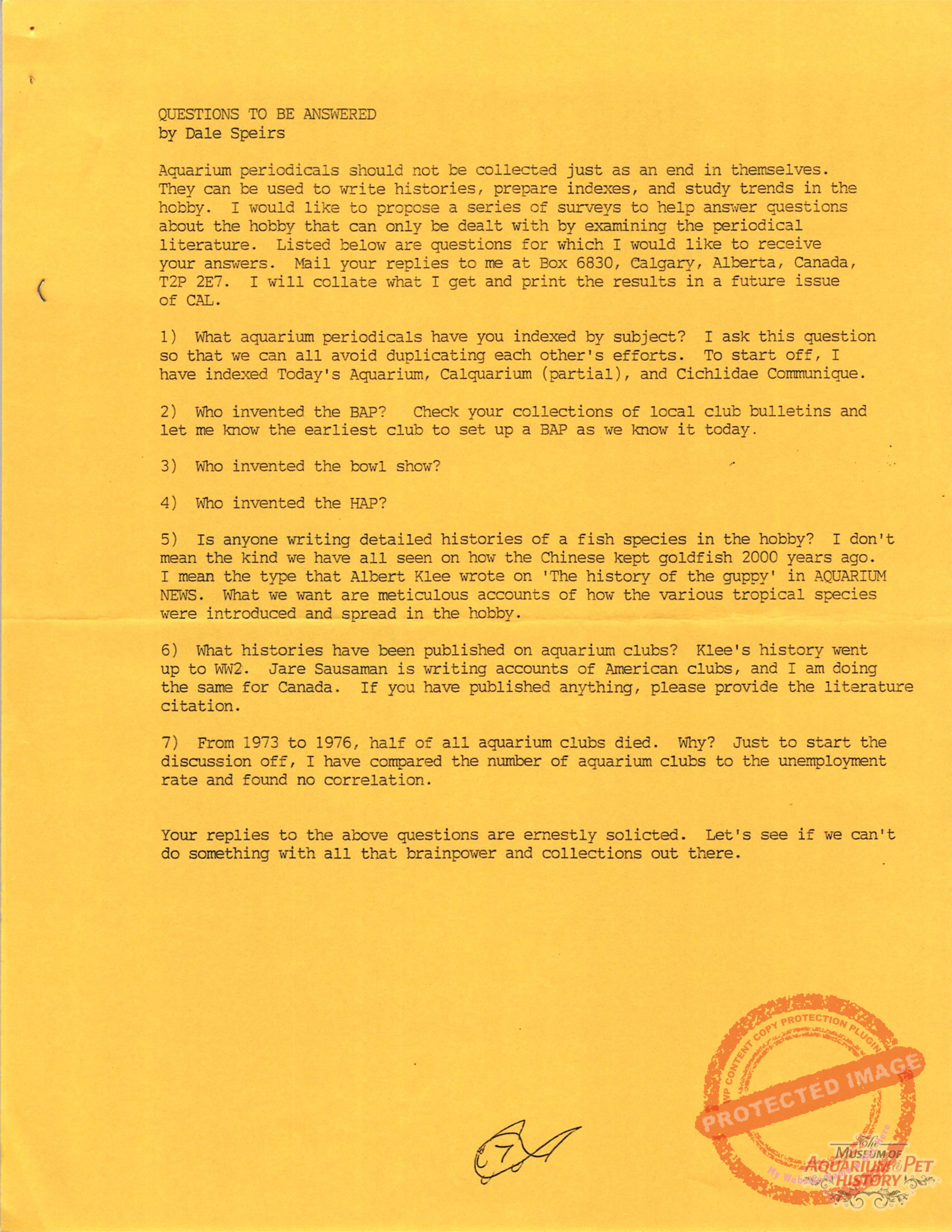 The collectors of aquarium literature was an organization founded by Dave Hopp and Paul Harvey to better organize those who collected vintage aquarium magazines and books. Each issue had articles on aquarium publication history plus articles related to book and magazine collecting in general. This publication ran from May 1983 through June 1994 for a total of 55 issues. (August through November 1988 was a combined issue 25/26 and March through July 1989 was marked 29/30 1989.)