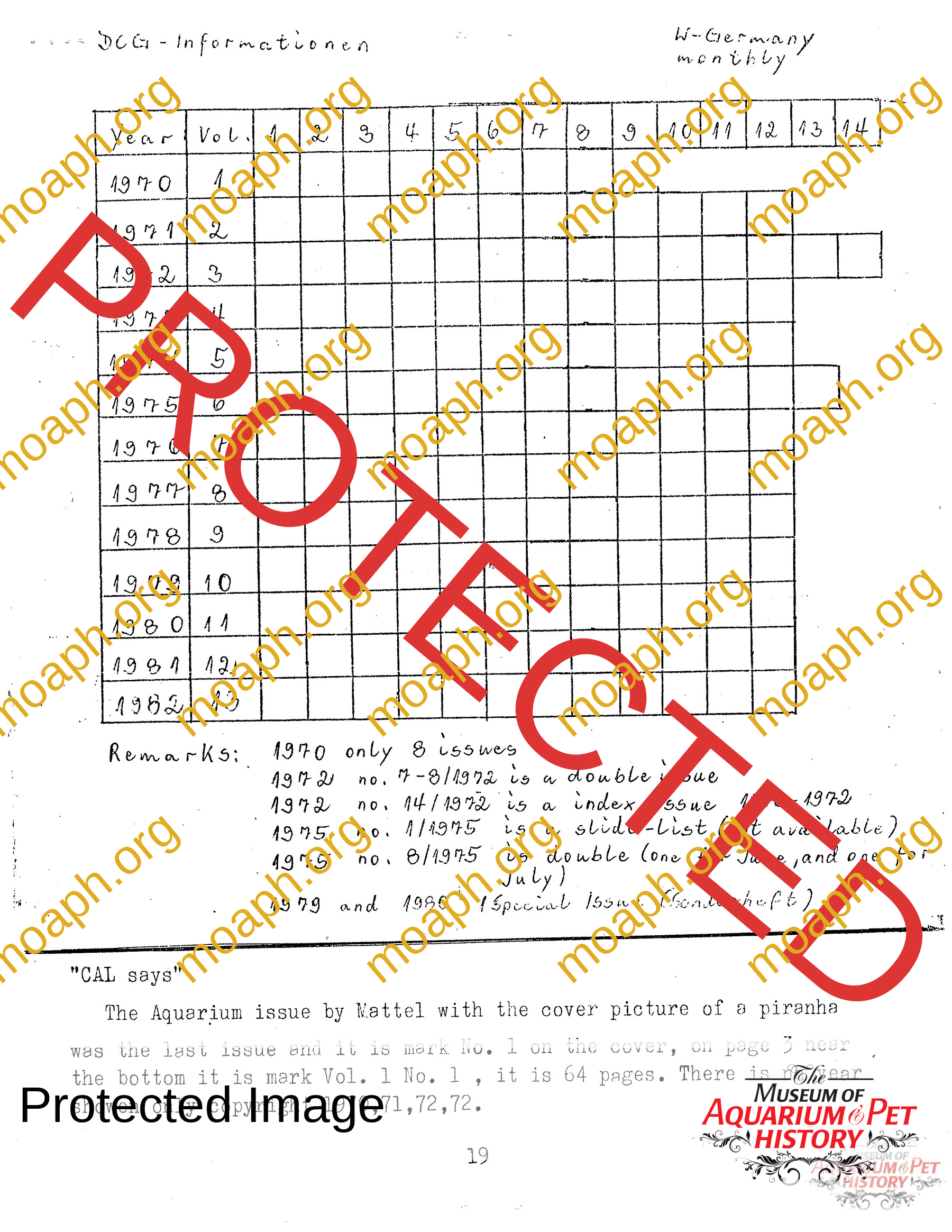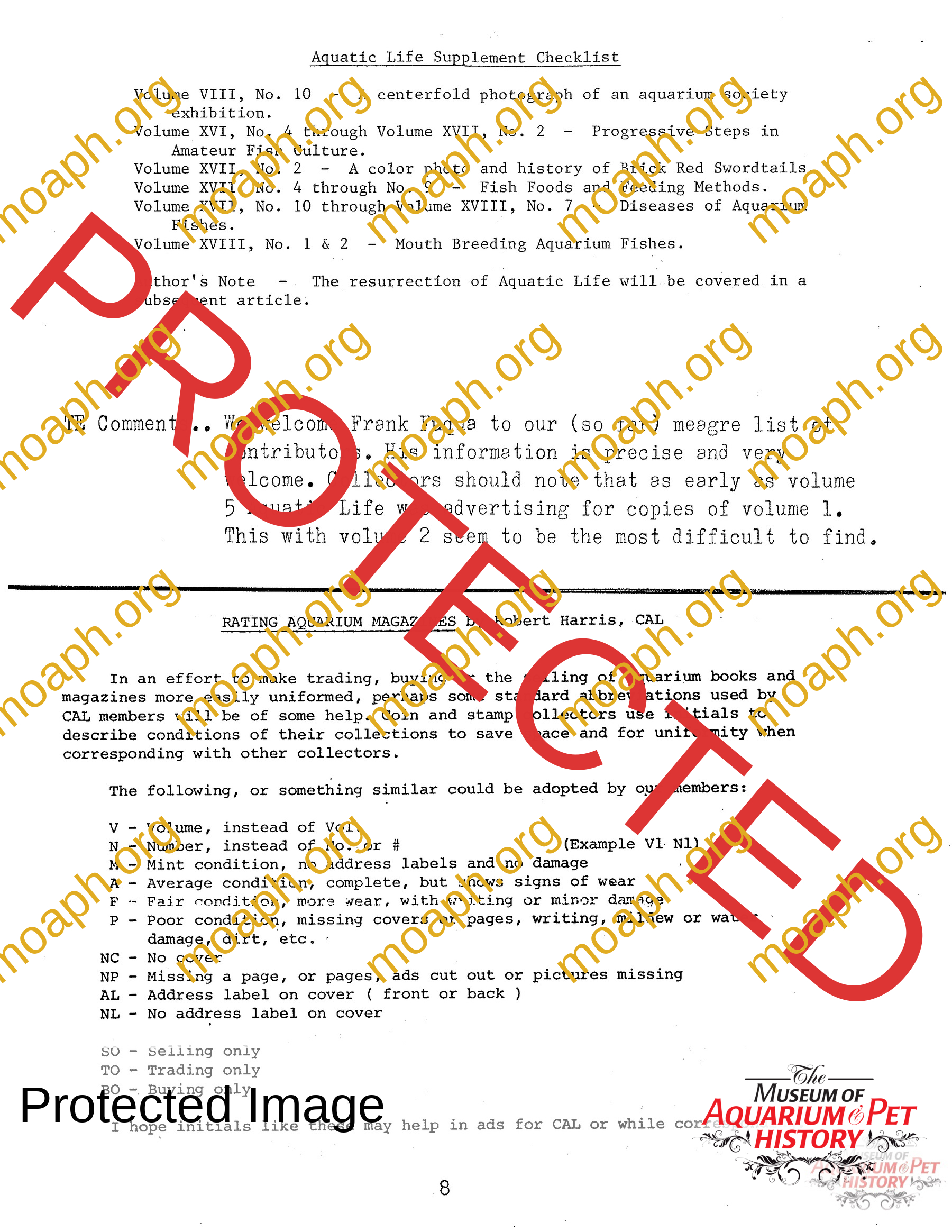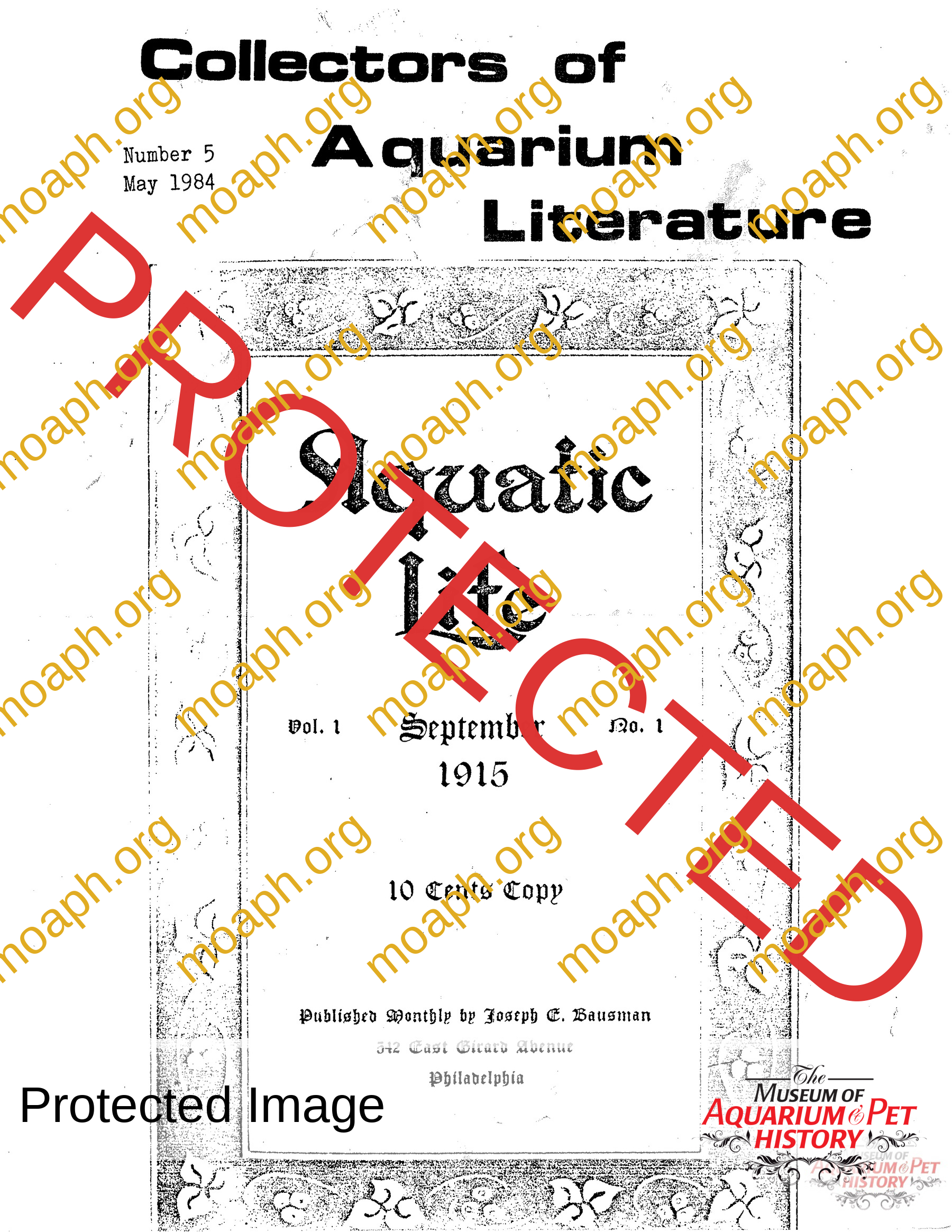 The collectors of aquarium literature was an organization founded by Dave Hopp and Paul Harvey to better organize those who collected vintage aquarium magazines and books. Each issue had articles on aquarium publication history plus articles related to book and magazine collecting in general. This publication ran from May 1983 through June 1994 for a total of 55 issues. (August through November 1988 was a combined issue 25/26 and March through July 1989 was marked 29/30 1989.)